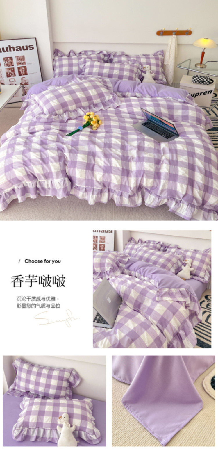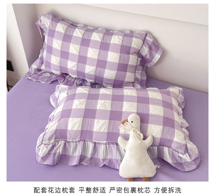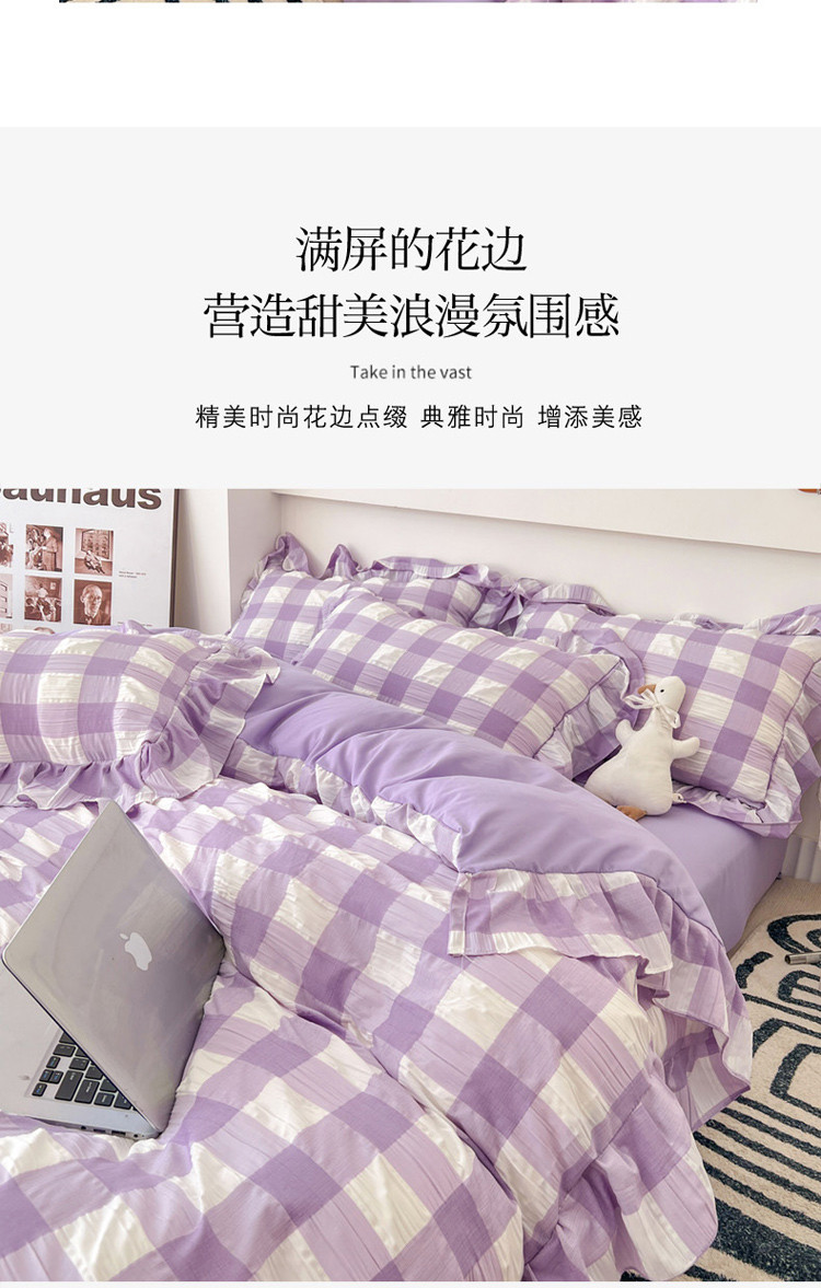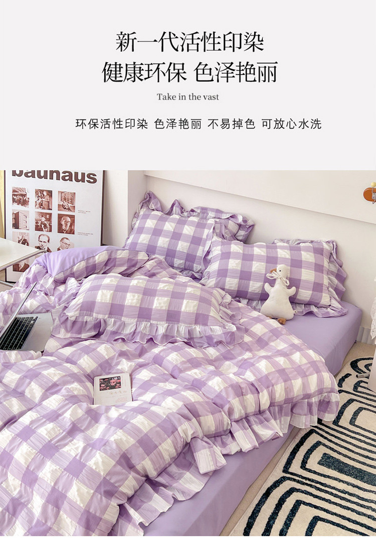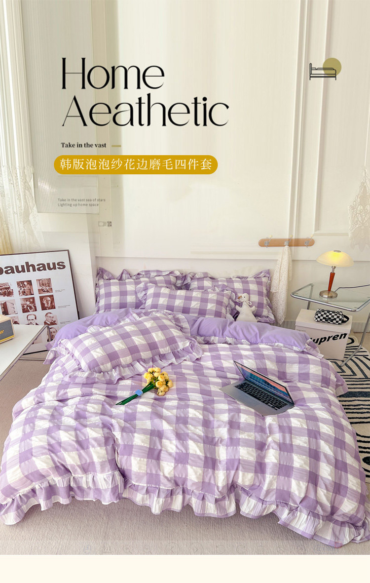 花伞2023JK风双色泡泡纱大花边磨毛四件套香芋啵啵