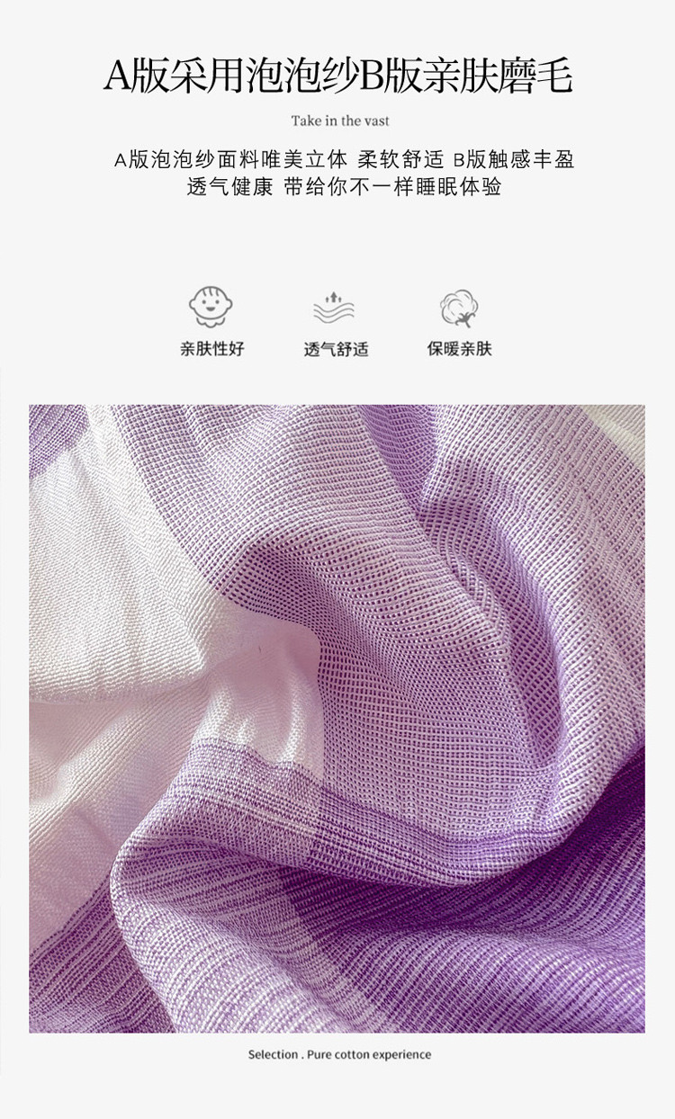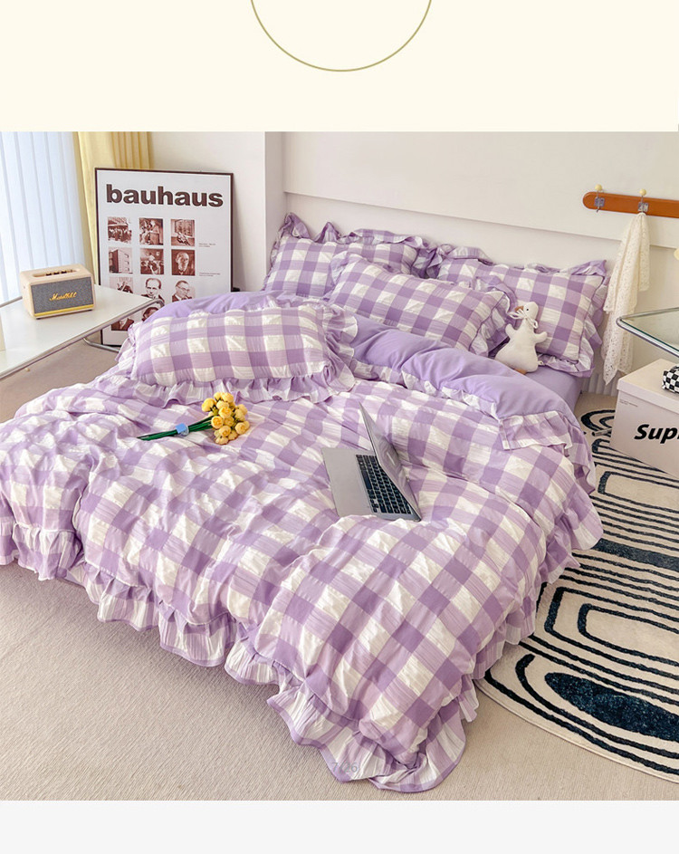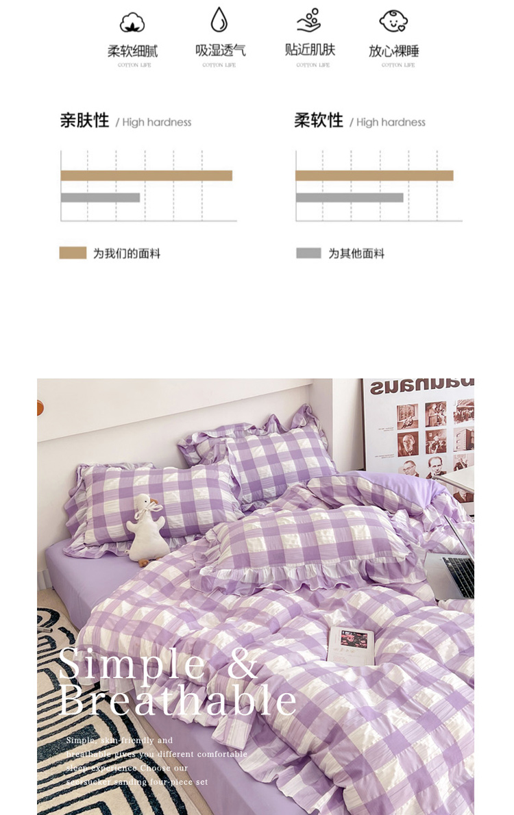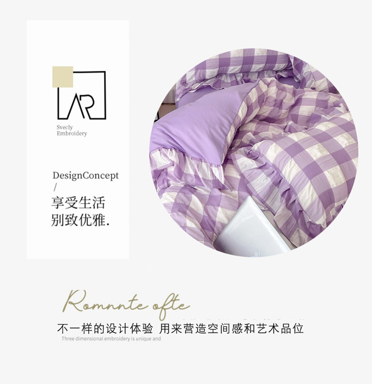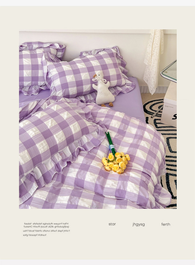花伞2023JK风双色泡泡纱大花边磨毛四件套香芋啵啵
