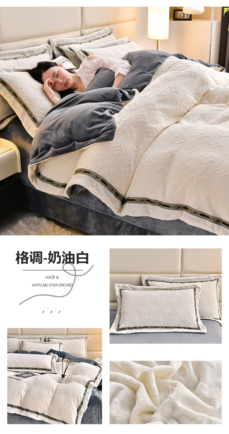 妮恒美 2023新款牛奶绒雕花压线款四件套 格调-奶油白