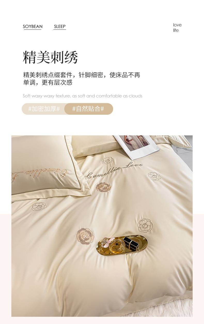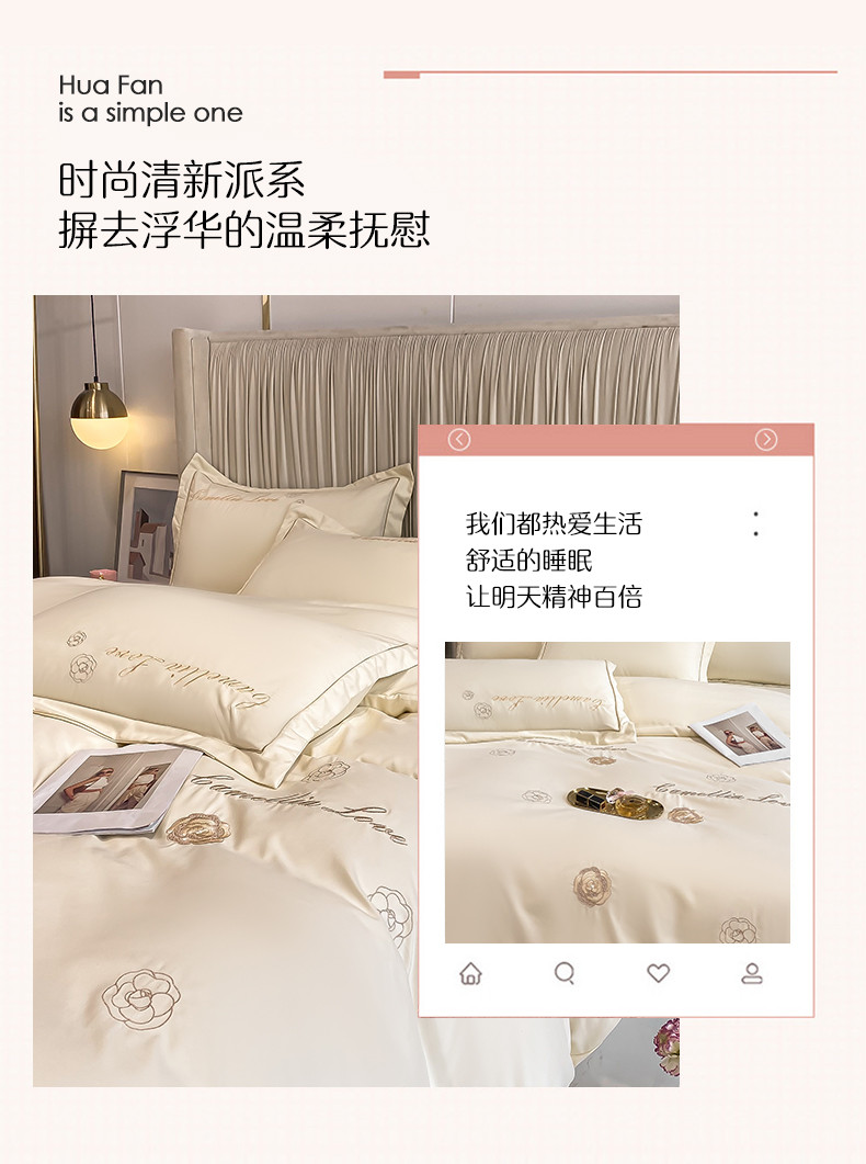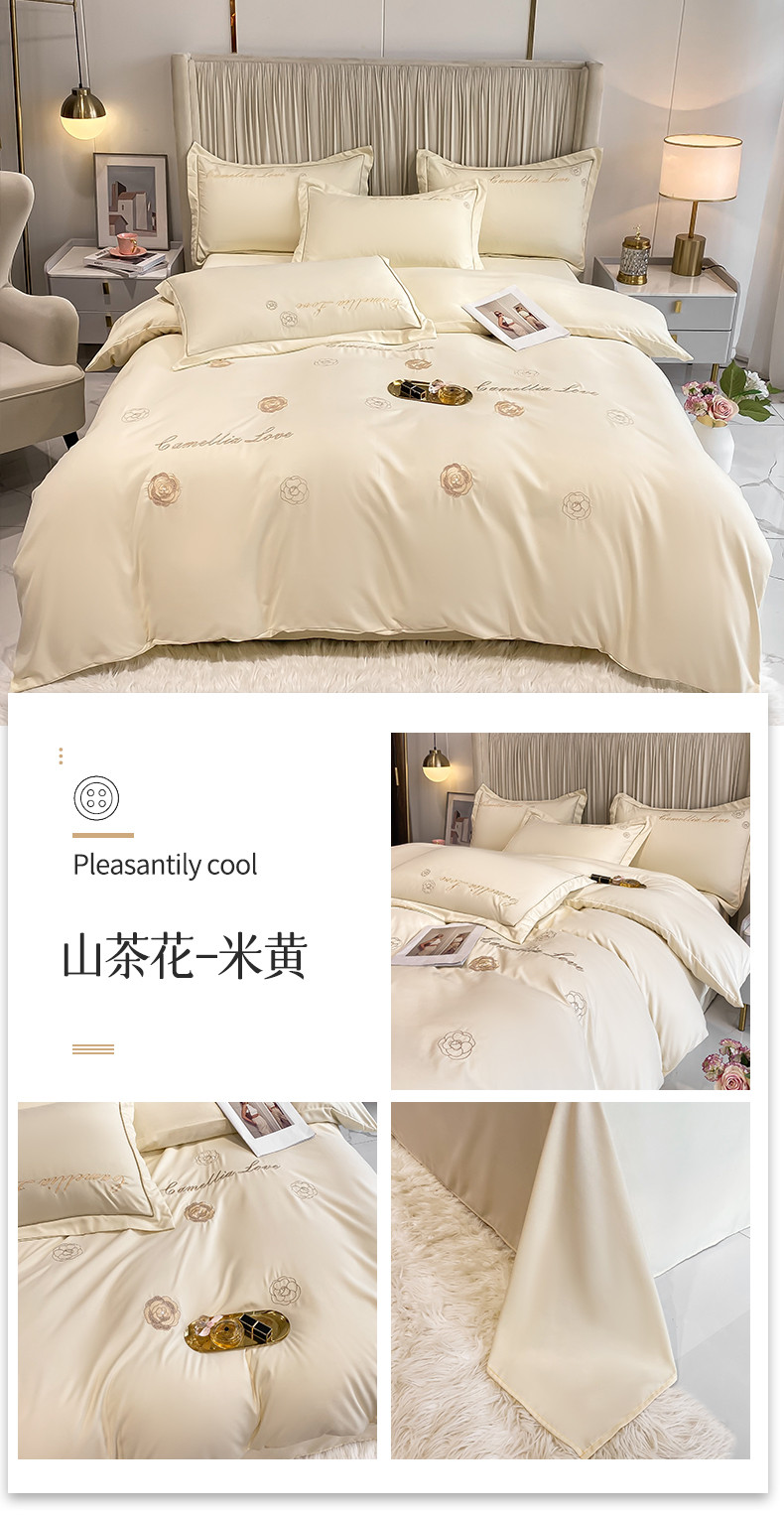 商品名称:涵宸家纺 2023新款水洗氧棉-山茶花系列四件套 山茶花-米黄