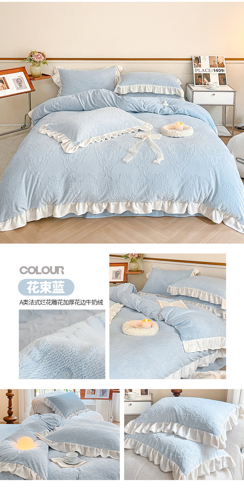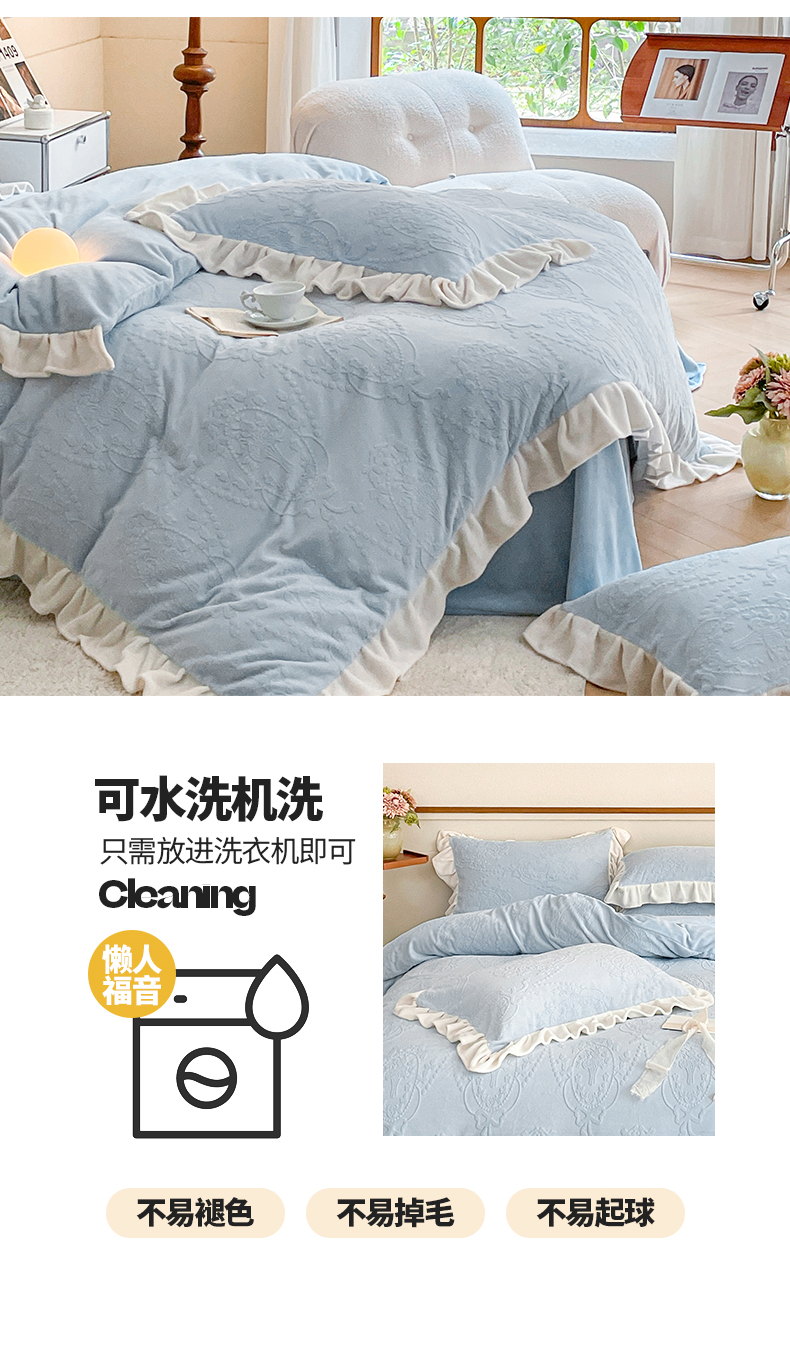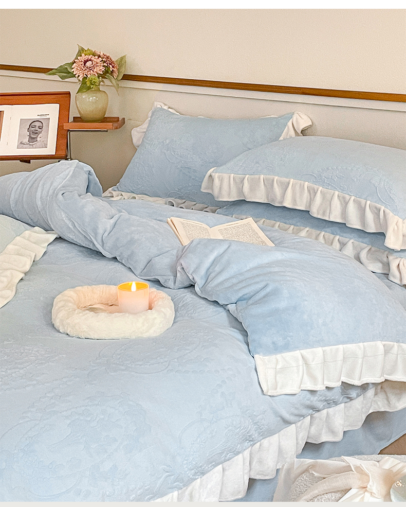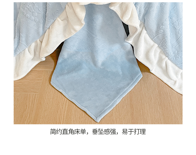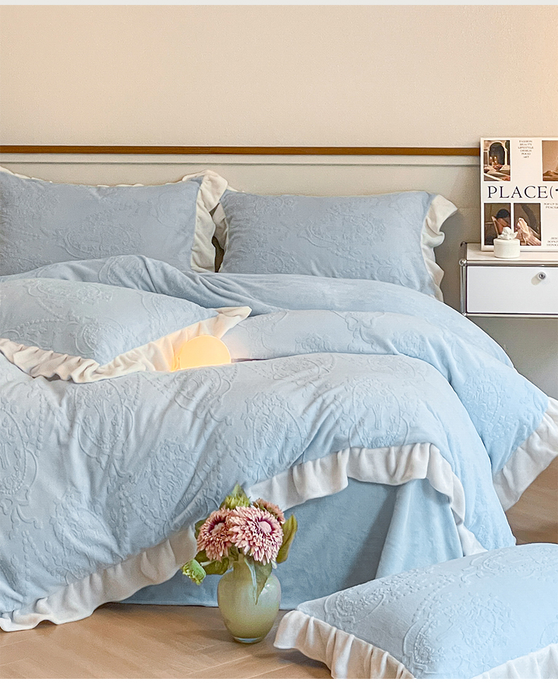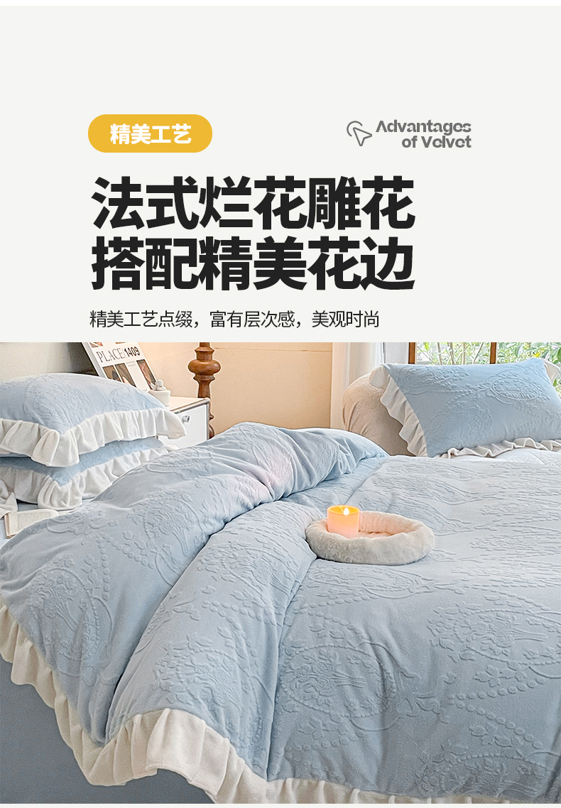 商品名称:桃子家居 2023新款A类高克重230克法式烂花雕花提花加厚韩版花边牛奶绒四件套 绒烂花-花束蓝
