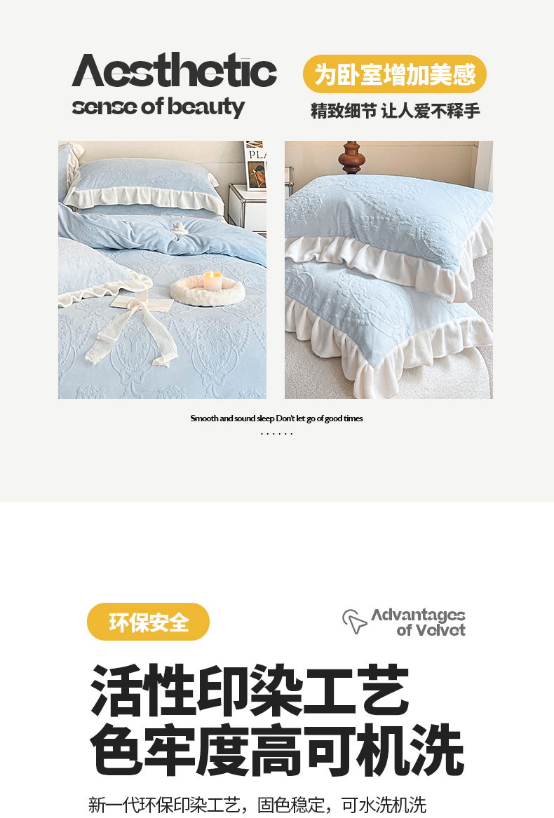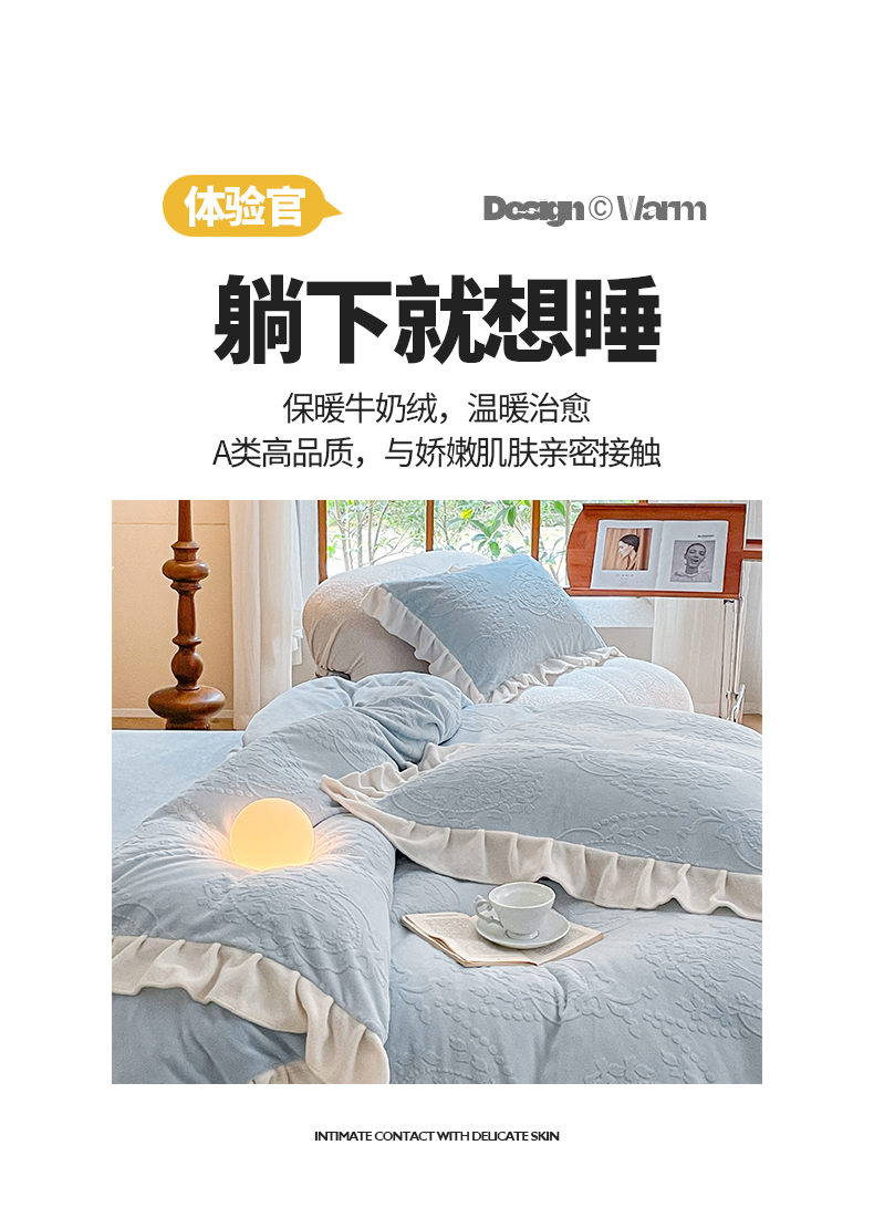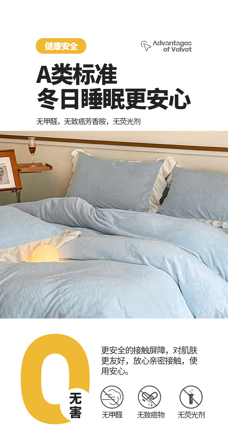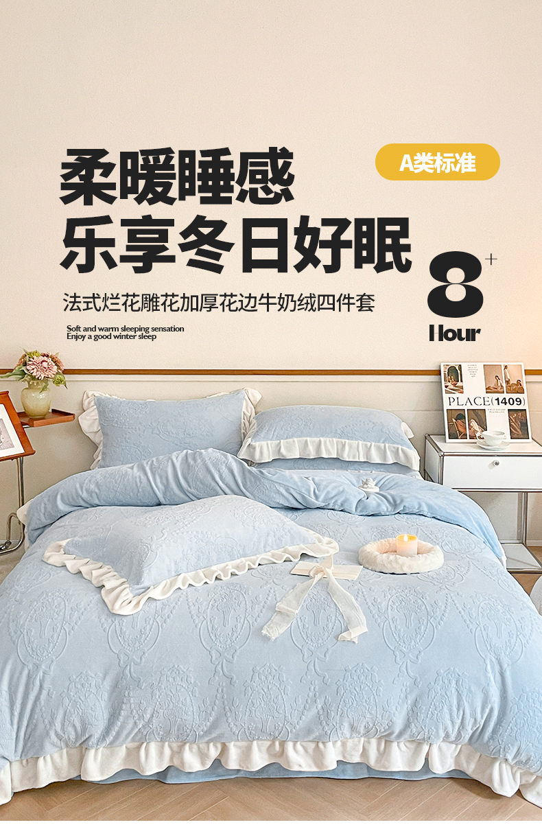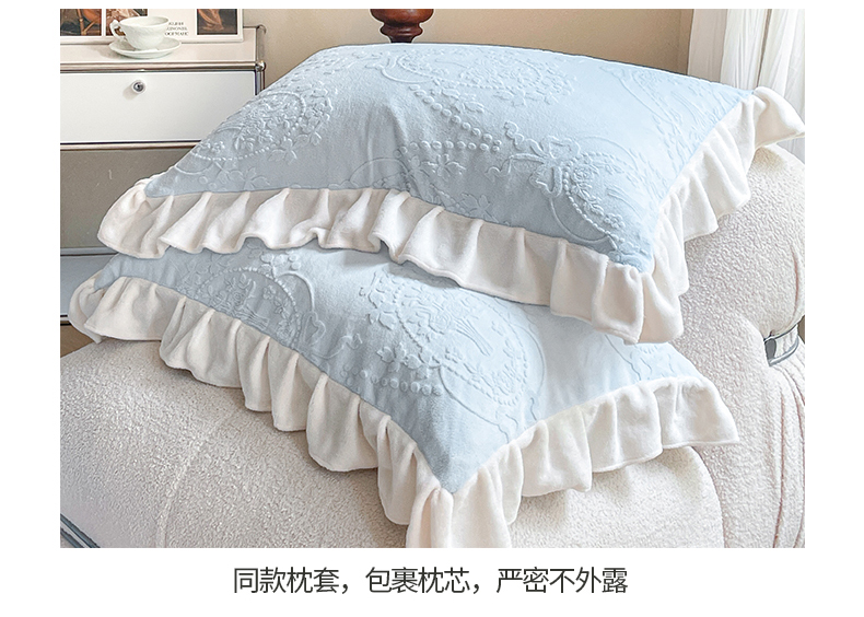 商品名称:桃子家居 2023新款A类高克重230克法式烂花雕花提花加厚韩版花边牛奶绒四件套 绒烂花-花束蓝