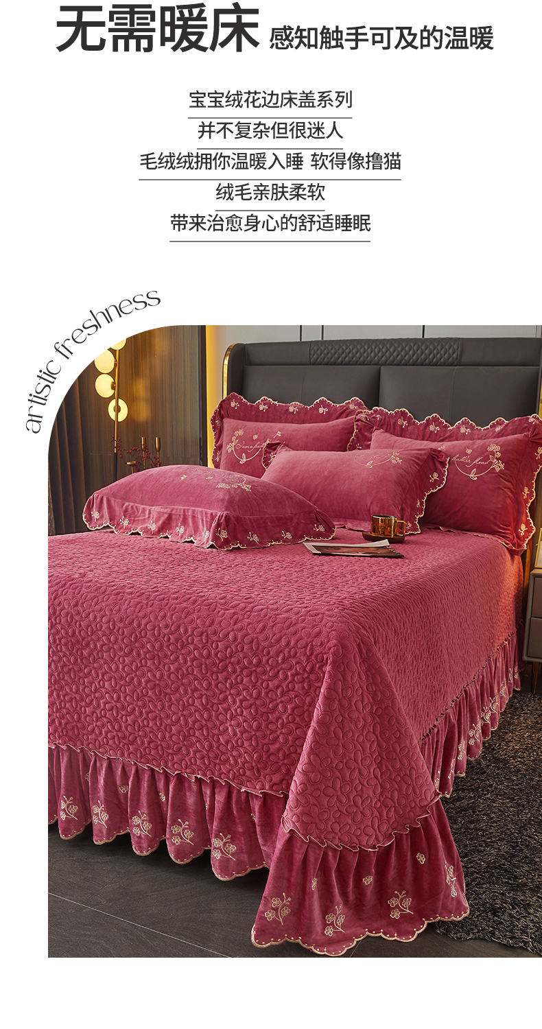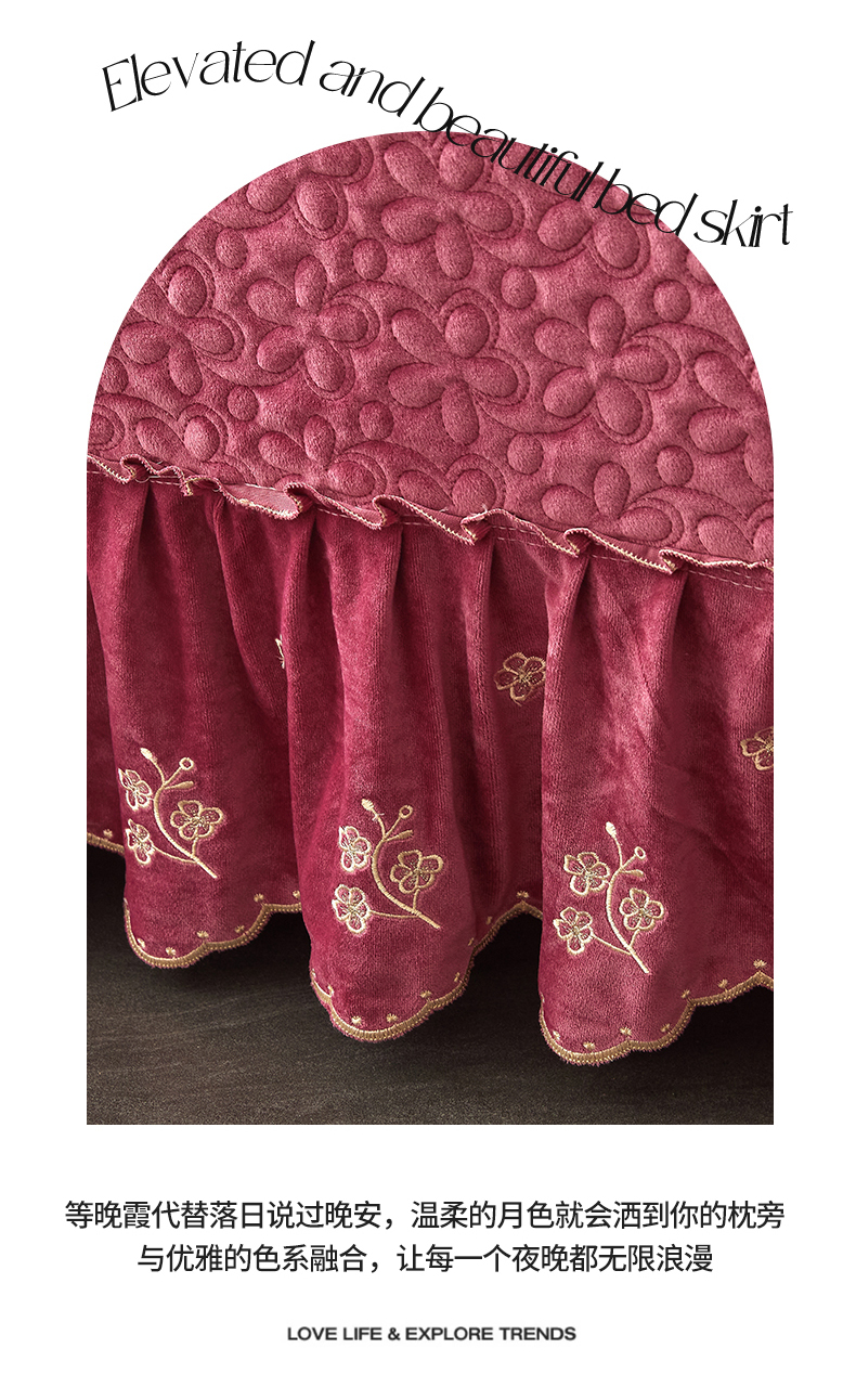 (总)恒爱 2022秋冬水晶绒翩翩花舞夹棉单床裙,大红色,豆沙红,橄榄绿,公主粉,桔色,咖啡色,孔雀绿,拉菲红,罗兰紫,玫红色,美人玉,米白色,米驼色,抹茶绿,浅灰色,紫色