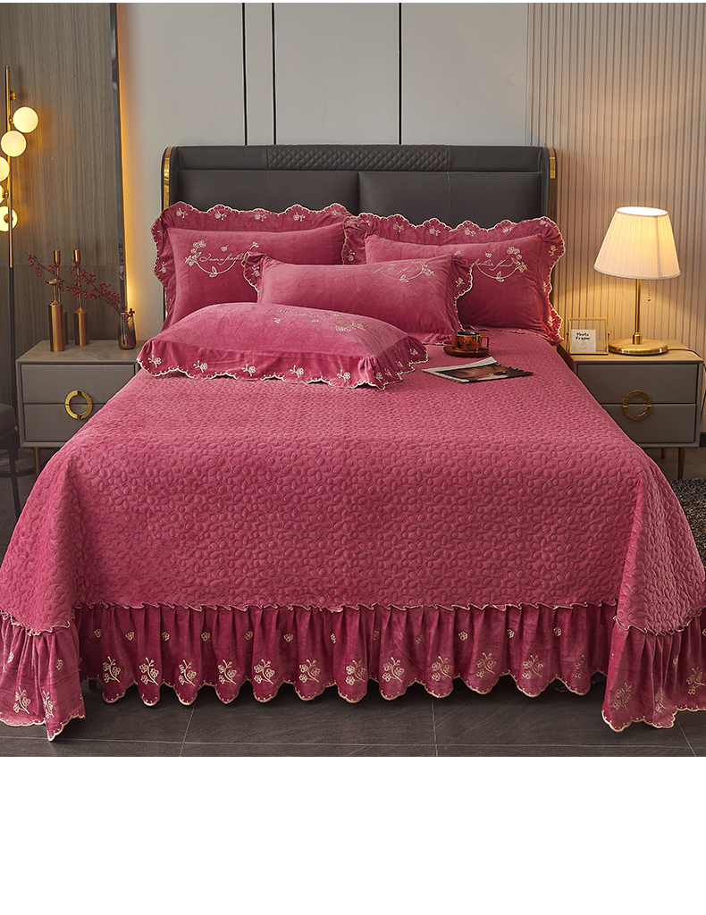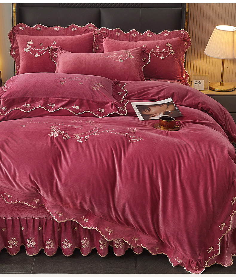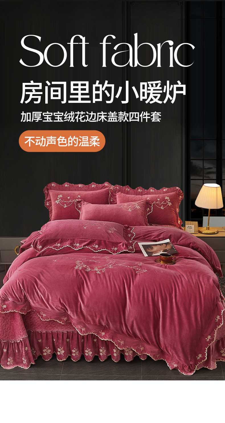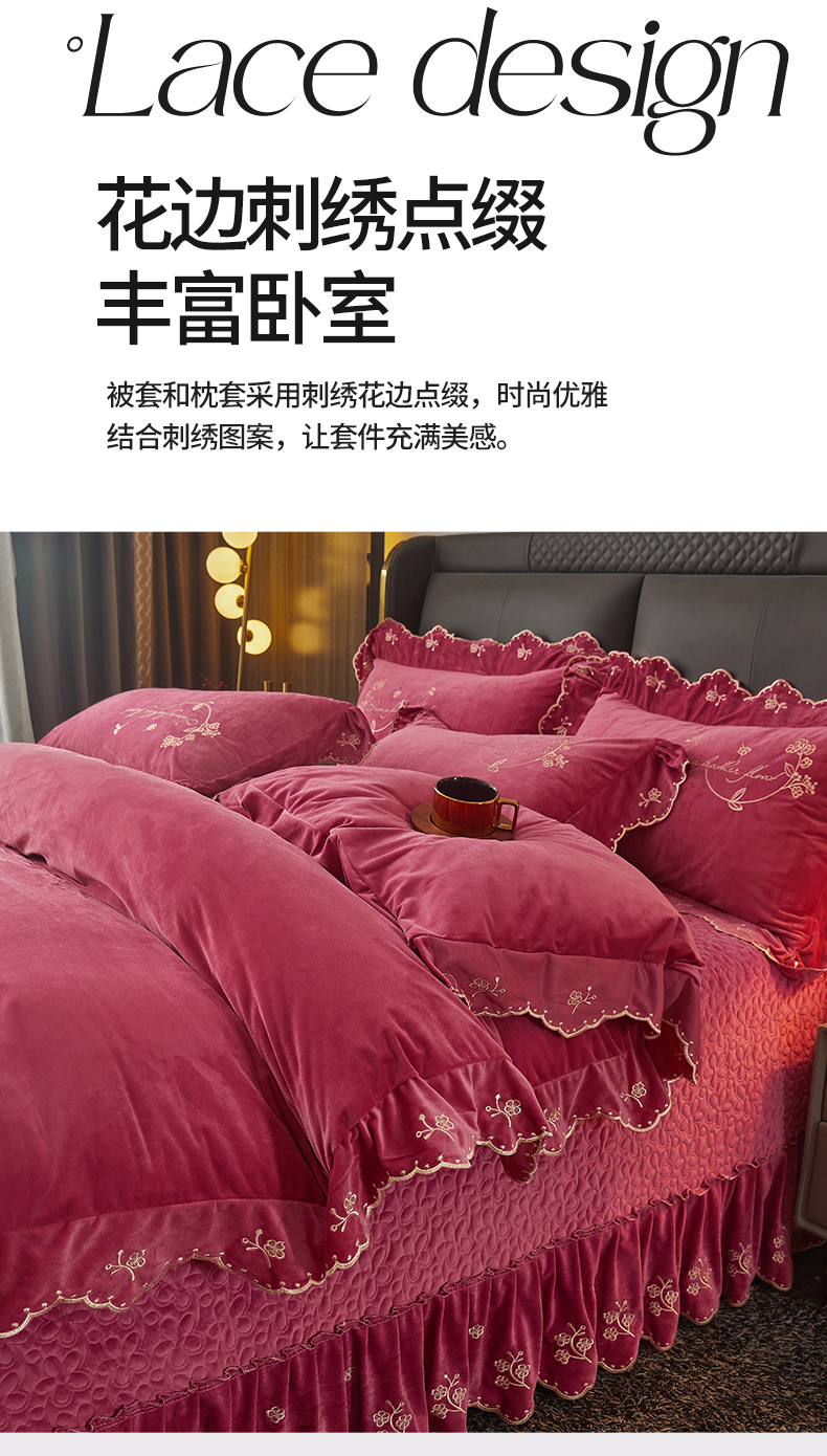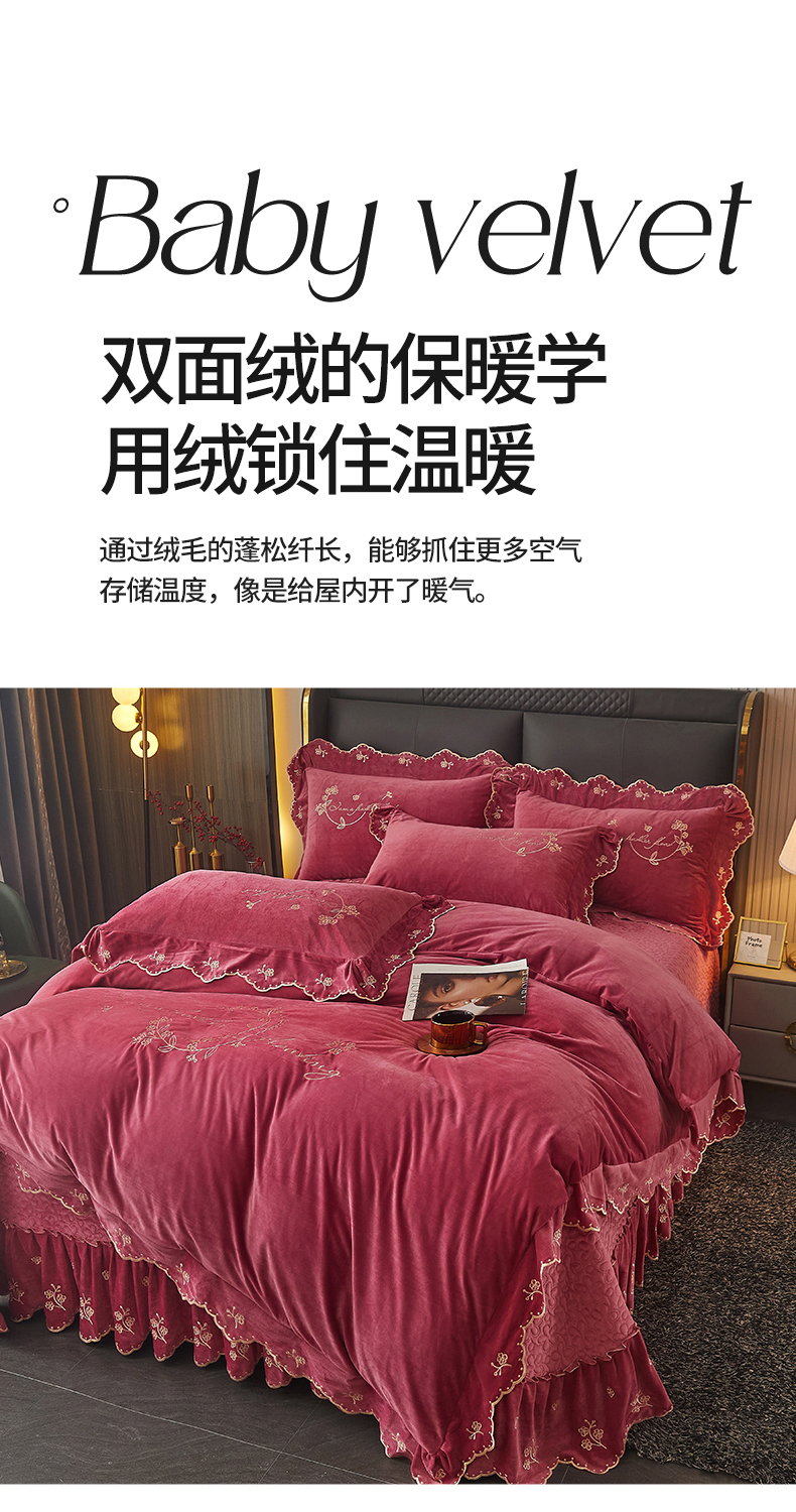 (总)恒爱 2022秋冬水晶绒翩翩花舞夹棉床裙四件套,大红色,豆沙红,橄榄绿,公主粉,桔色,咖啡色,孔雀绿,拉菲红,罗兰紫,玫红色,美人玉,米白色,米驼色,抹茶绿,浅灰色,紫色
