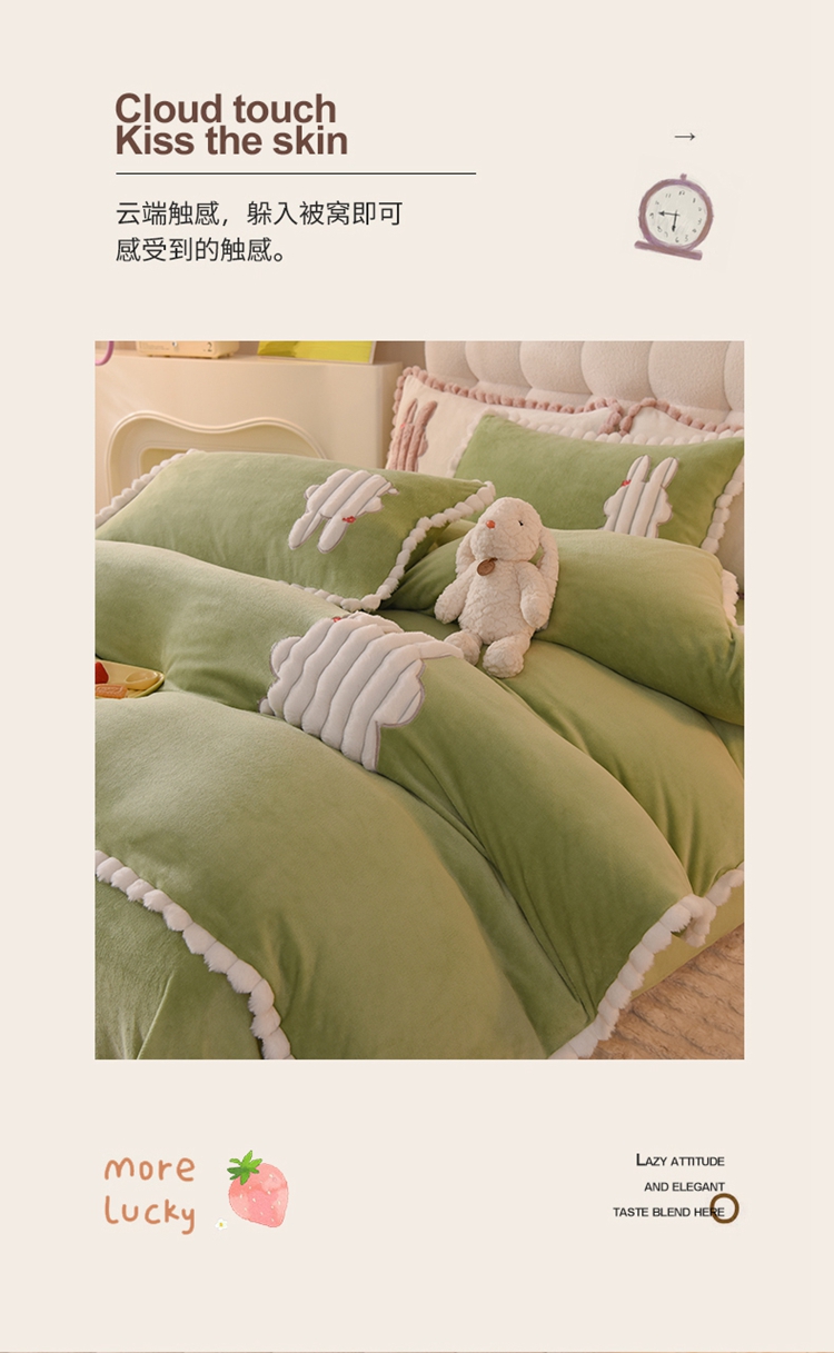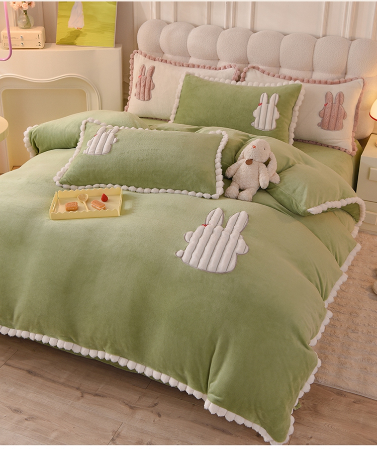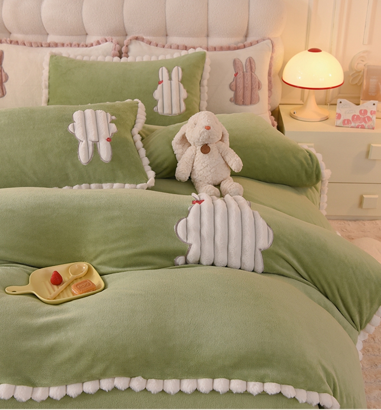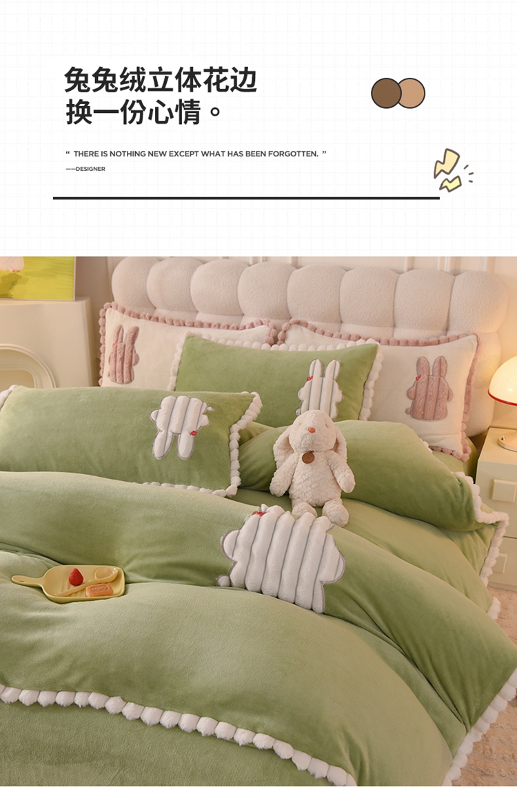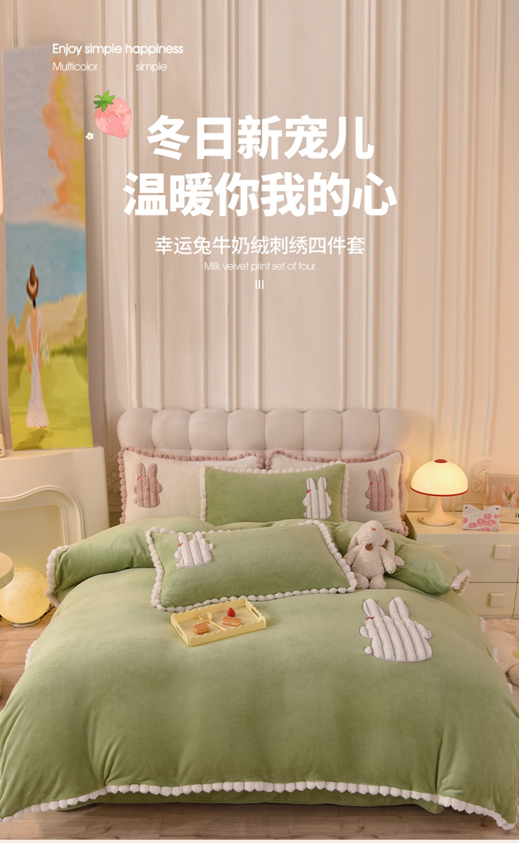 艾米家居 2023新款秋冬牛奶绒刺绣花边四件套-幸运兔 果绿