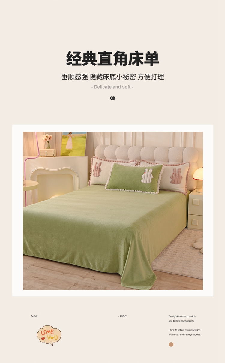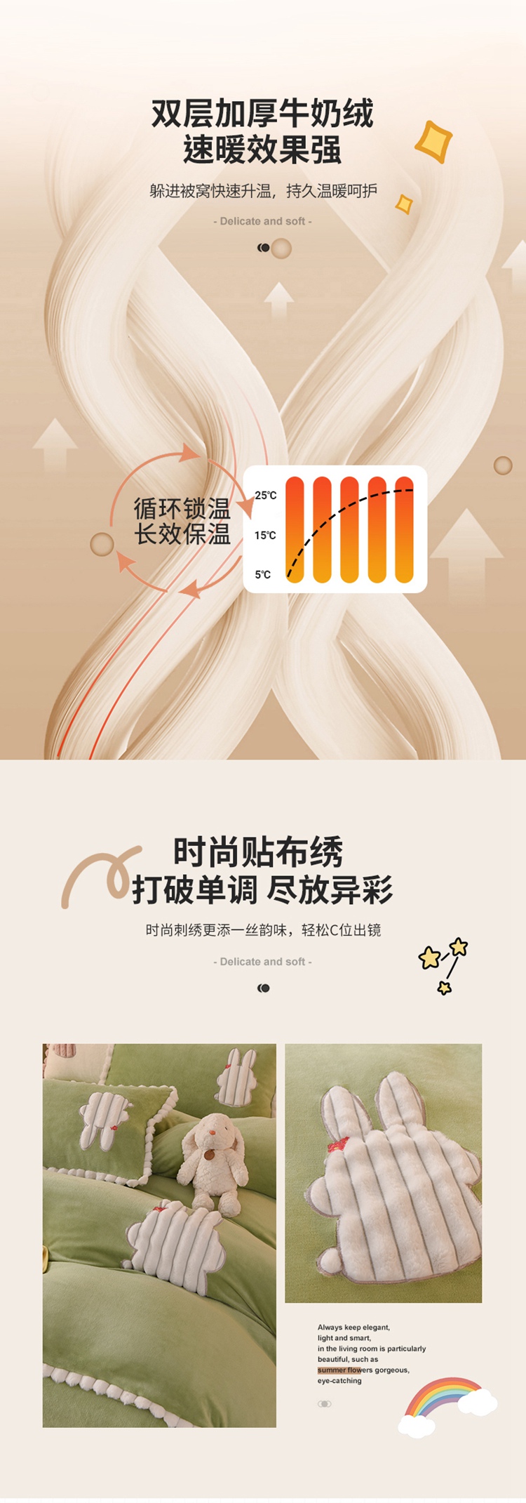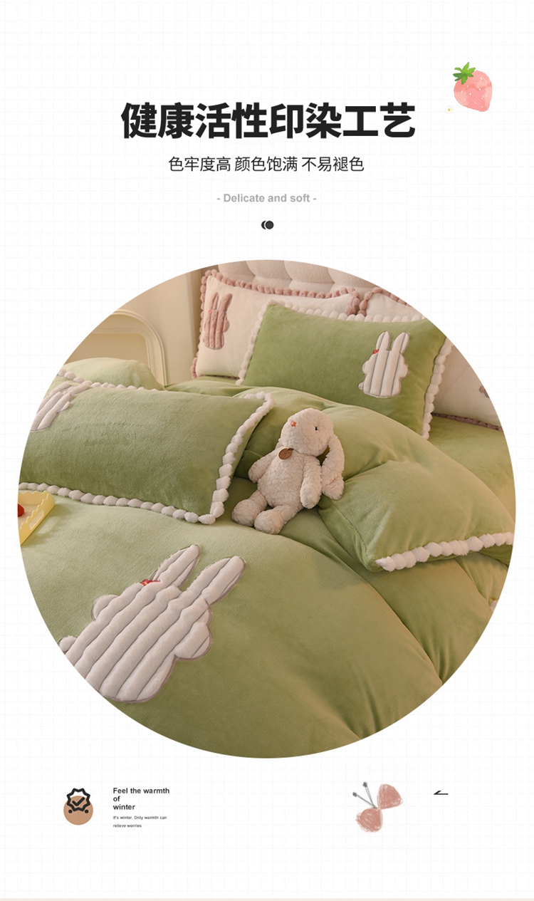 艾米家居 2023新款秋冬牛奶绒刺绣花边四件套-幸运兔 果绿