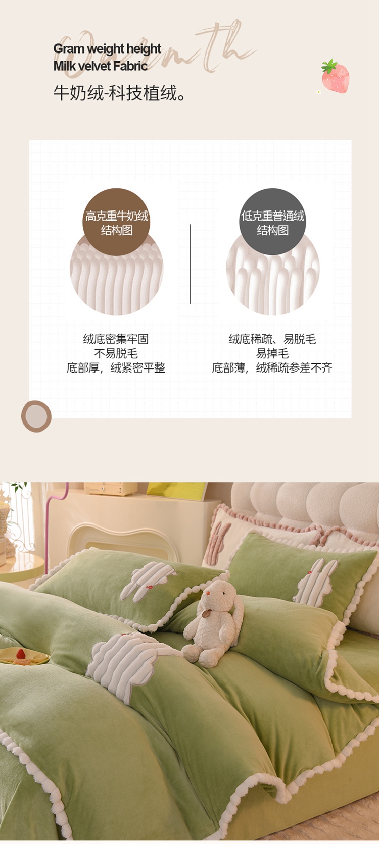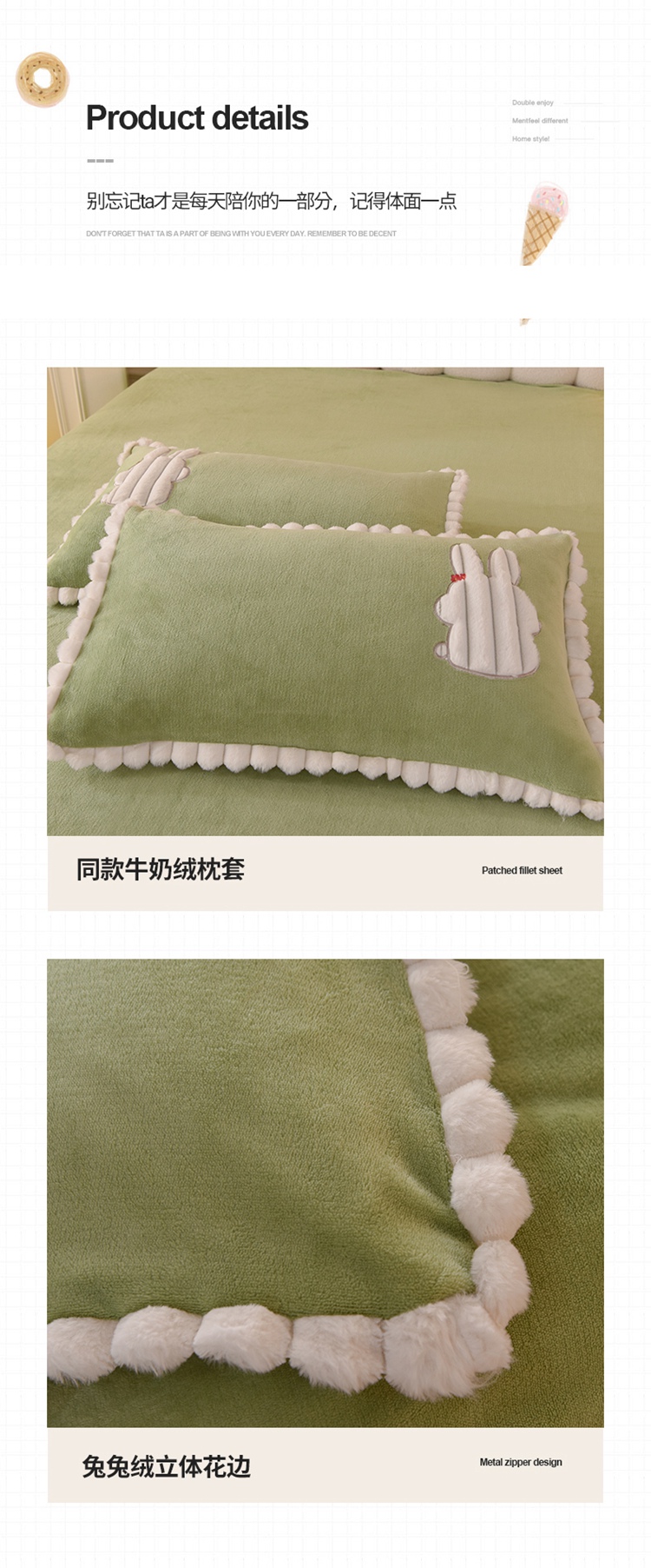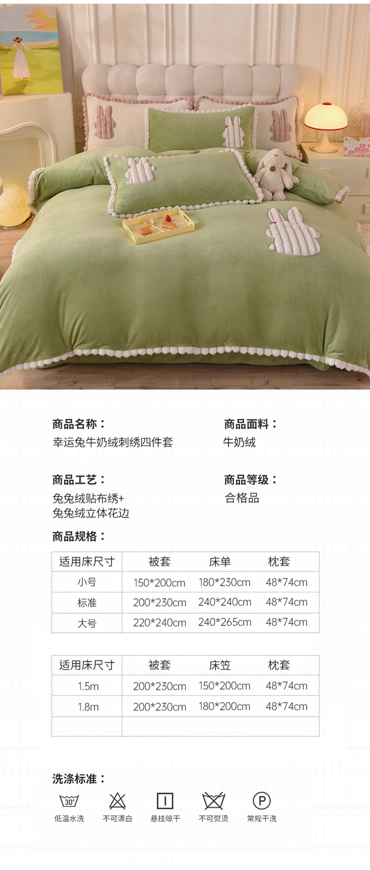 商品名称:艾米家居 2023新款秋冬牛奶绒刺绣花边四件套-幸运兔 果绿