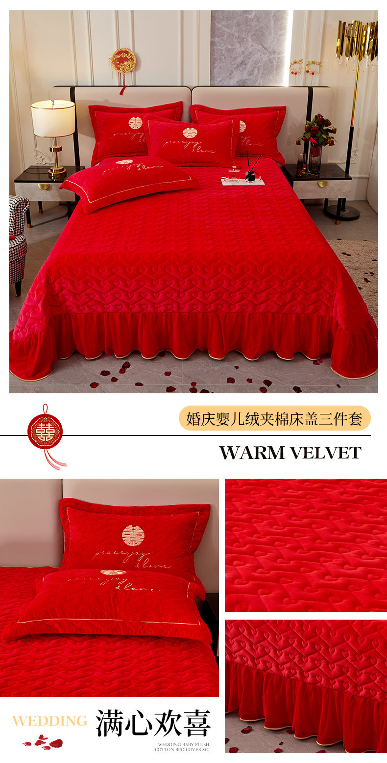 宜凡家纺 2023秋冬新品婴儿绒婚庆床盖三件套 满心欢喜