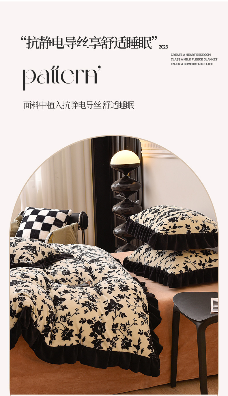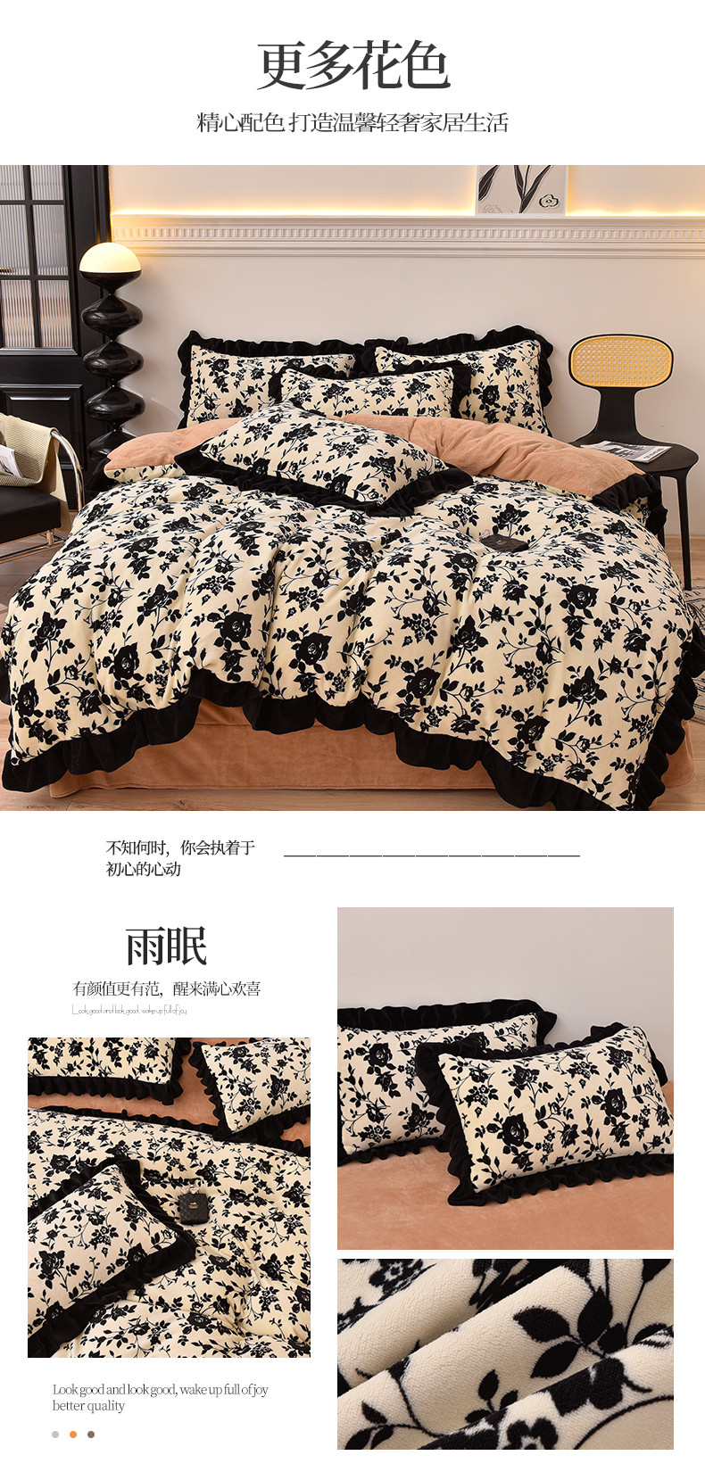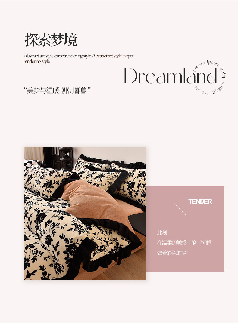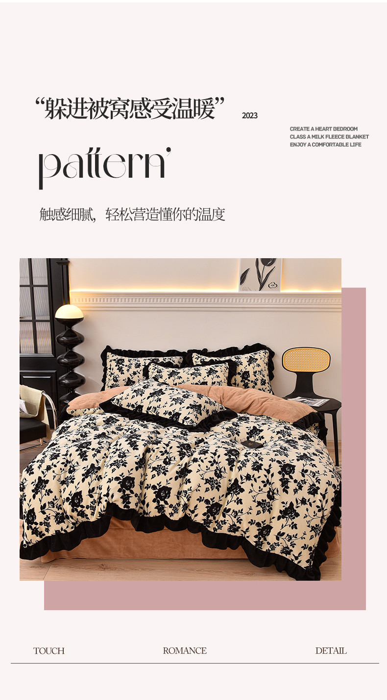 (总)迪梦姿 2025新款牛奶绒印花黑花边款四件套