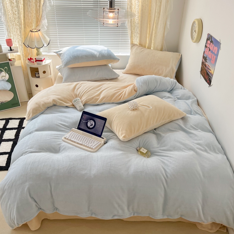 商品名称:昔可家纺2023新款奶油纯色系列双拼牛奶绒四件套 奶油蓝拼黄