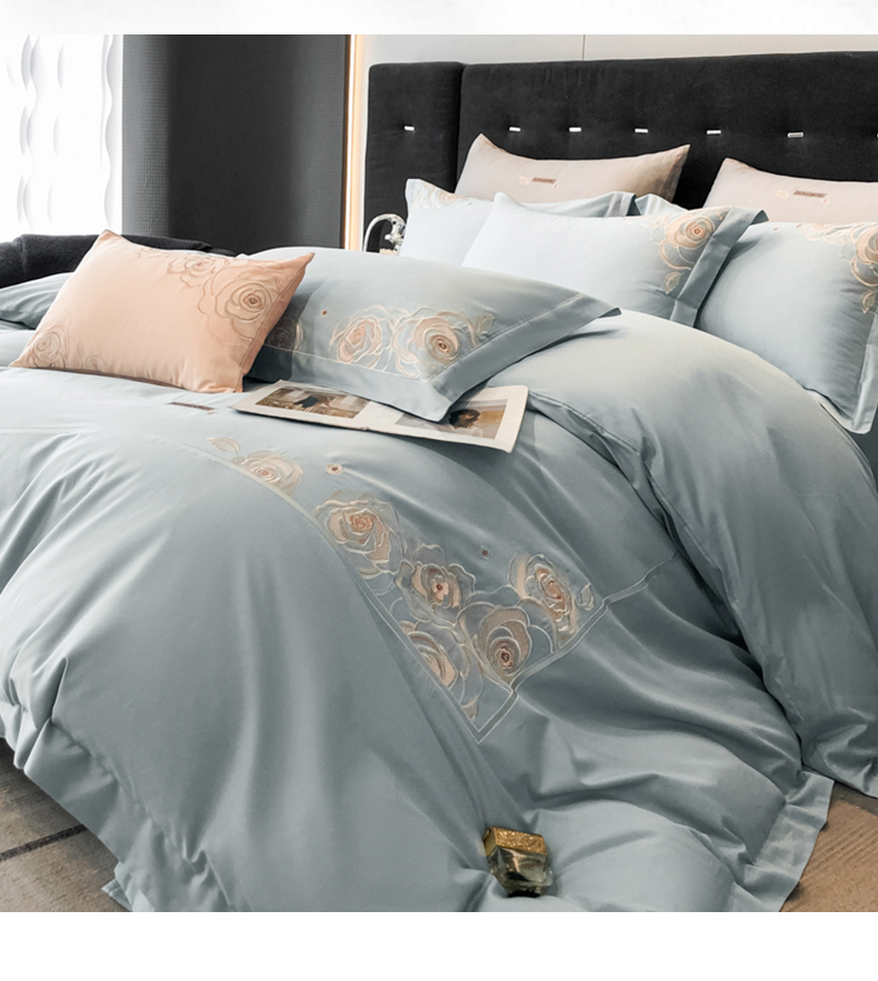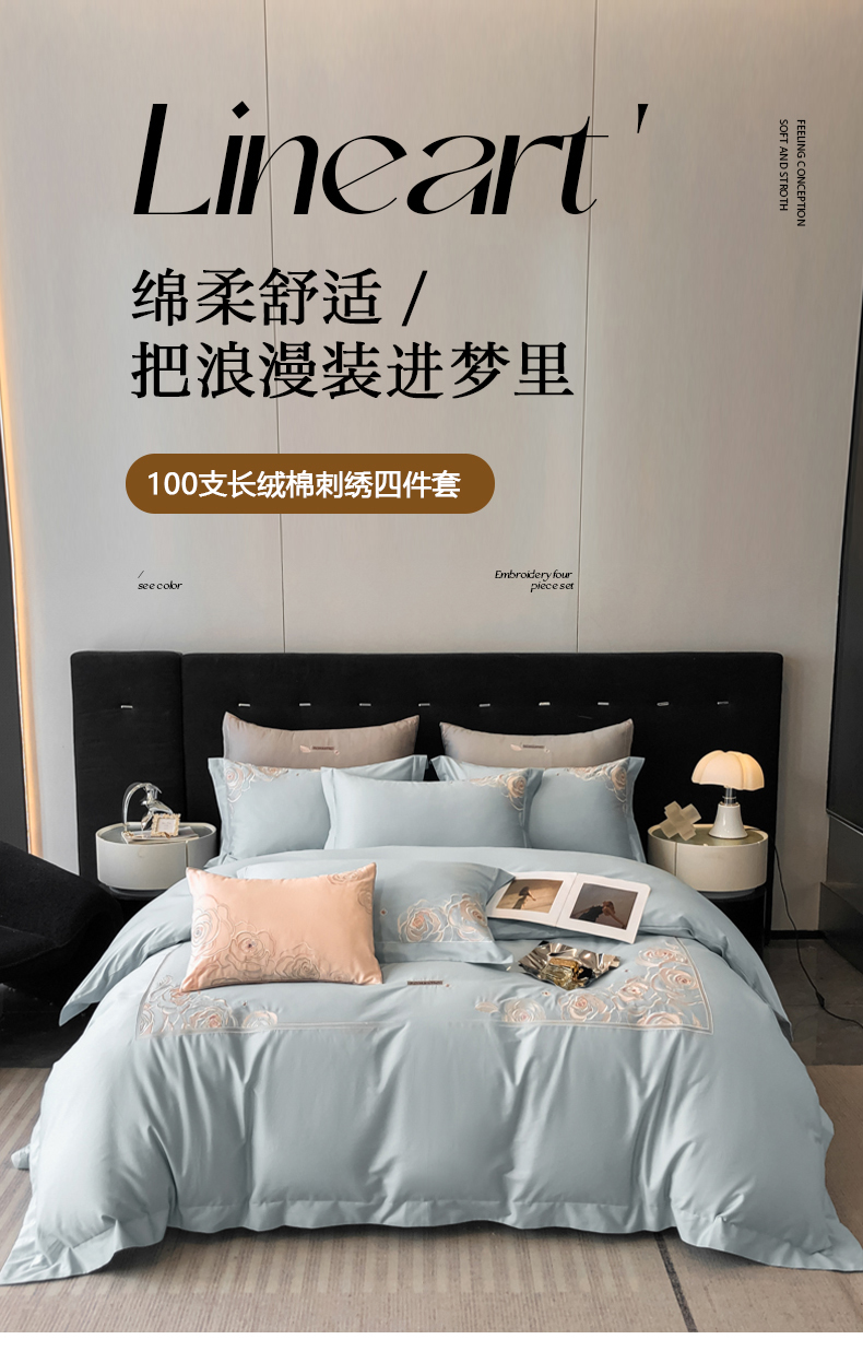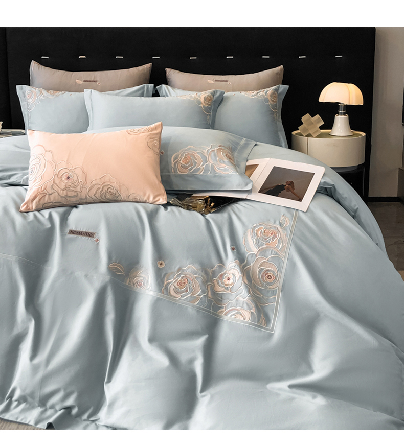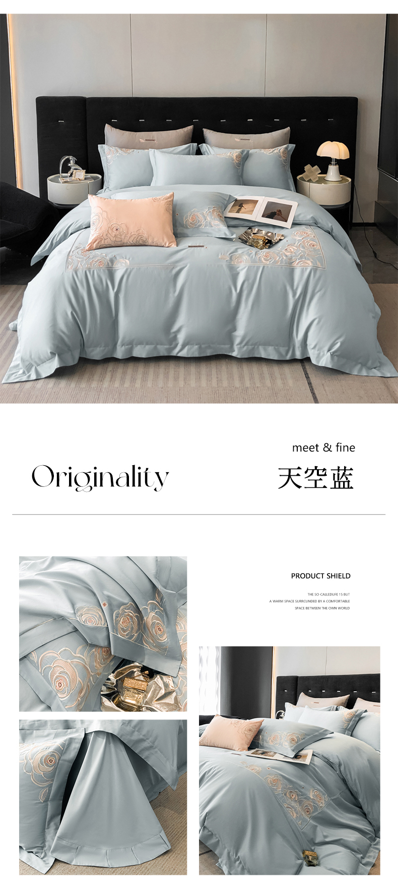 魅都100长绒棉简约轻奢刺绣四件套 婉玉-天空蓝