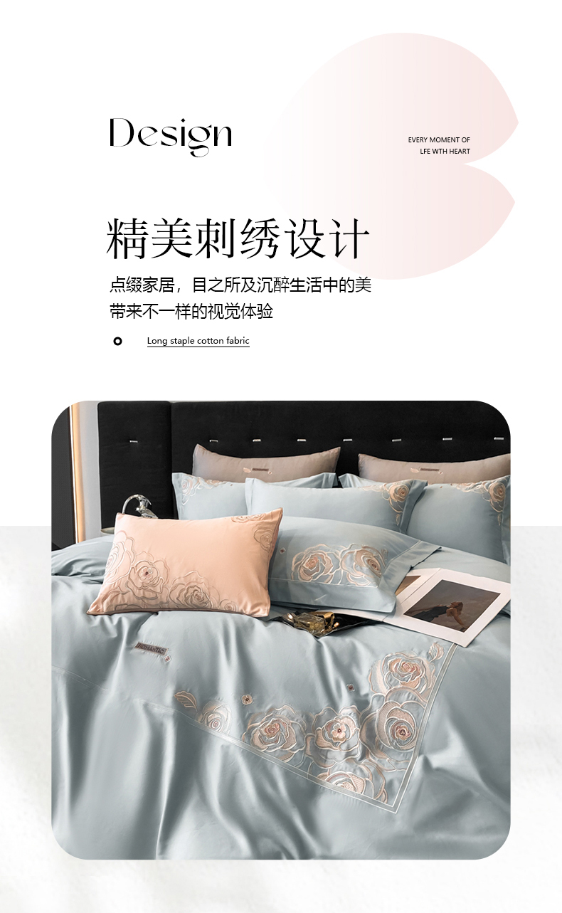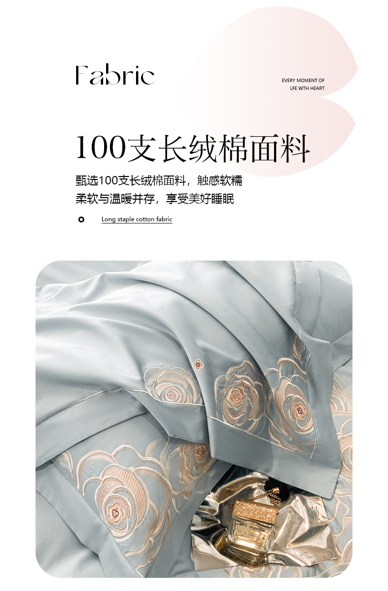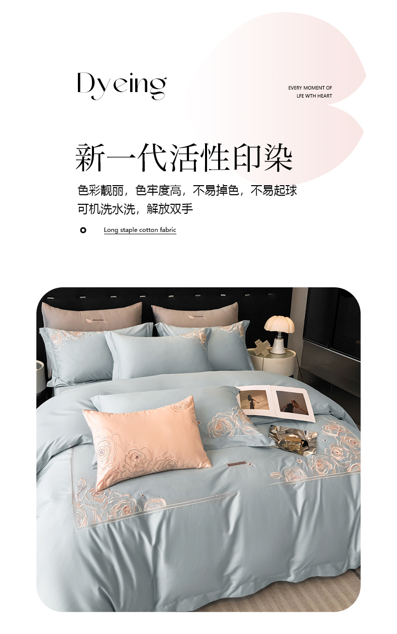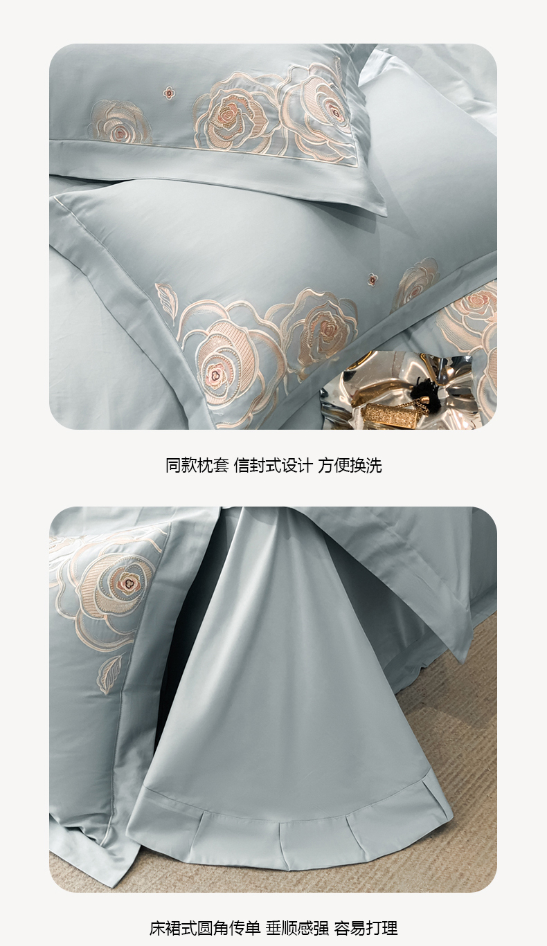 魅都100长绒棉简约轻奢刺绣四件套 婉玉-天空蓝