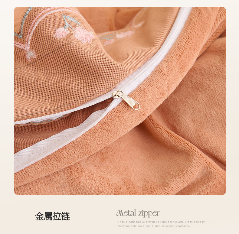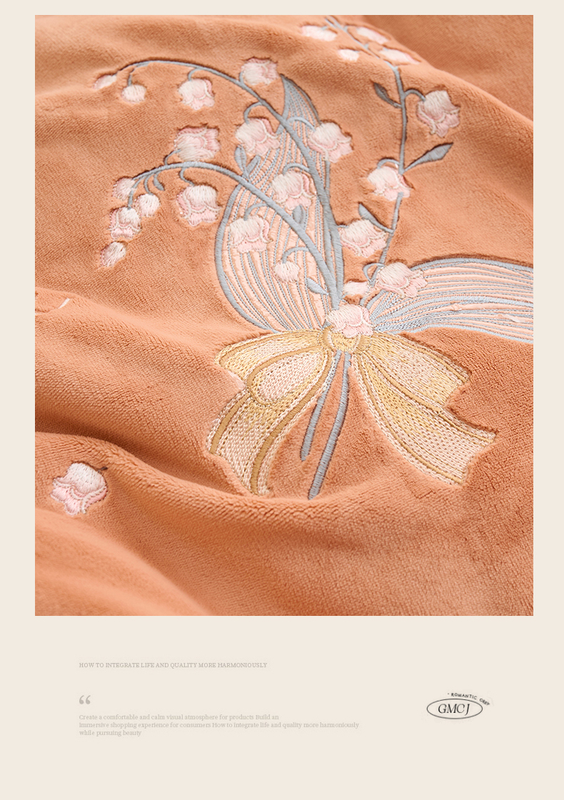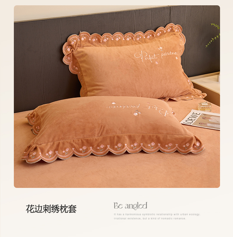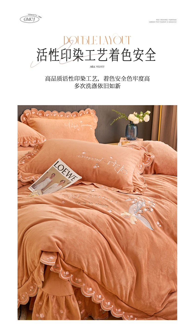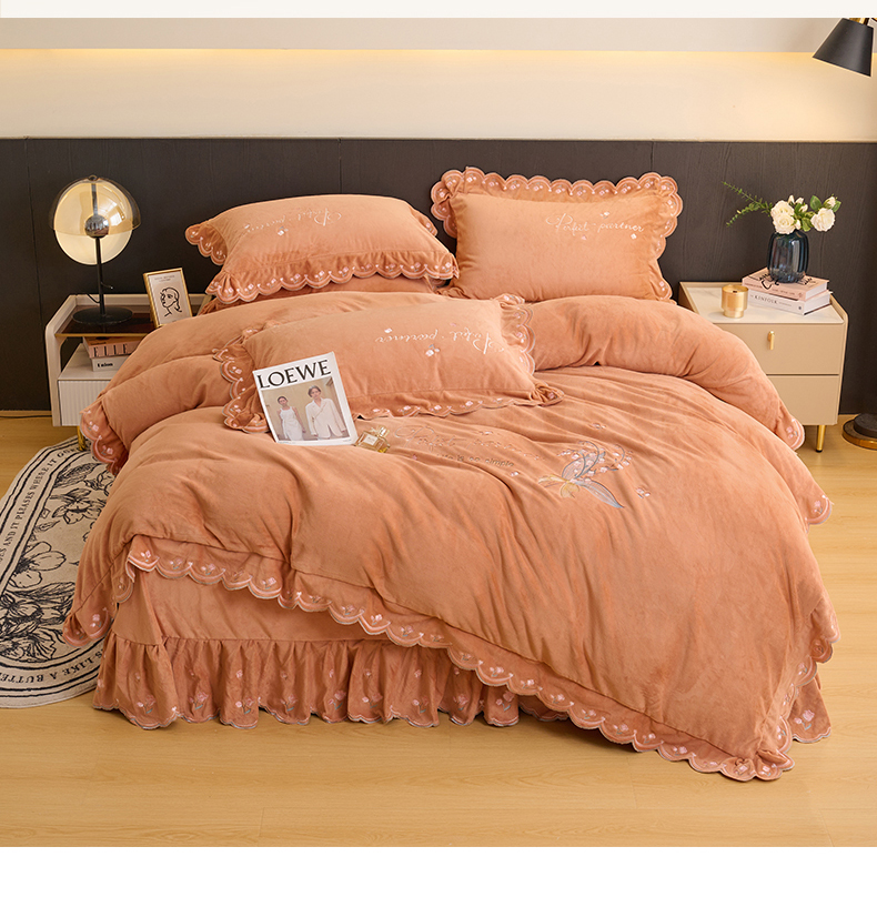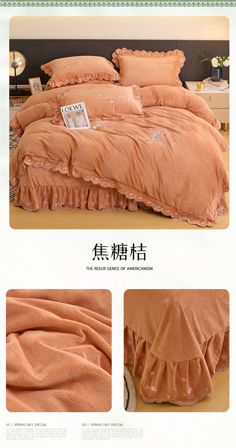 商品名称:恒爱2023新款加厚双面牛奶绒绣花花边款四件套-铃兰花 焦糖桔