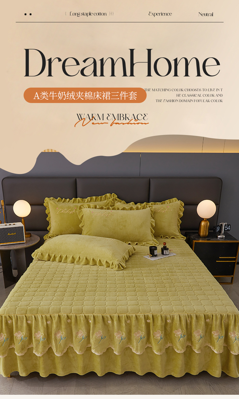 (总)恒爱家纺 2025新款牛奶绒贴布绣夹棉床裙四件套,豆沙红,浪漫紫,天空蓝,温馨粉,象牙白