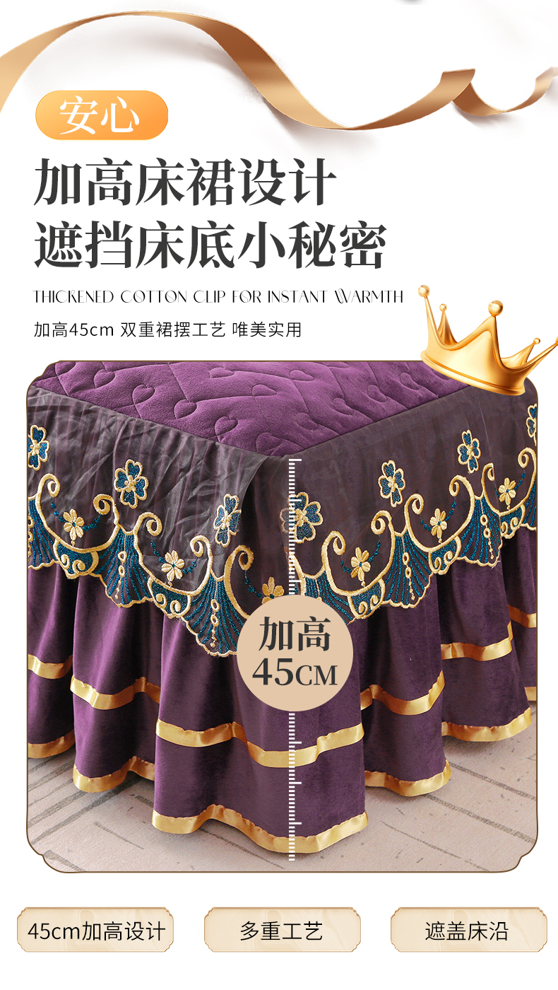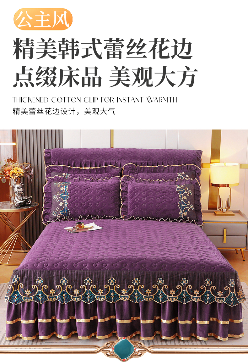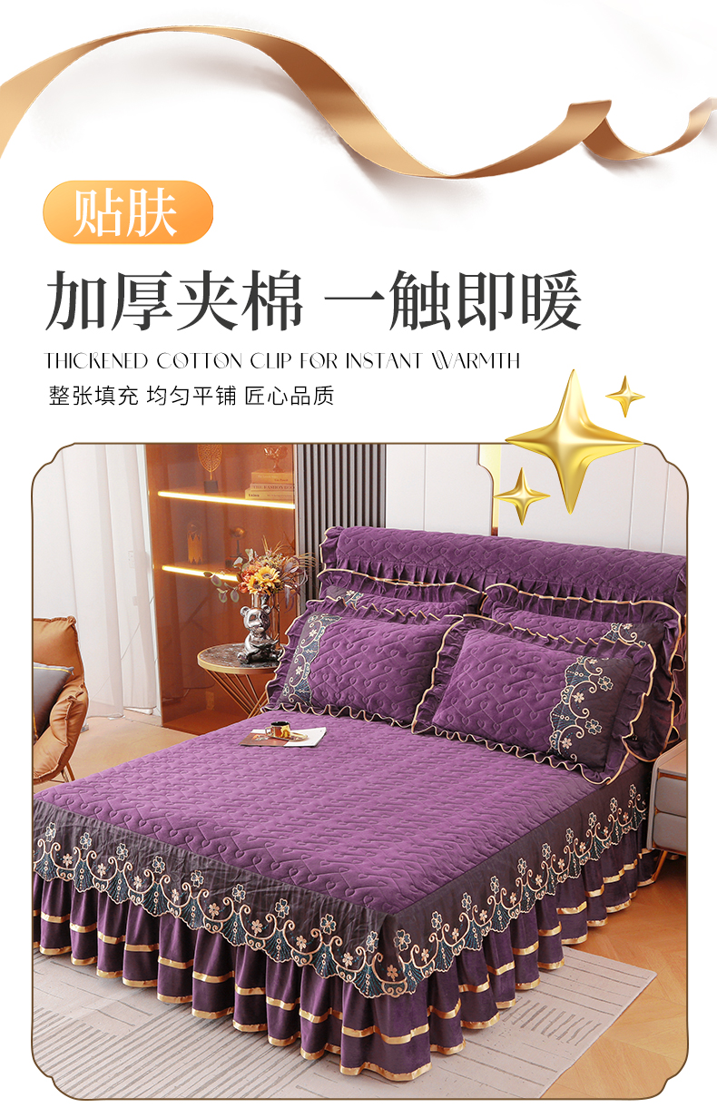 (总)屹成家纺2025新款水晶绒夹棉绗缝蕾丝床裙三件套(塞纳河畔)床裙单件起售价不低于105元,大红,豆沙,翡翠绿,粉玉,橄榄绿,蔚蓝,银灰