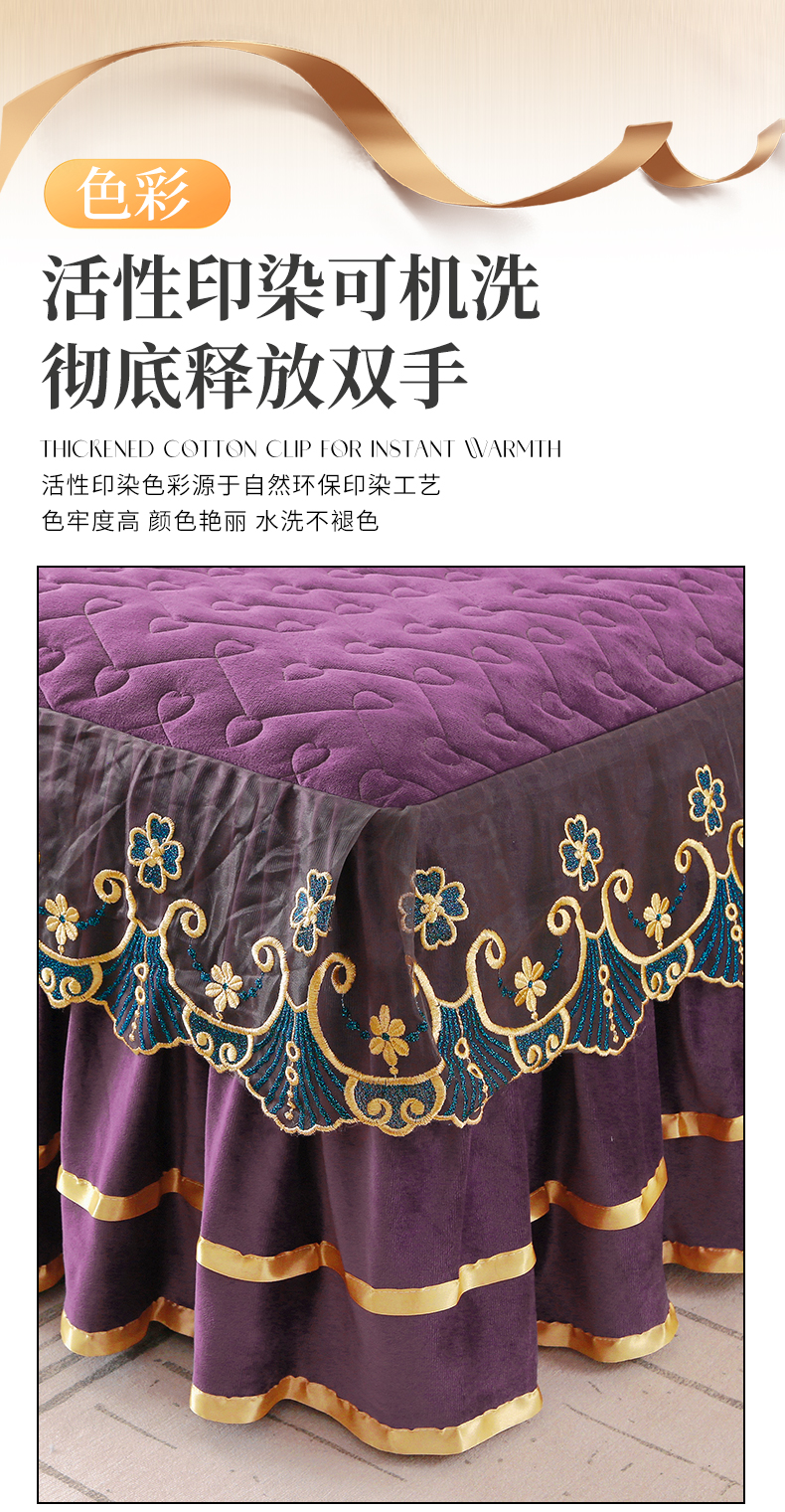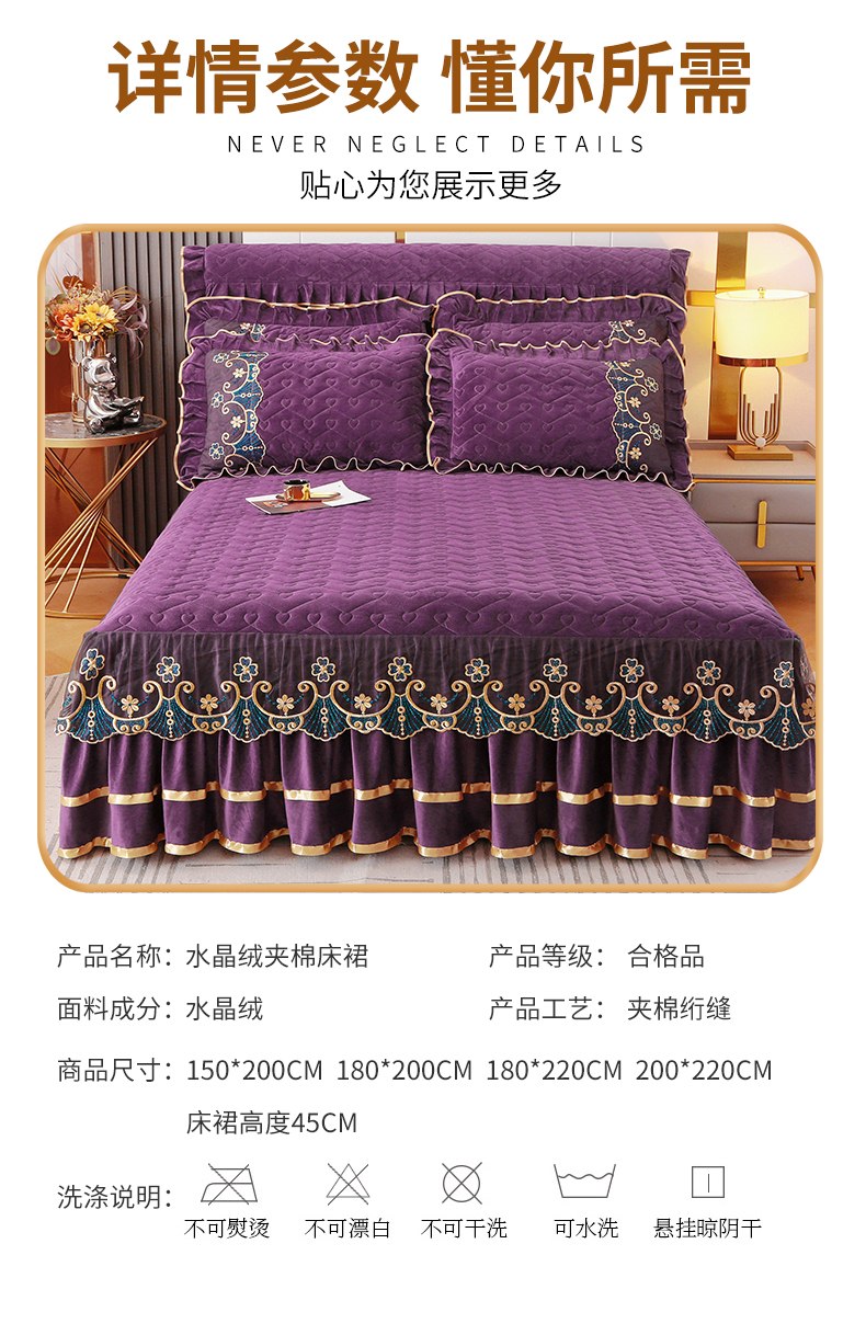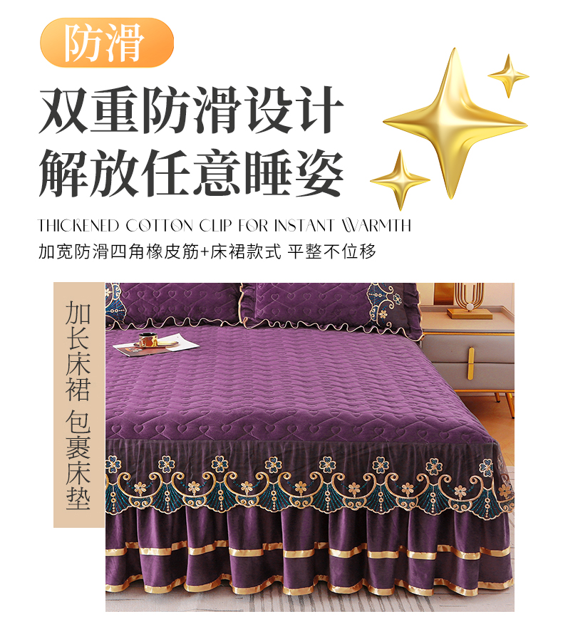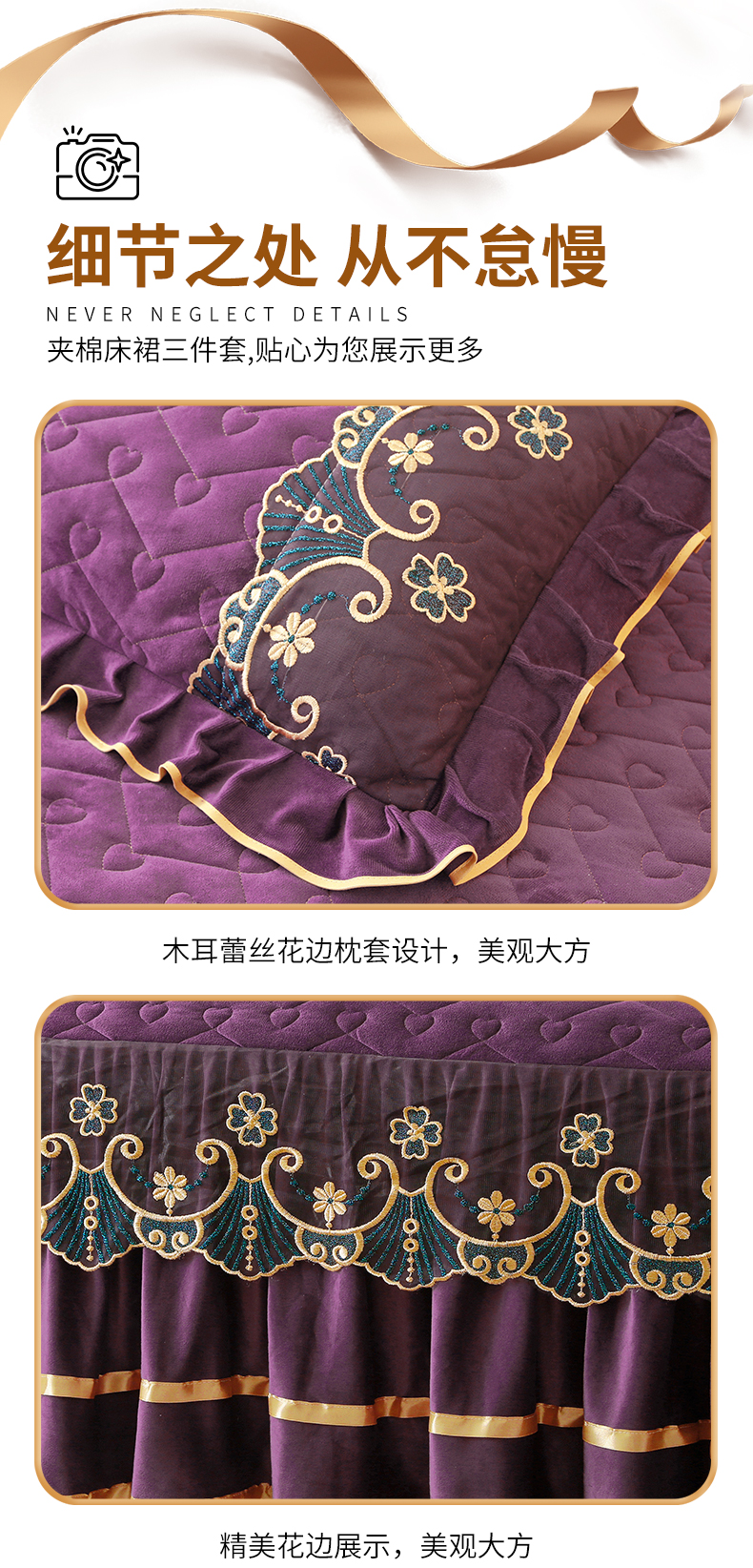 (总)屹成家纺2025新款水晶绒夹棉绗缝蕾丝床裙三件套(塞纳河畔)床裙单件起售价不低于105元,大红,豆沙,翡翠绿,粉玉,橄榄绿,蔚蓝,银灰
