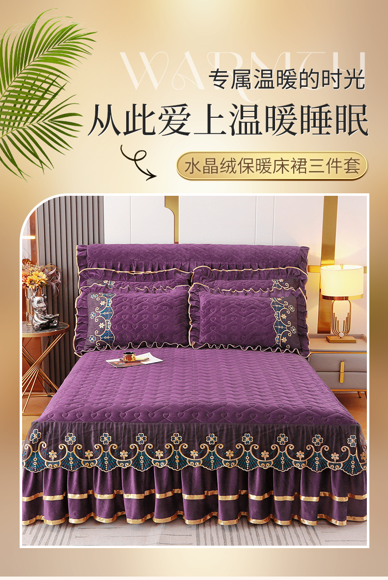 • 91家纺网 家纺一手货源 找家纺 (总)屹成家纺2025新款水晶绒夹棉绗缝蕾丝床裙三件套(塞纳河畔)床裙单件起售价不低于105元,大红,豆沙,翡翠绿,粉玉,橄榄绿,蔚蓝,银灰