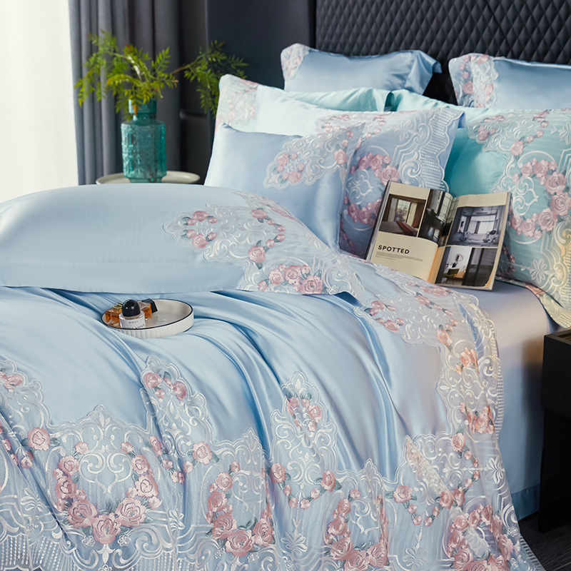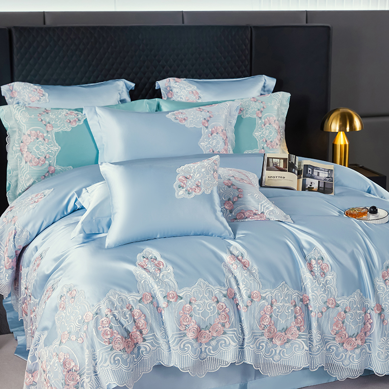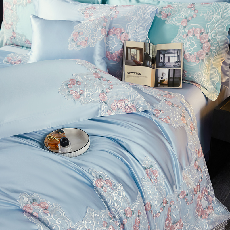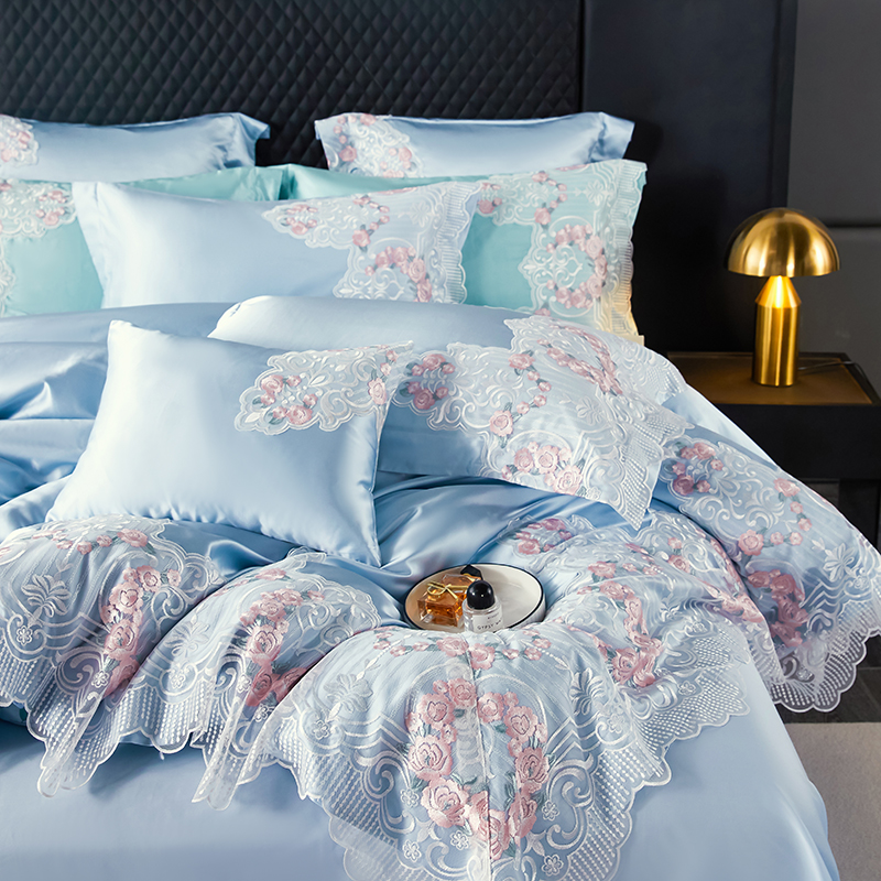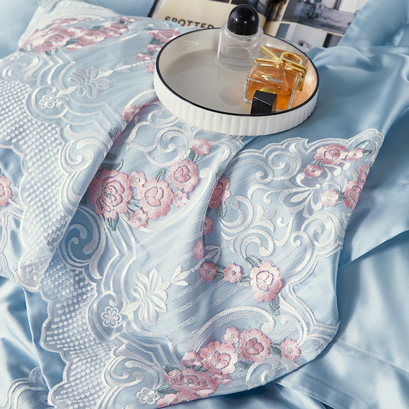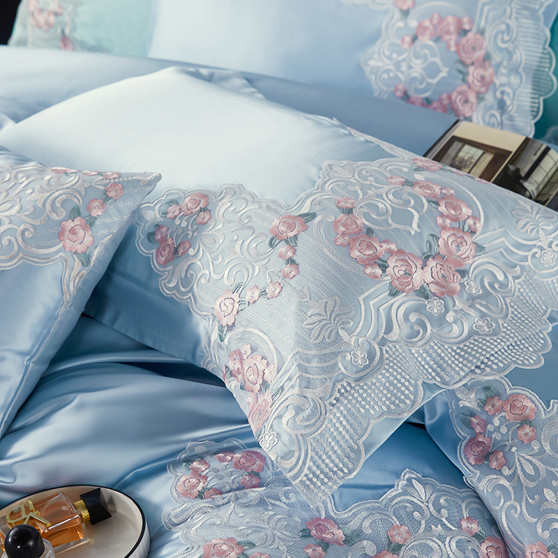 当前位置: 91家纺网 > 商品网购 > 床品套件 > 四件套 > 长绒棉四件套 > 缔缦 2023新款A版真丝棉B版60s长绒棉高端蕾丝四件套系列-蔷薇花园 蓝