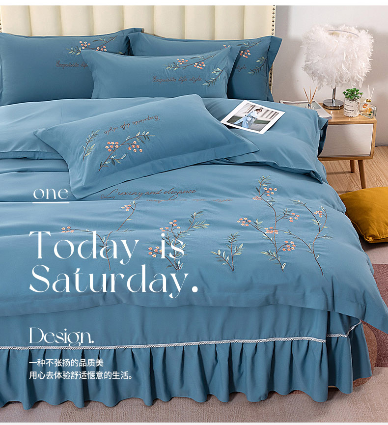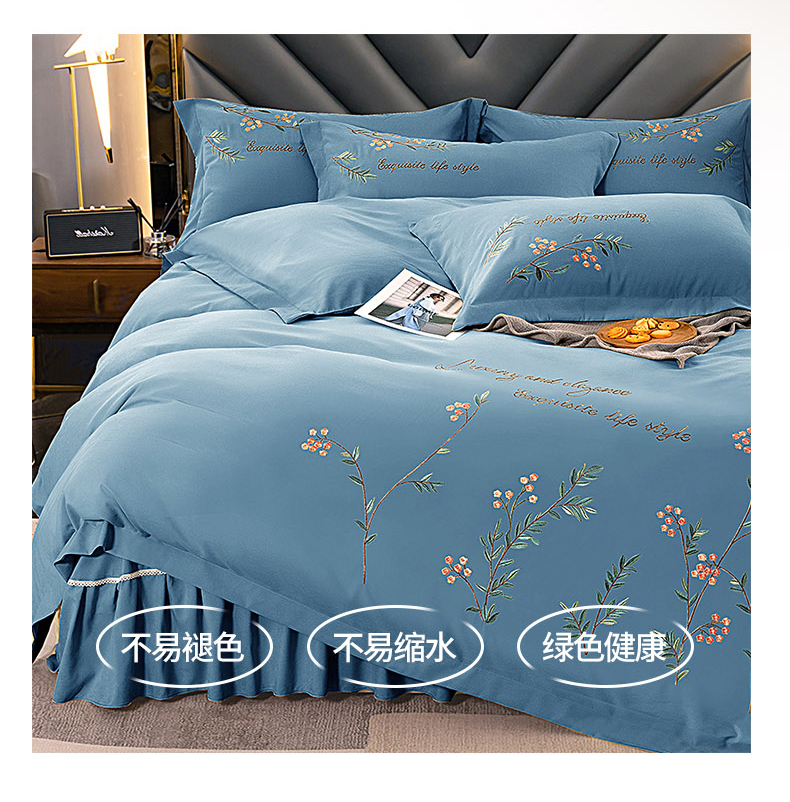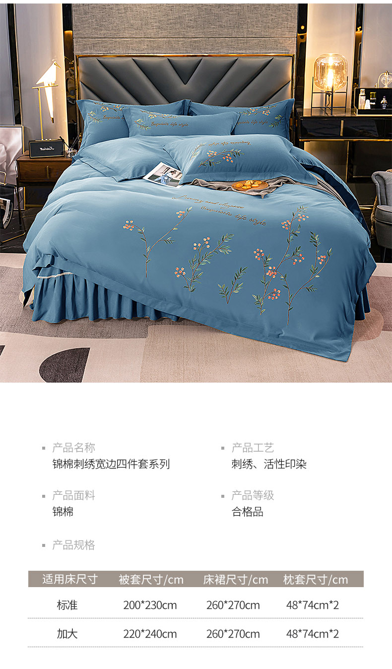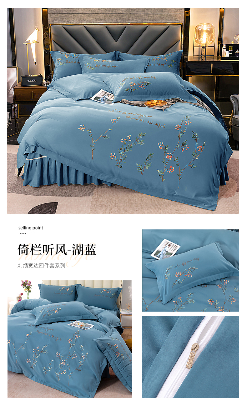 商品名称:伊而梦 2023新款锦棉宽边绣花四件套--倚栏听风 倚栏听风-湖蓝