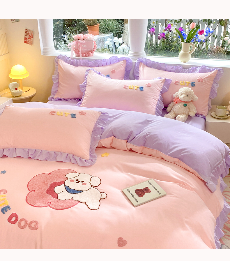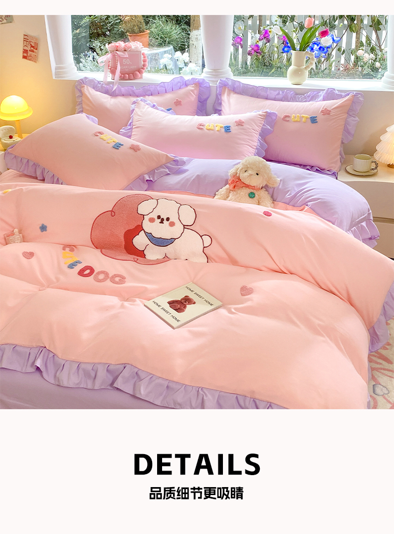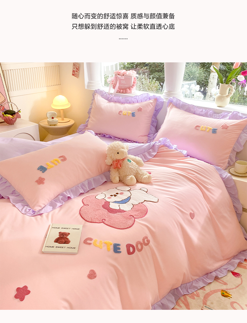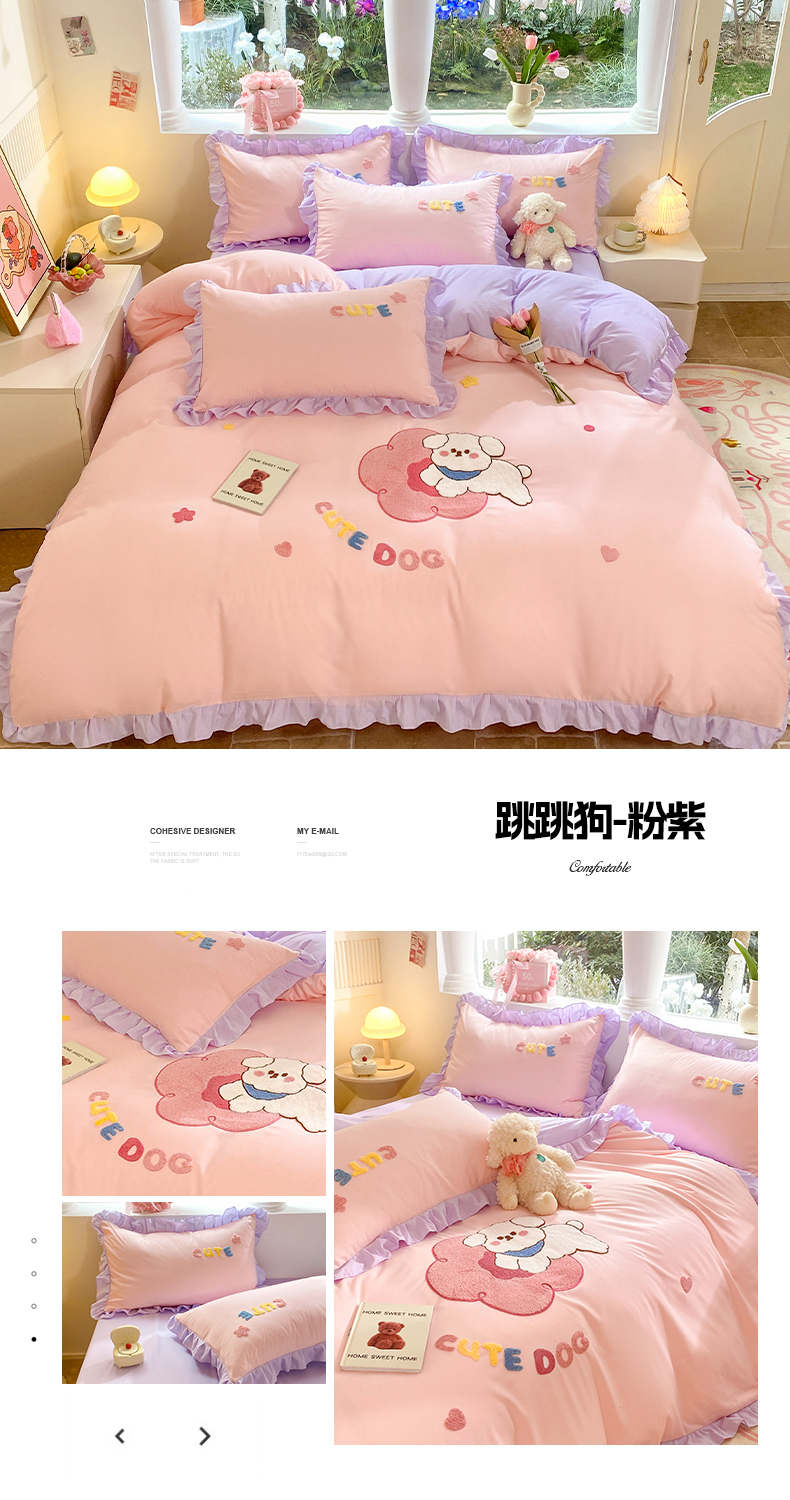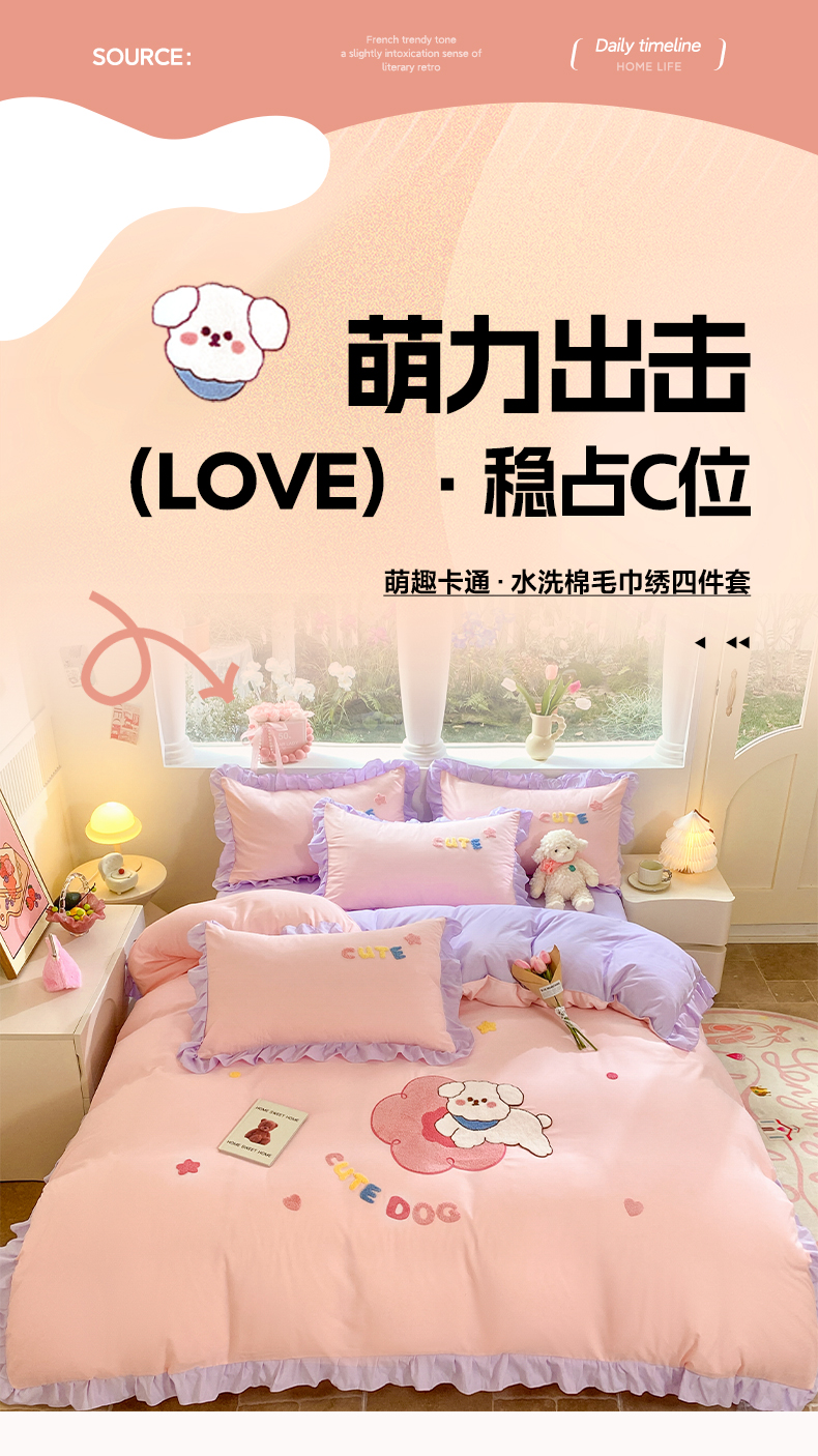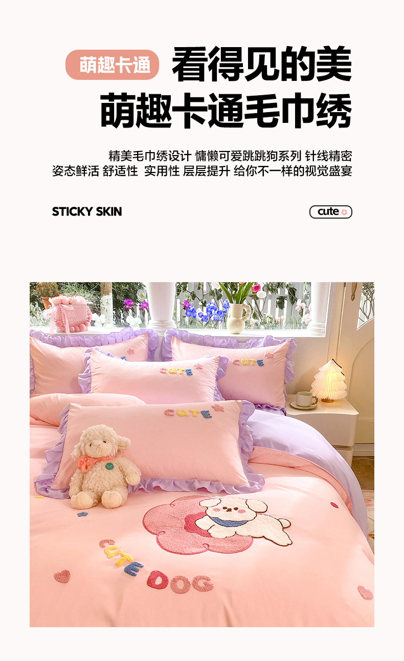 当前位置: 91家纺网 > 商品网购 > 床品套件 > 四件套 > 毛巾绣四件套 > 易禾家纺 2024新款专板花型亲肤水洗棉毛巾绣四件套-跳跳狗 跳跳狗-粉紫