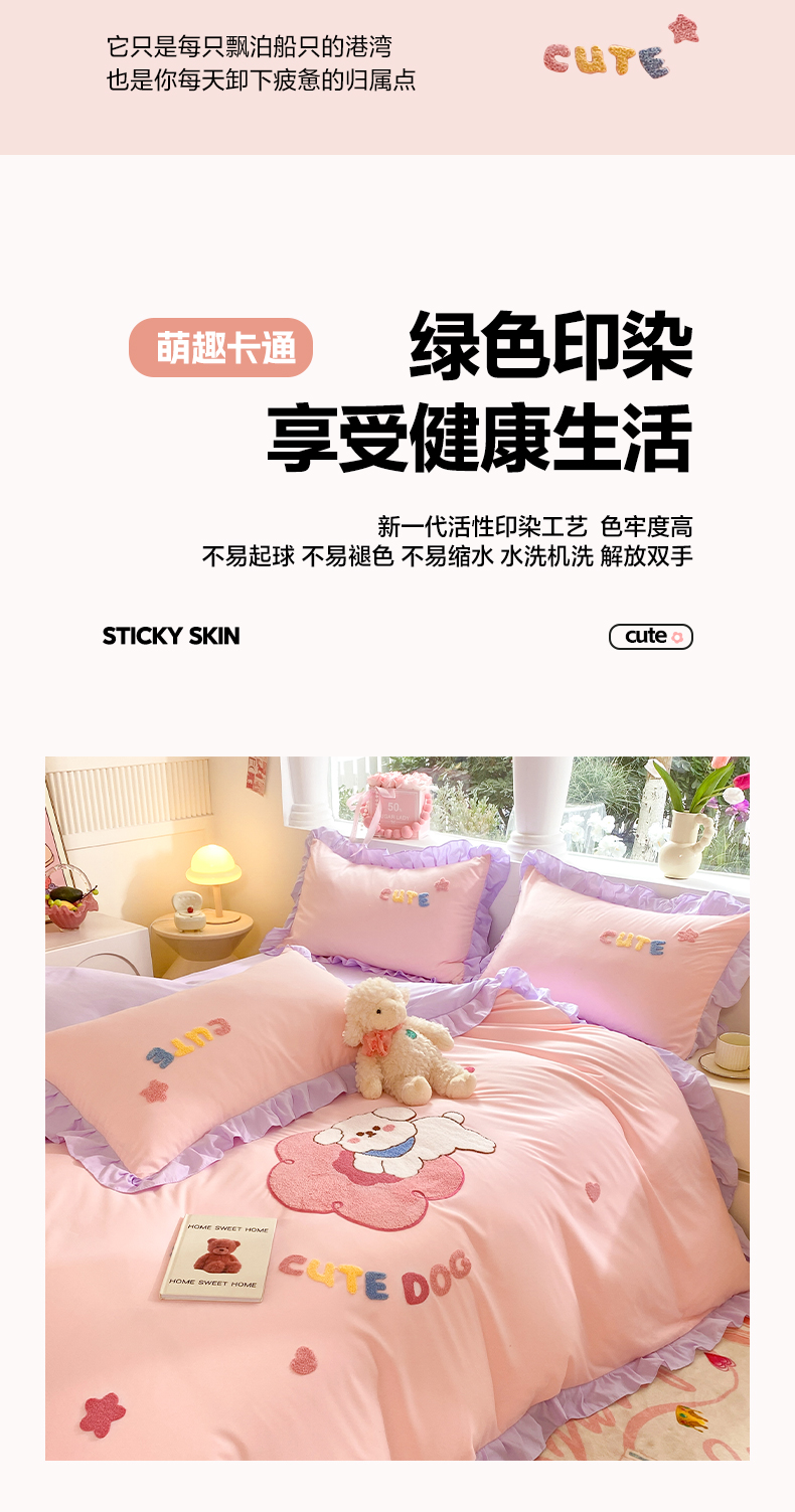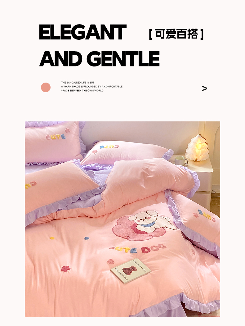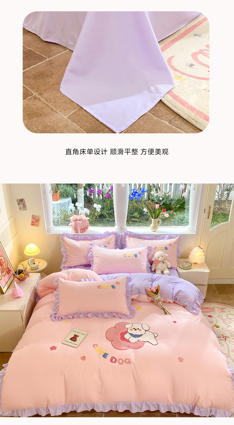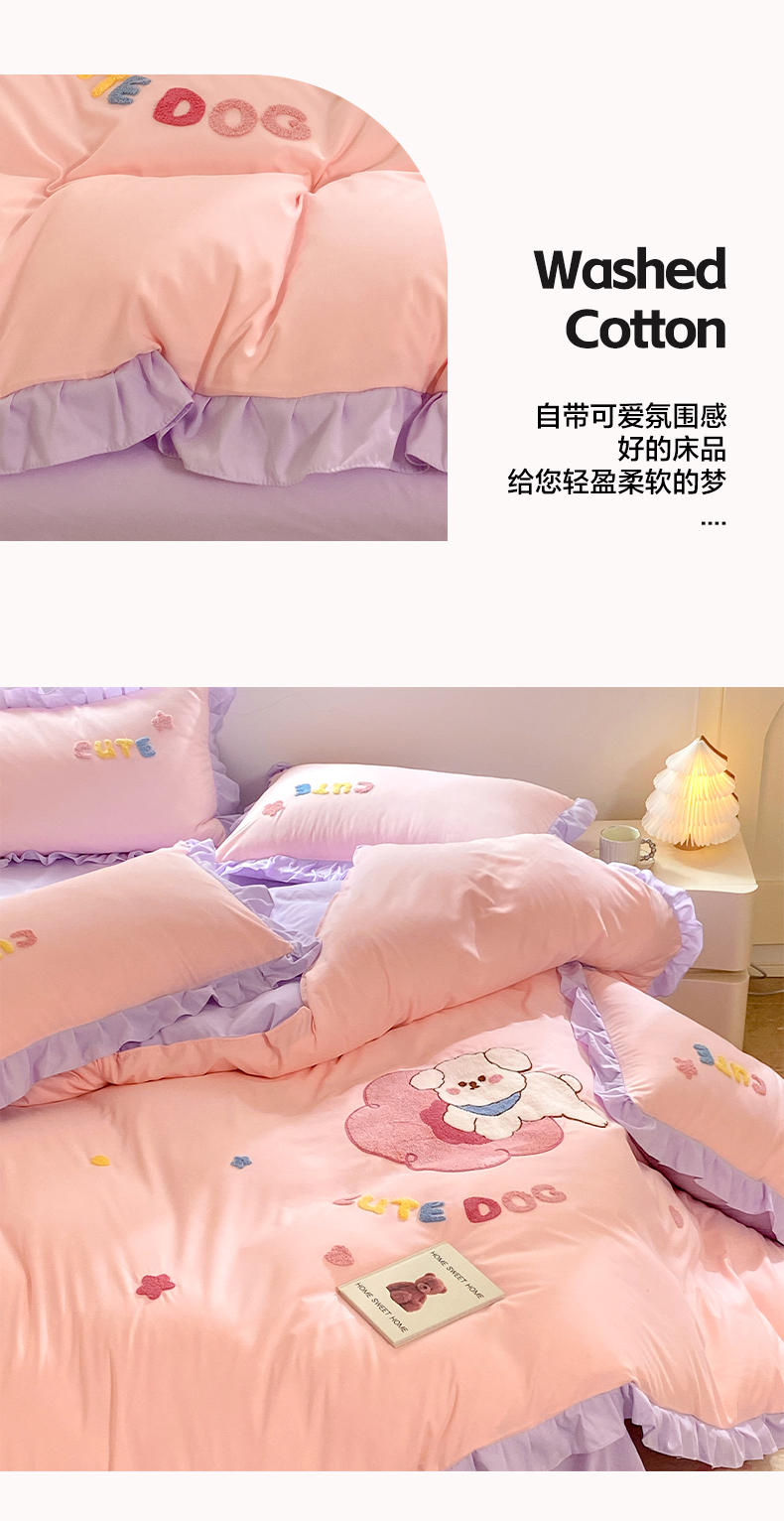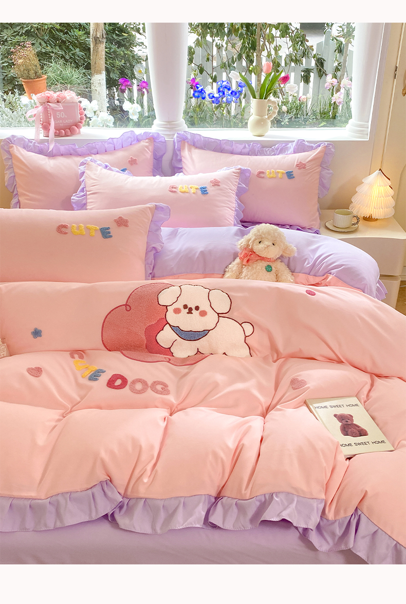 当前位置: 91家纺网 > 商品网购 > 床品套件 > 四件套 > 毛巾绣四件套 > 易禾家纺 2024新款专板花型亲肤水洗棉毛巾绣四件套-跳跳狗 跳跳狗-粉紫