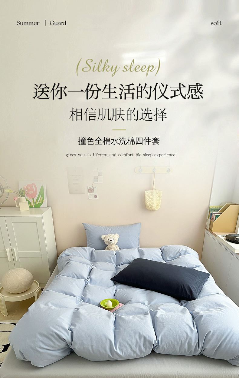 (总) 寐居 2023新款双拼全棉水洗棉纯色四件套,ins风-草绿色,ins风-湖绿色,ins风-裸粉色,ins风-迷雾蓝,ins风-奶油黄,ins风-柠檬黄,ins风-樱花粉,鹅黄+香芋紫,焦糖+卡其,军绿+焦糖,米黄+卡其,米黄+深粉,奶油玉+鹅黄,深粉+湖蓝,深蓝+焦糖,藏青+浅灰,绿+牛油果绿,米黄+浅蓝,抹茶绿+橡木黄,奶油玉+橄榄绿,奶油玉+香芋紫,浅豆沙+浅灰,深蓝+灰