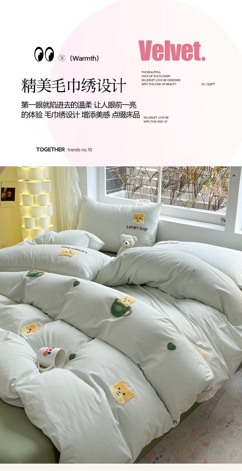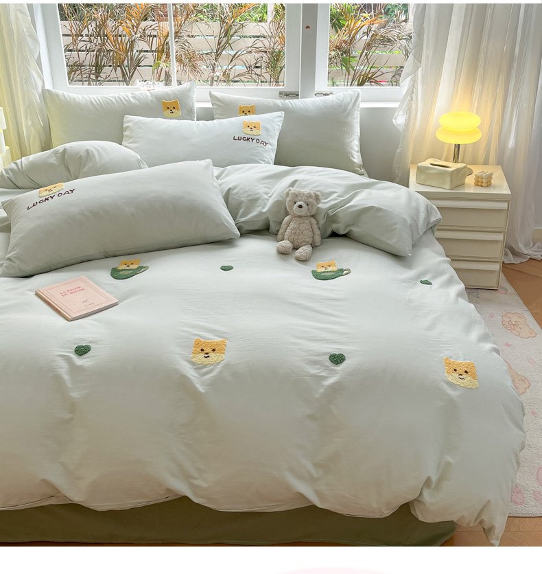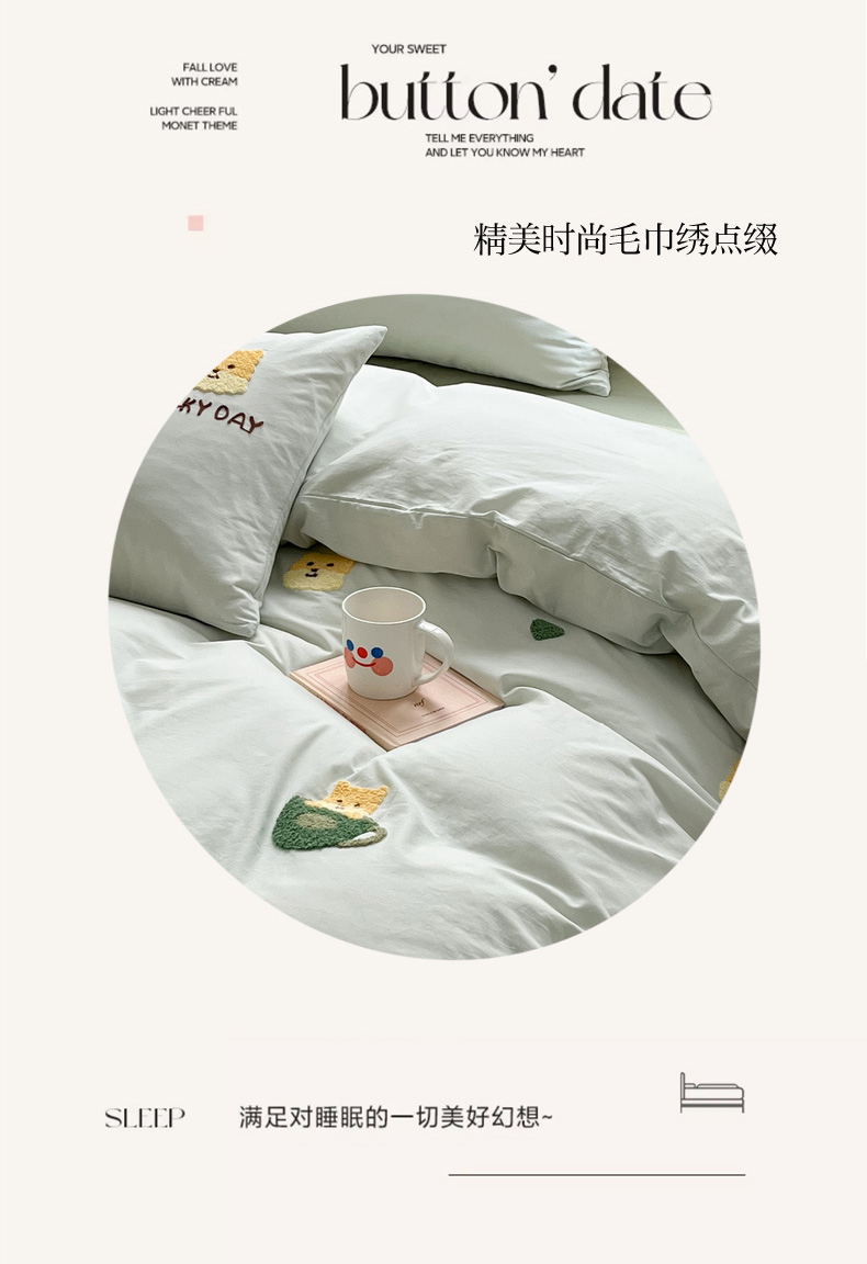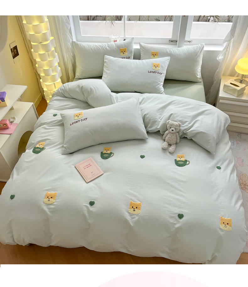 商品名称:寐居家纺 2024新款全棉水洗棉毛巾绣色织四件套 茶杯狗-绿
