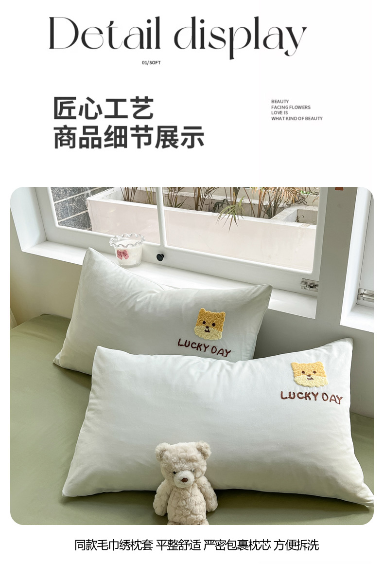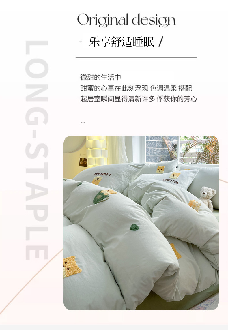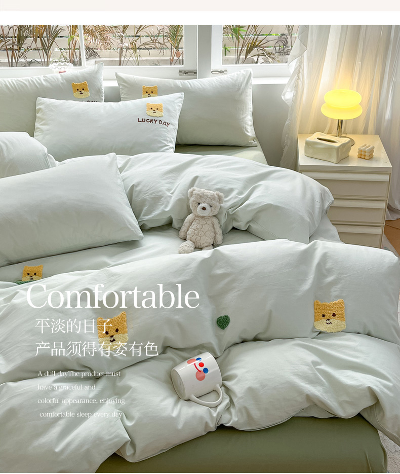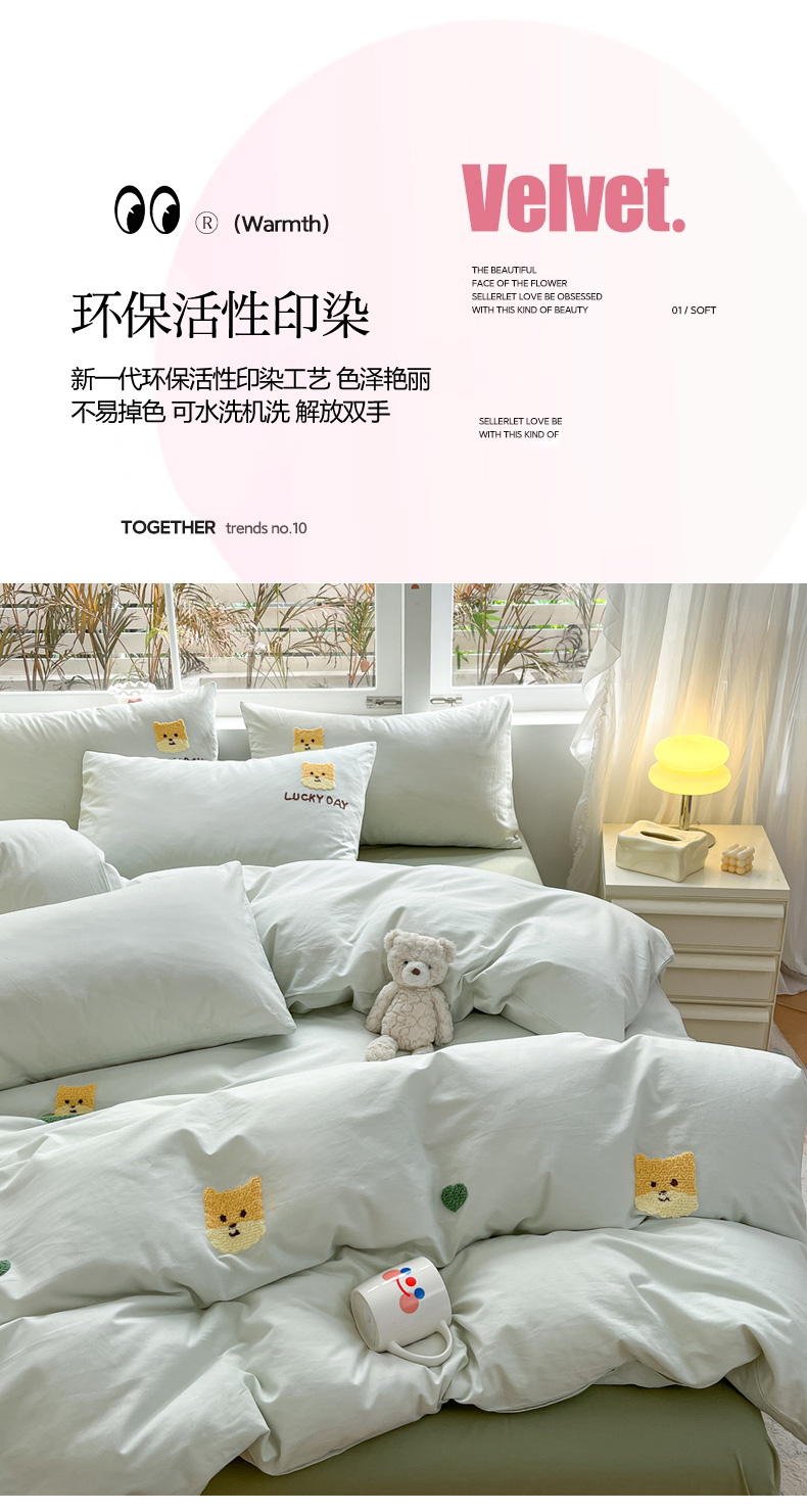 商品名称:寐居家纺 2024新款全棉水洗棉毛巾绣色织四件套 茶杯狗-绿
