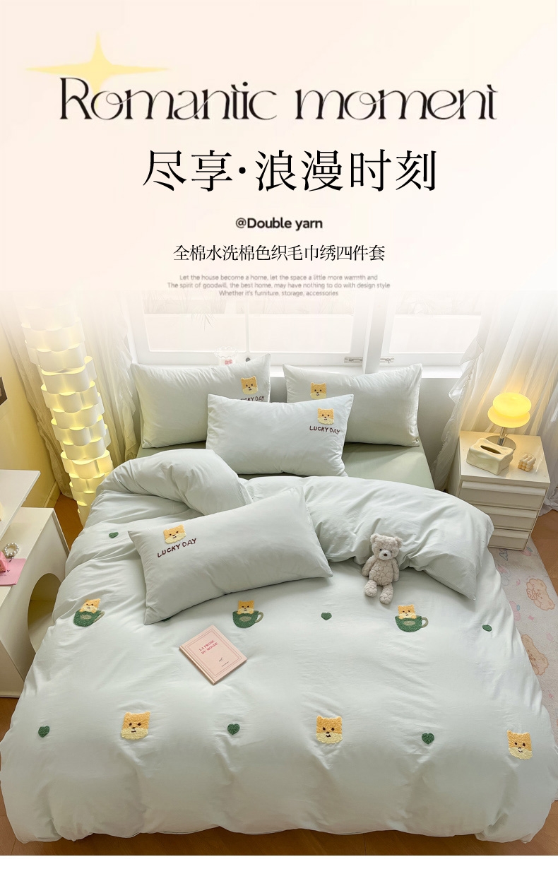 寐居家纺 2024新款全棉水洗棉毛巾绣色织四件套 茶杯狗-绿