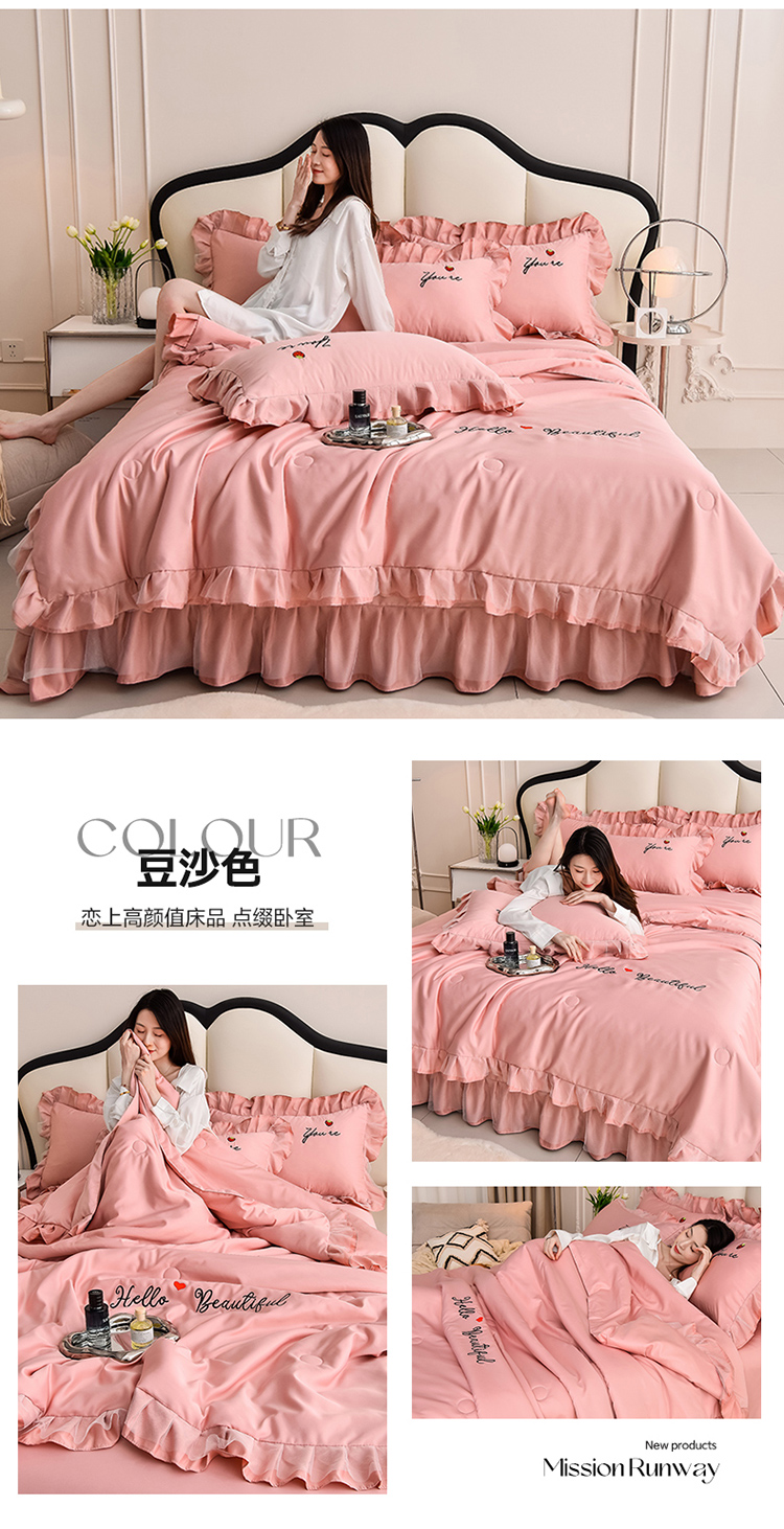 当前位置: 91家纺网 > 商品网购 > 床品套件 > 四件套 > 水洗真丝四件套 > 找底底家纺 2024新款水洗真丝床裙款夏被四件套床品套件 豆沙色
