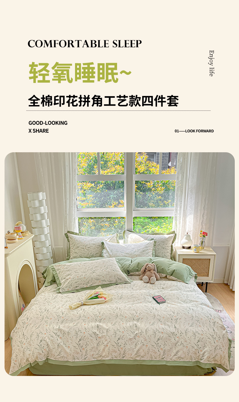 捌月2024新款全棉印花拼角工艺款四件套 微风