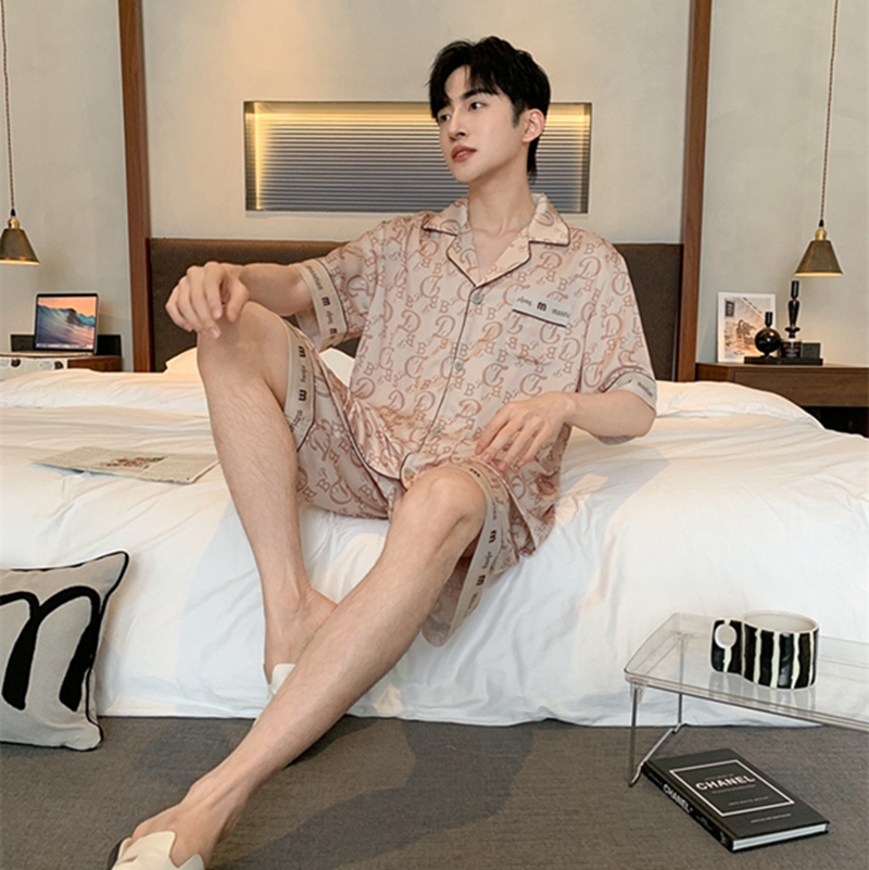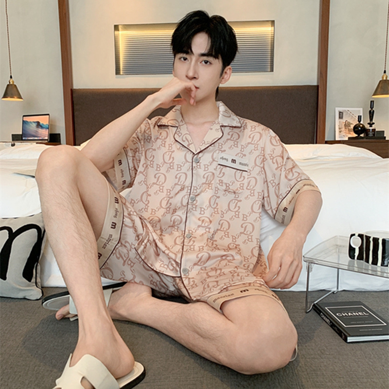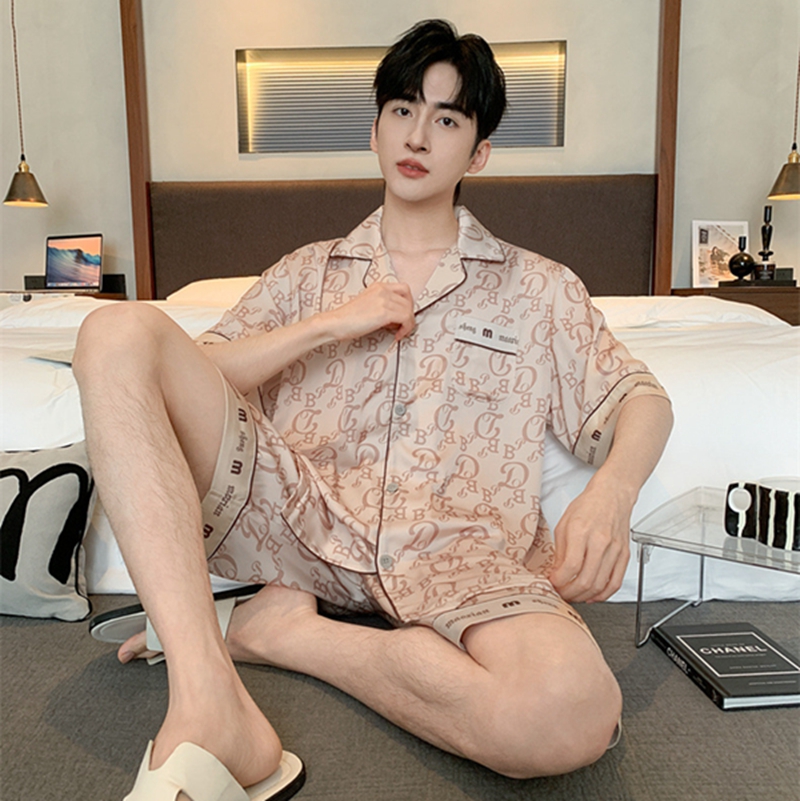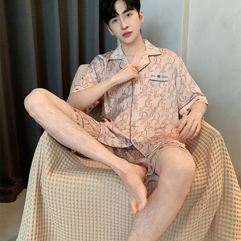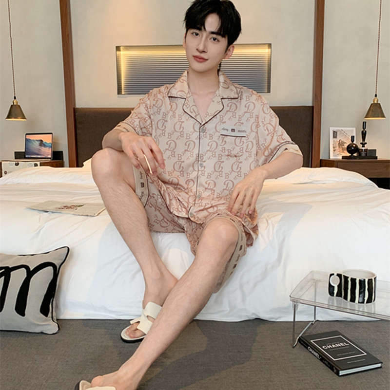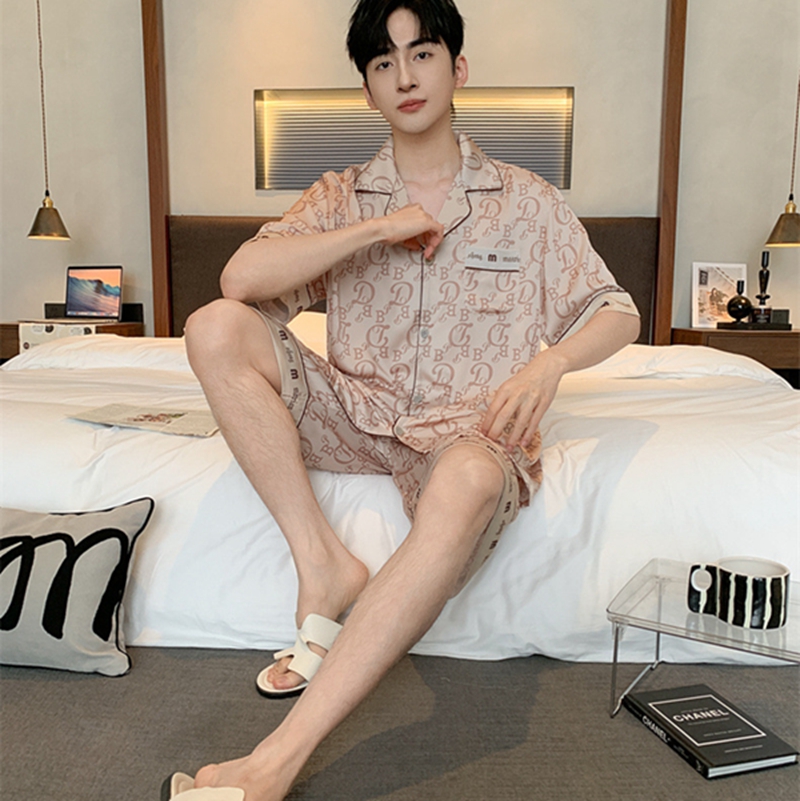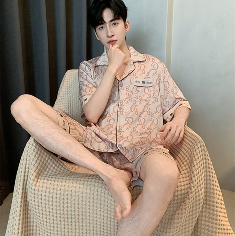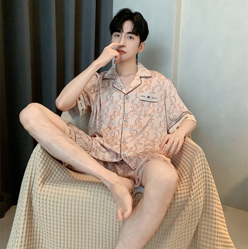 商品名称:洛兰沙 2024新款夏季高级感轻奢香槟色男士睡衣V字领长裤长袖轻薄家居服可外穿 香槟短款