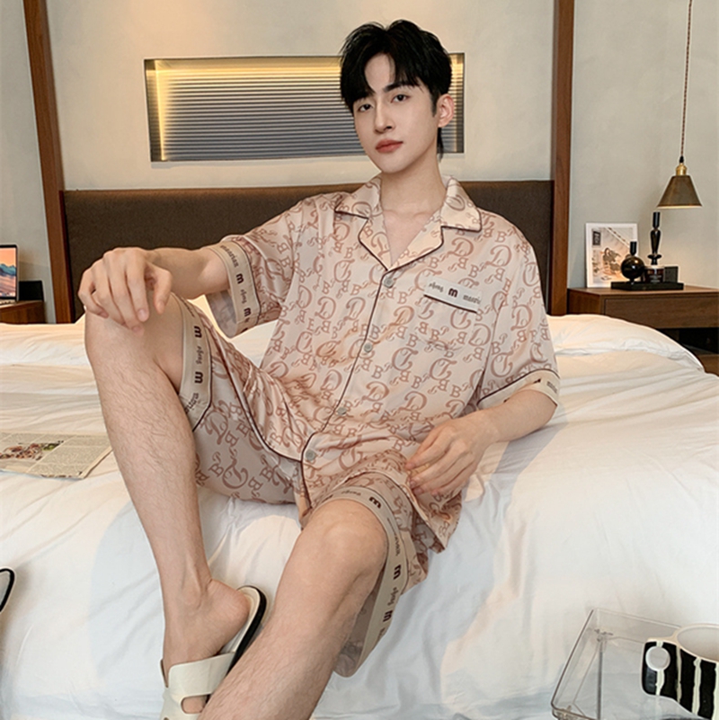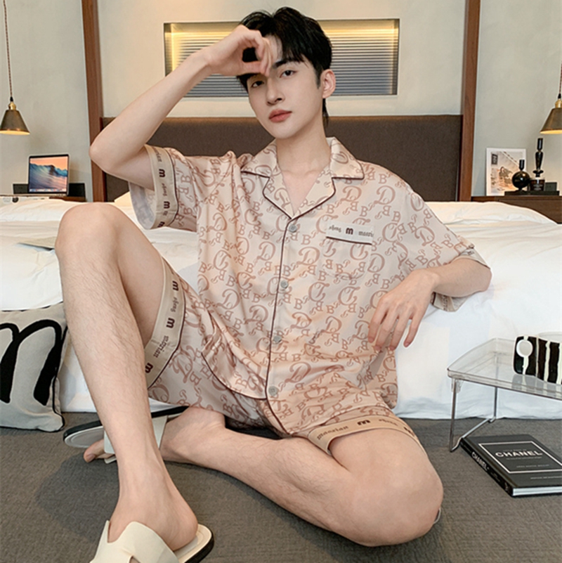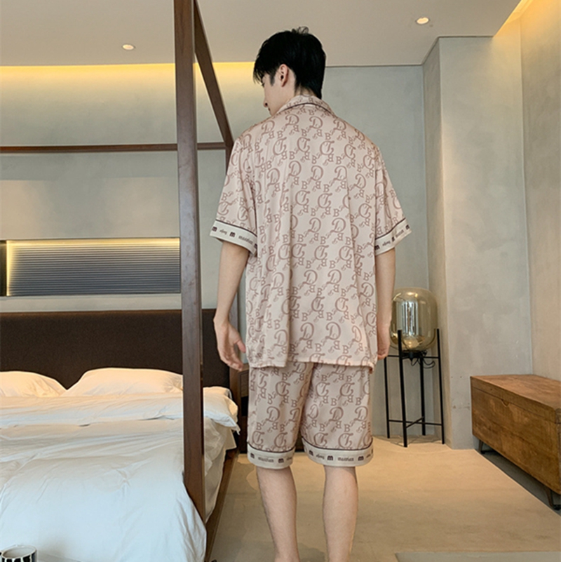 洛兰沙 2024新款夏季高级感轻奢香槟色男士睡衣V字领长裤长袖轻薄家居服可外穿 香槟短款