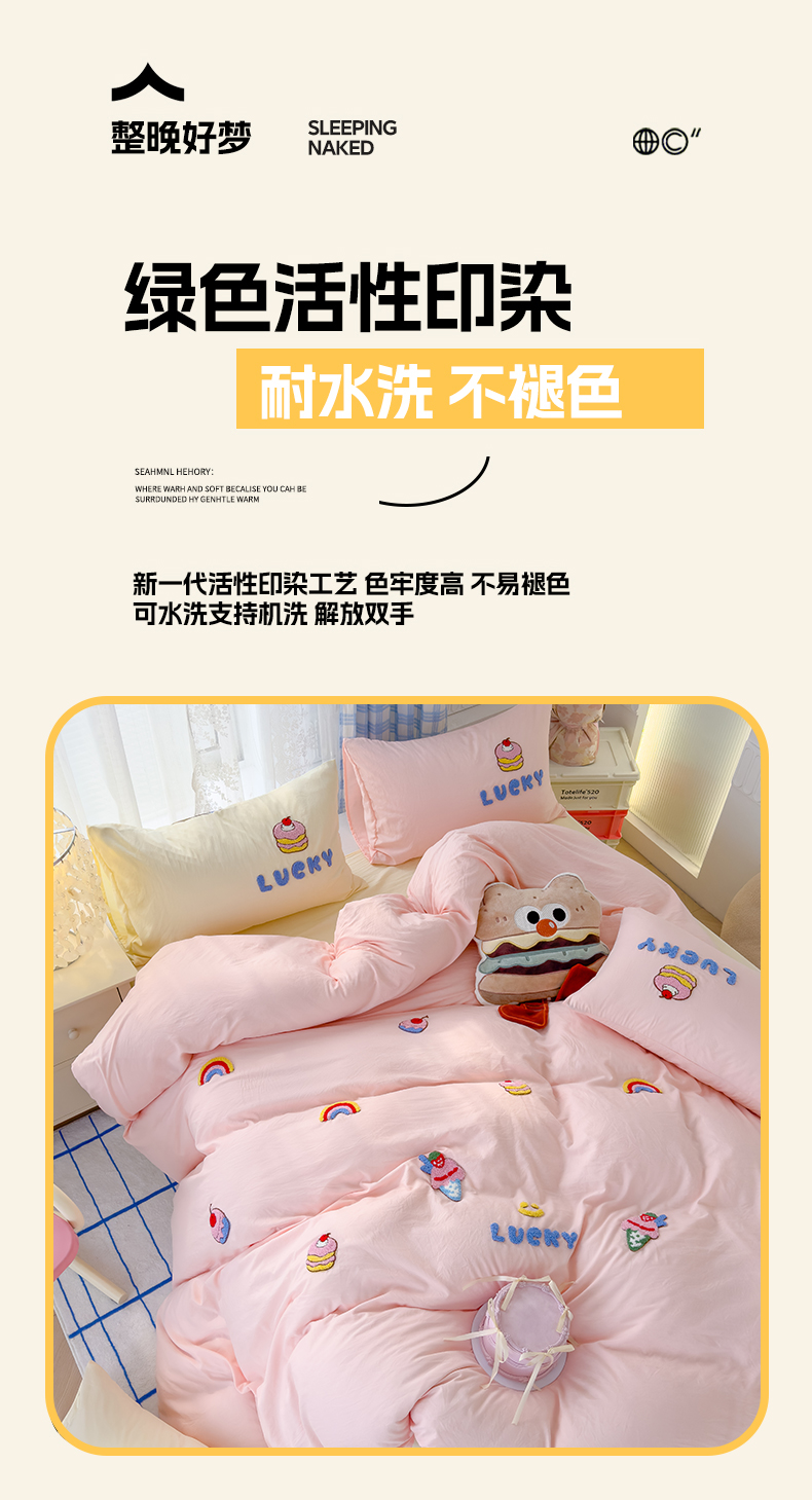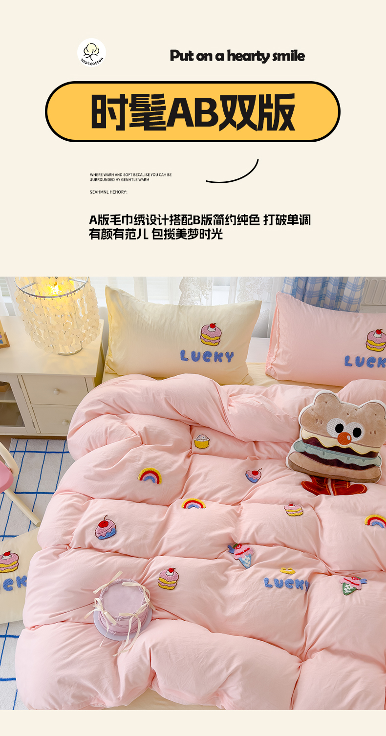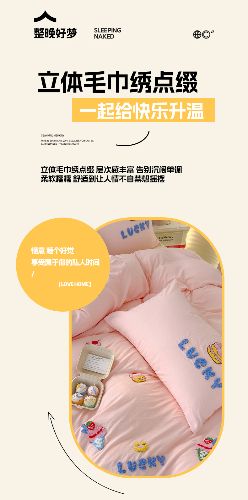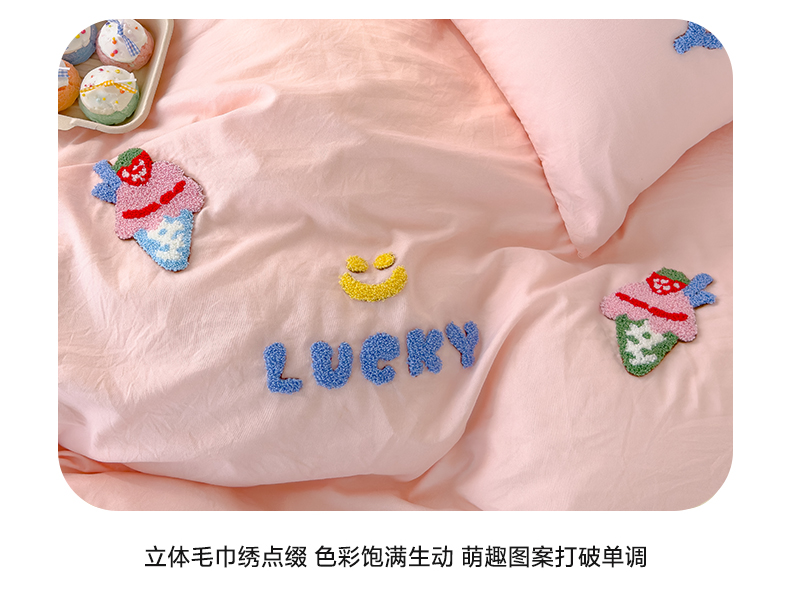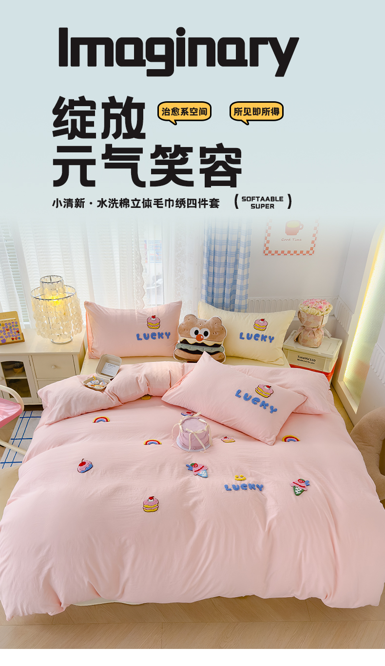 当前位置: 91家纺网 > 商品网购 > 床品套件 > 四件套 > 水洗棉四件套 > 颜选 2024新款小清新水洗棉立体毛巾绣四件套-生日派对 生日派对+粉玉