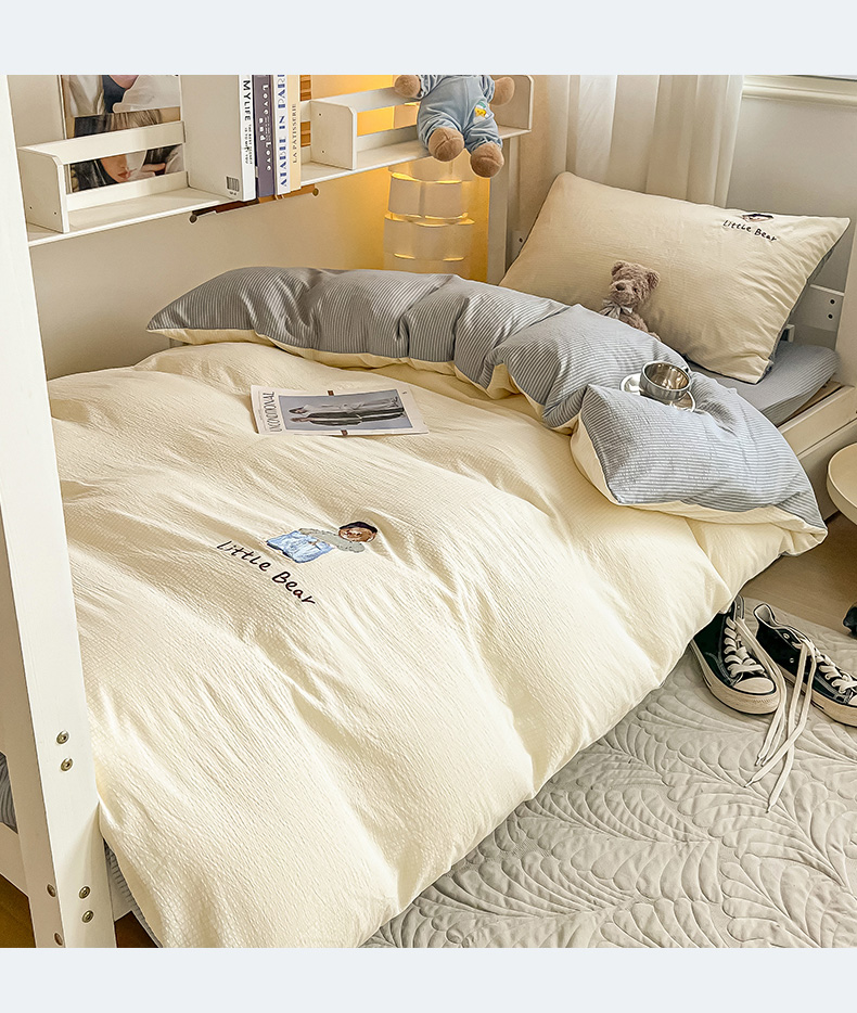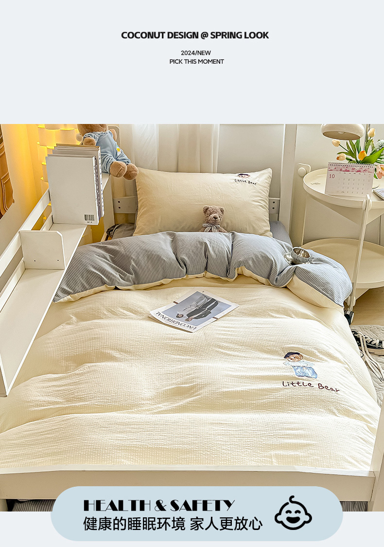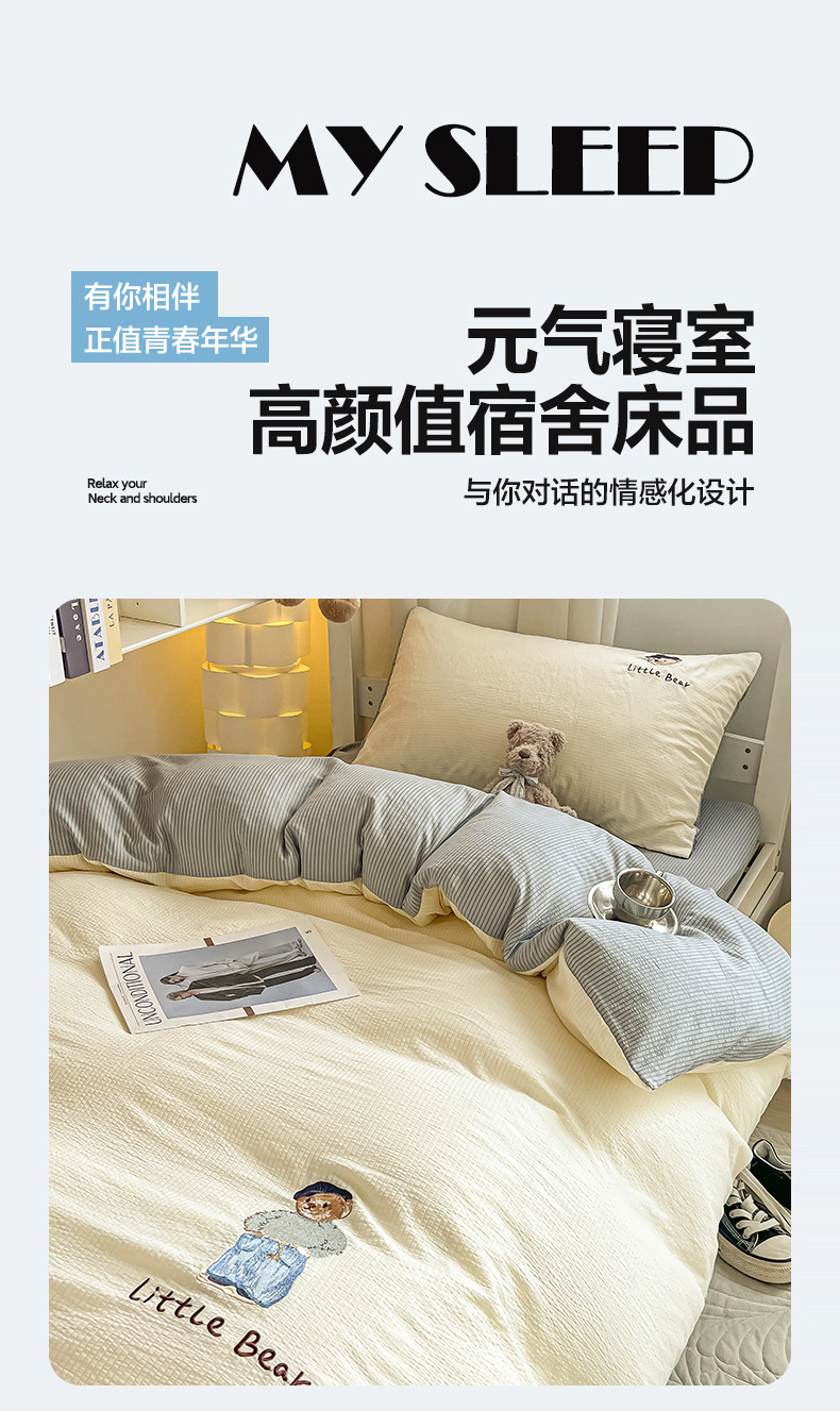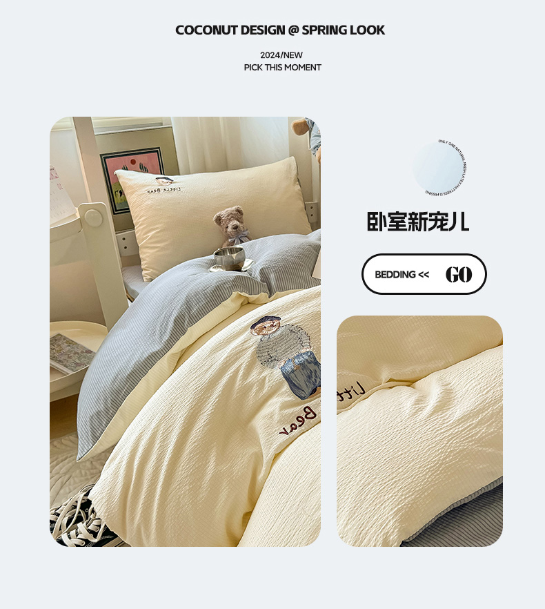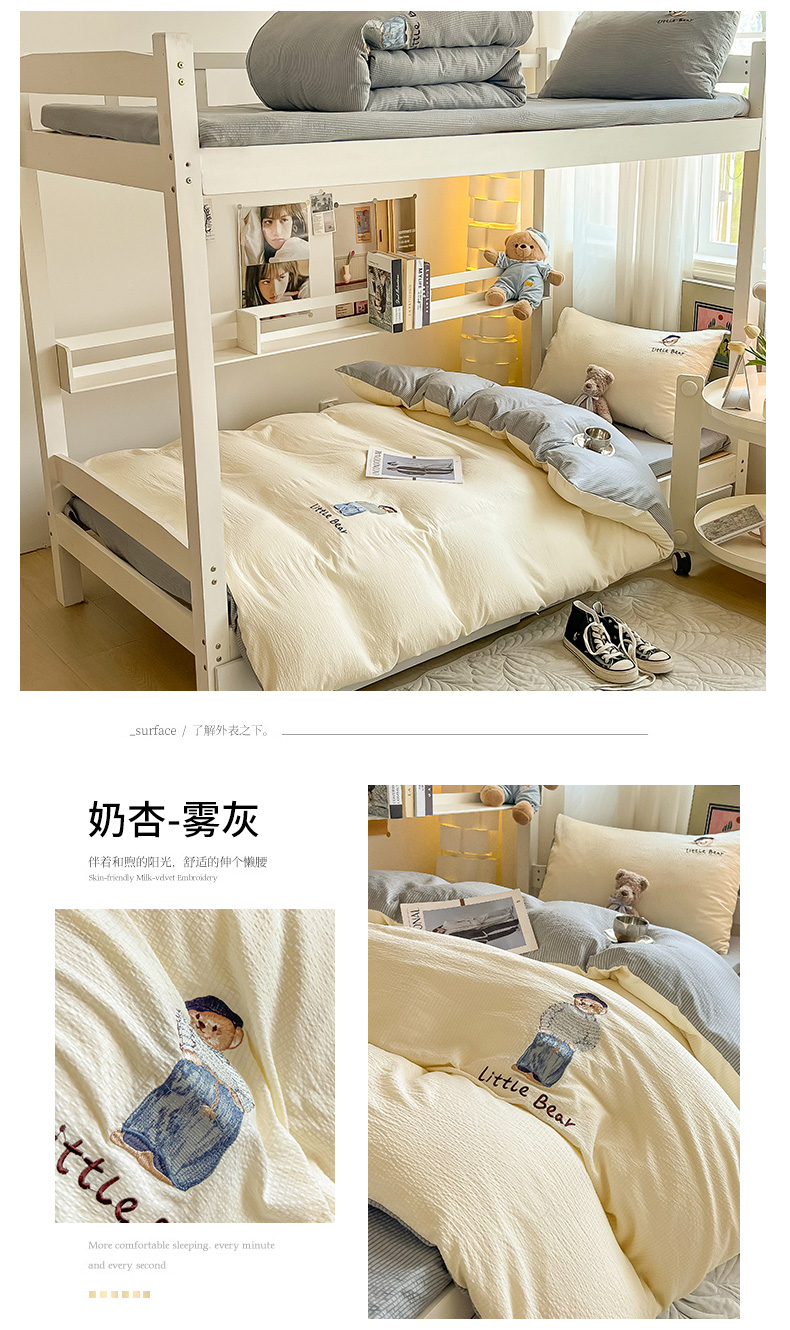 当前位置: 91家纺网 > 商品网购 > 床品套件 > 四件套 > 水洗棉四件套 > 眠帛家居 2024新款宿舍三件套水洗棉提花刺绣四件套熊先生 奶杏-雾灰