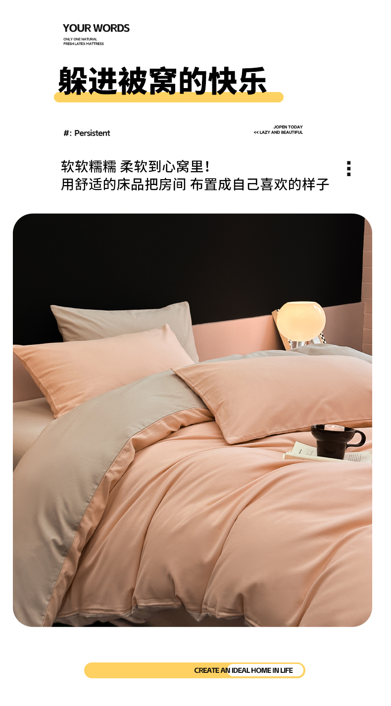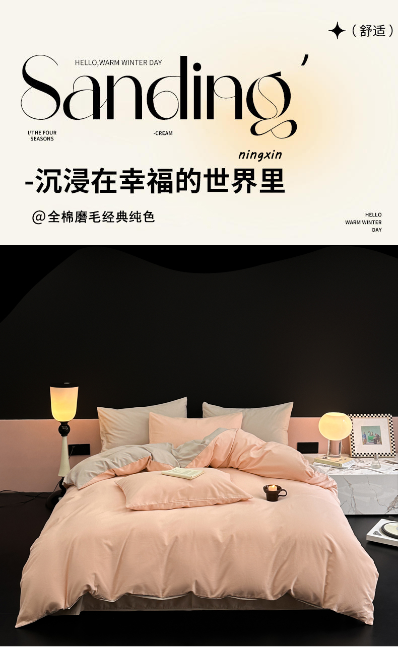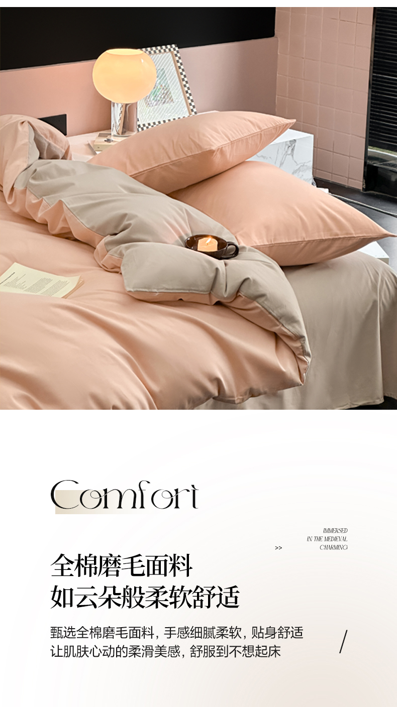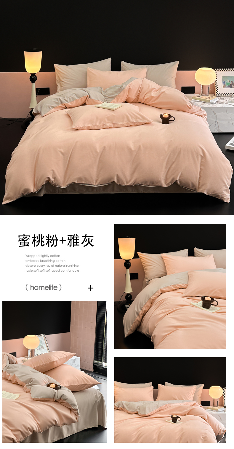 商品名称:柠馨 2024新款全棉磨毛纯色四件套-赫尔墨斯系列 2蜜桃粉+雅灰