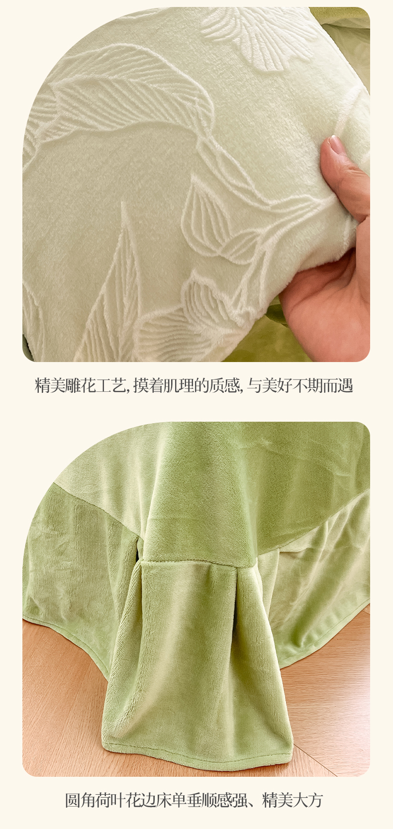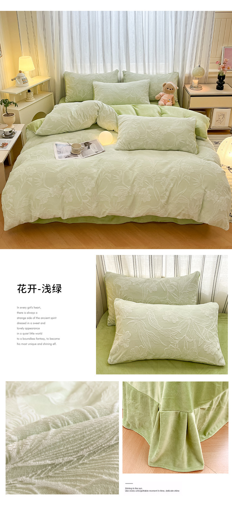 商品名称:绘萱家居 2025新款高克重雕花雕印纯色牛奶绒四件套双拼法莱绒珊瑚绒 花开-浅绿