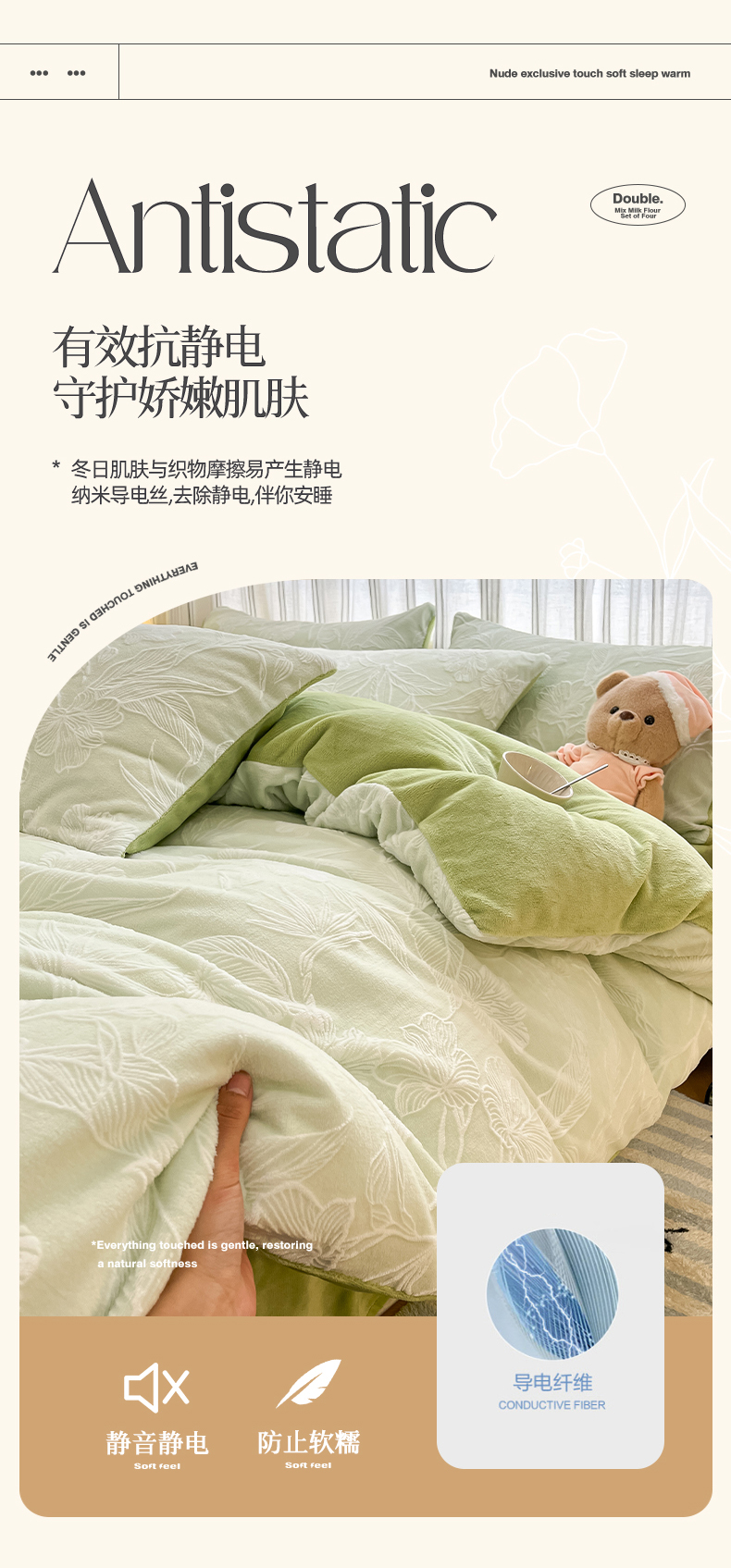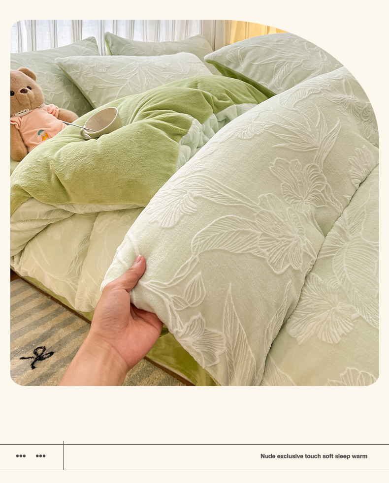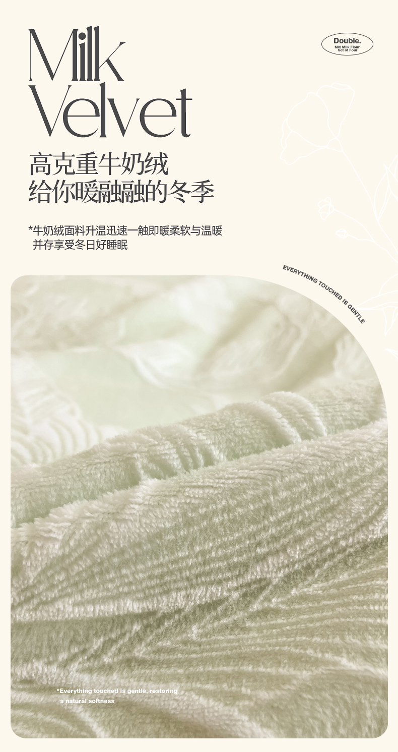 绘萱家居 2025新款高克重雕花雕印纯色牛奶绒四件套双拼法莱绒珊瑚绒 花开-浅绿