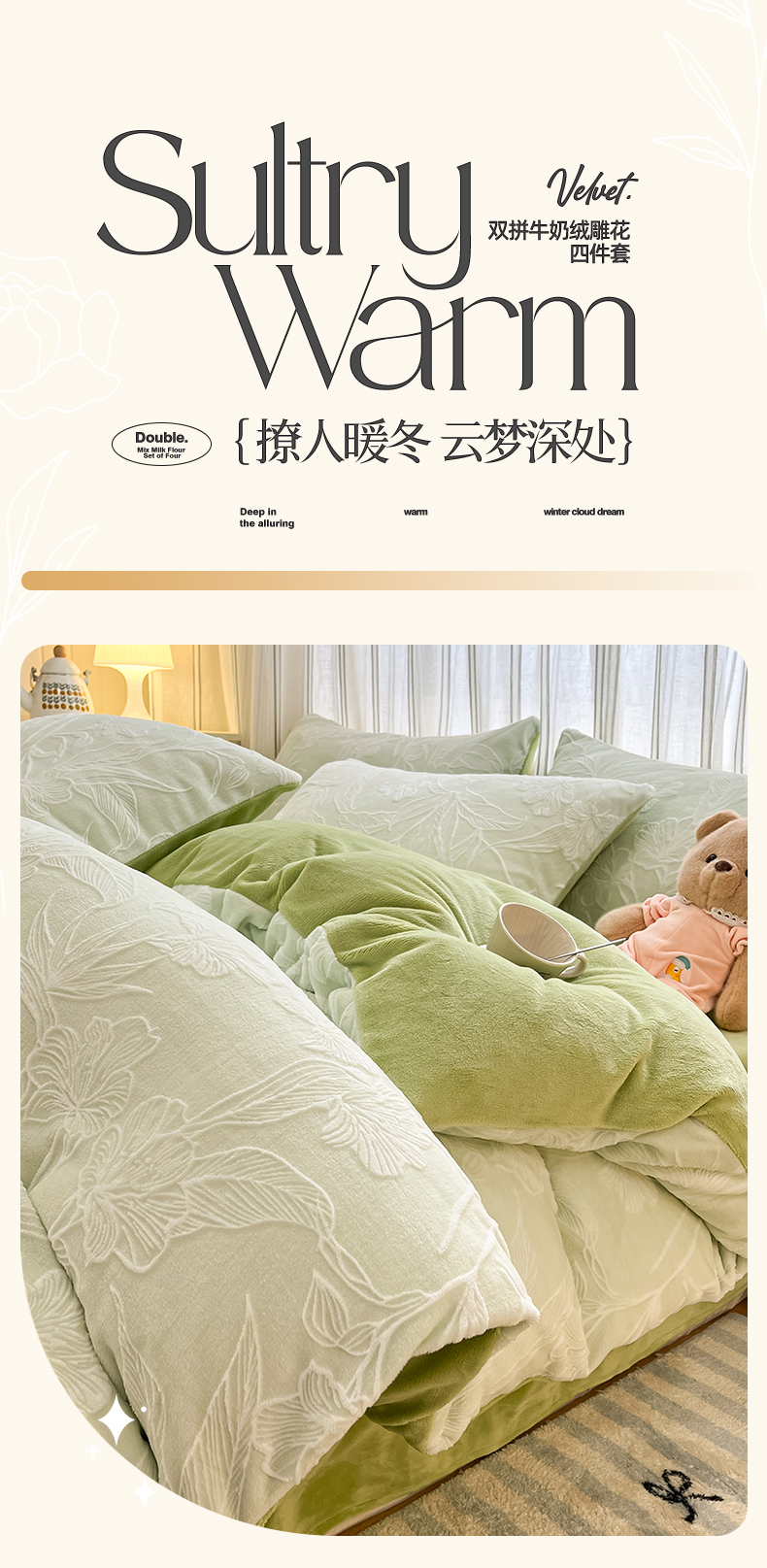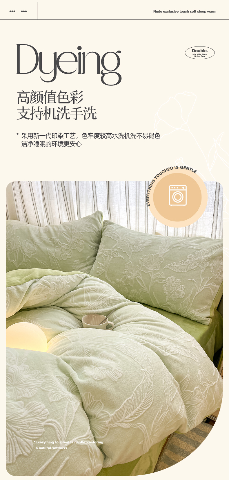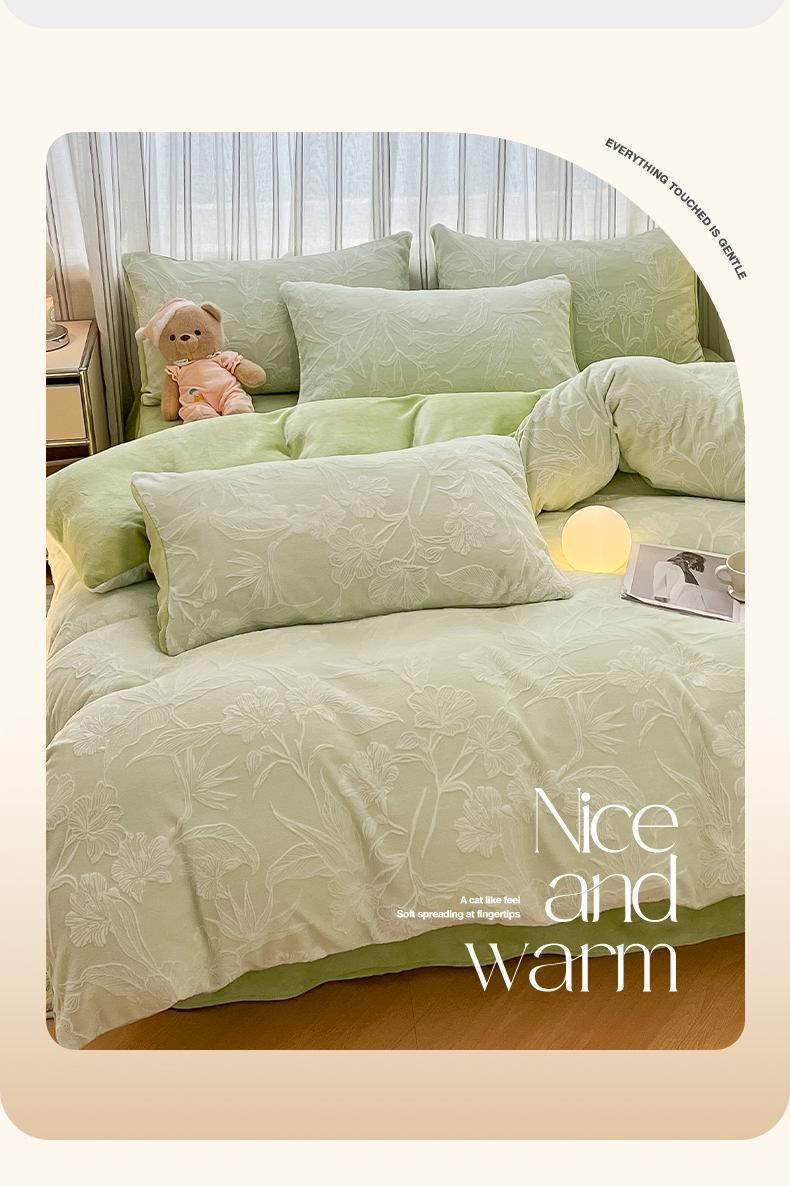 绘萱家居 2025新款高克重雕花雕印纯色牛奶绒四件套双拼法莱绒珊瑚绒 花开-浅绿