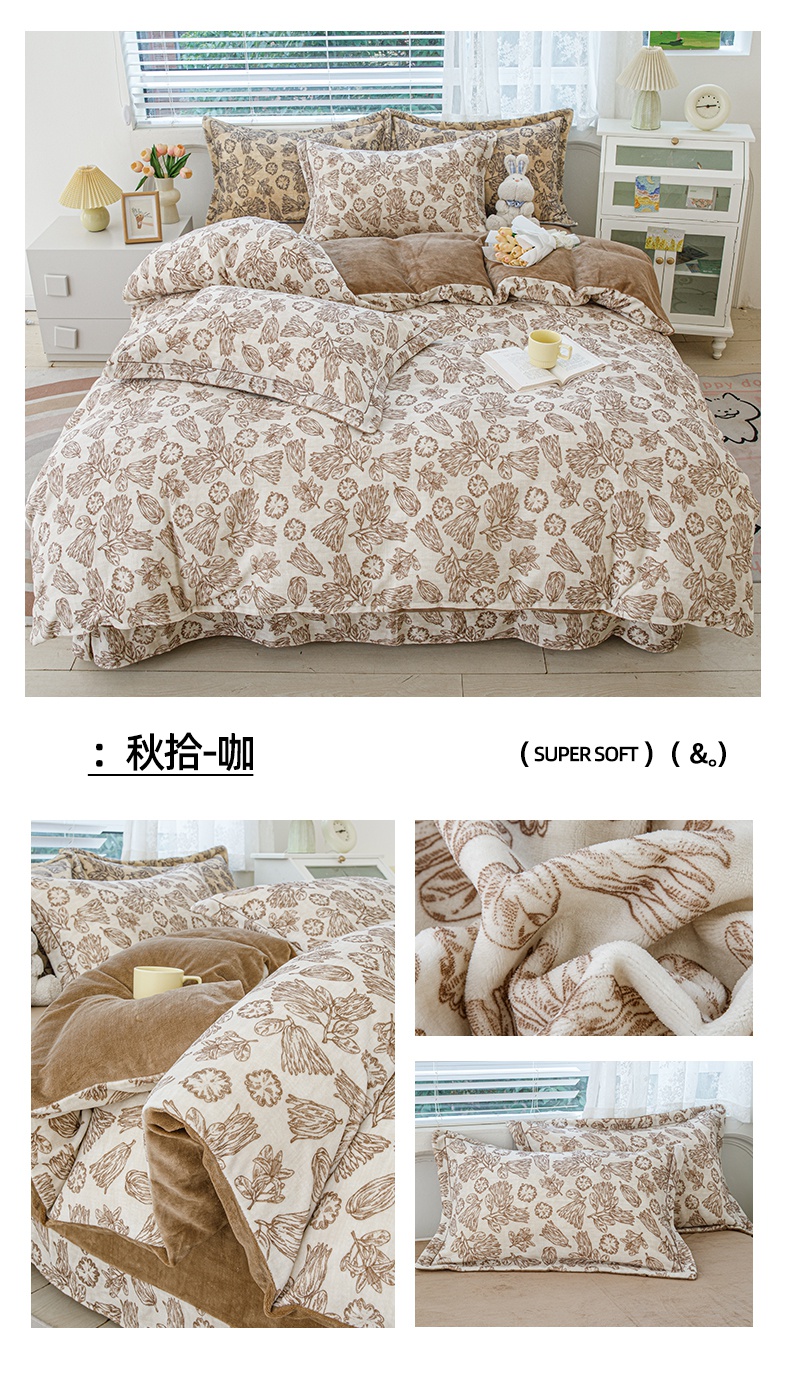 商品名称:锦罗绣 2024新款加厚牛奶绒四件套印花四件套单被套 秋拾-咖