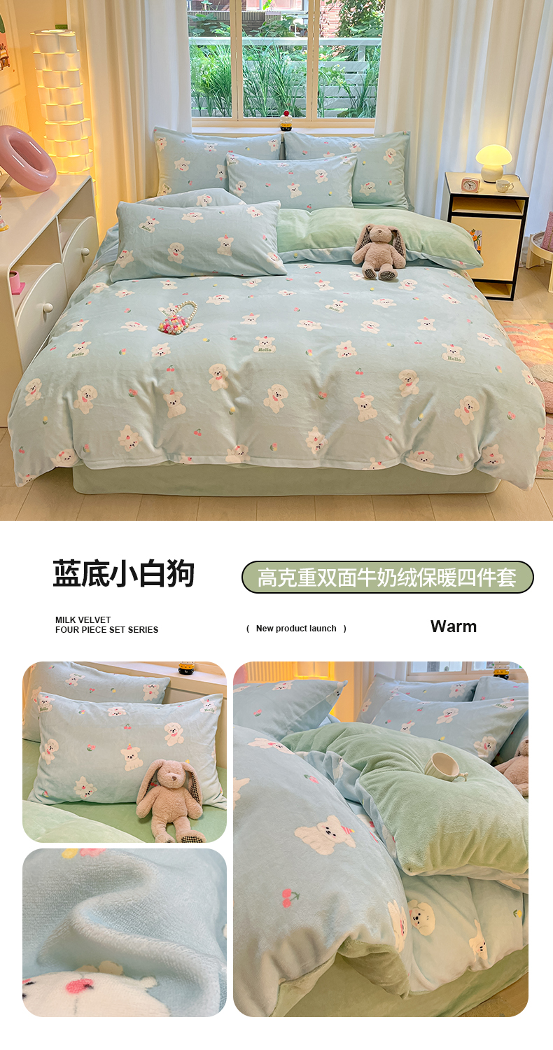 商品名称:铭宣家居 2024新款7斤小清新高克重牛奶绒印花四件套床单床笠款 蓝底小白狗