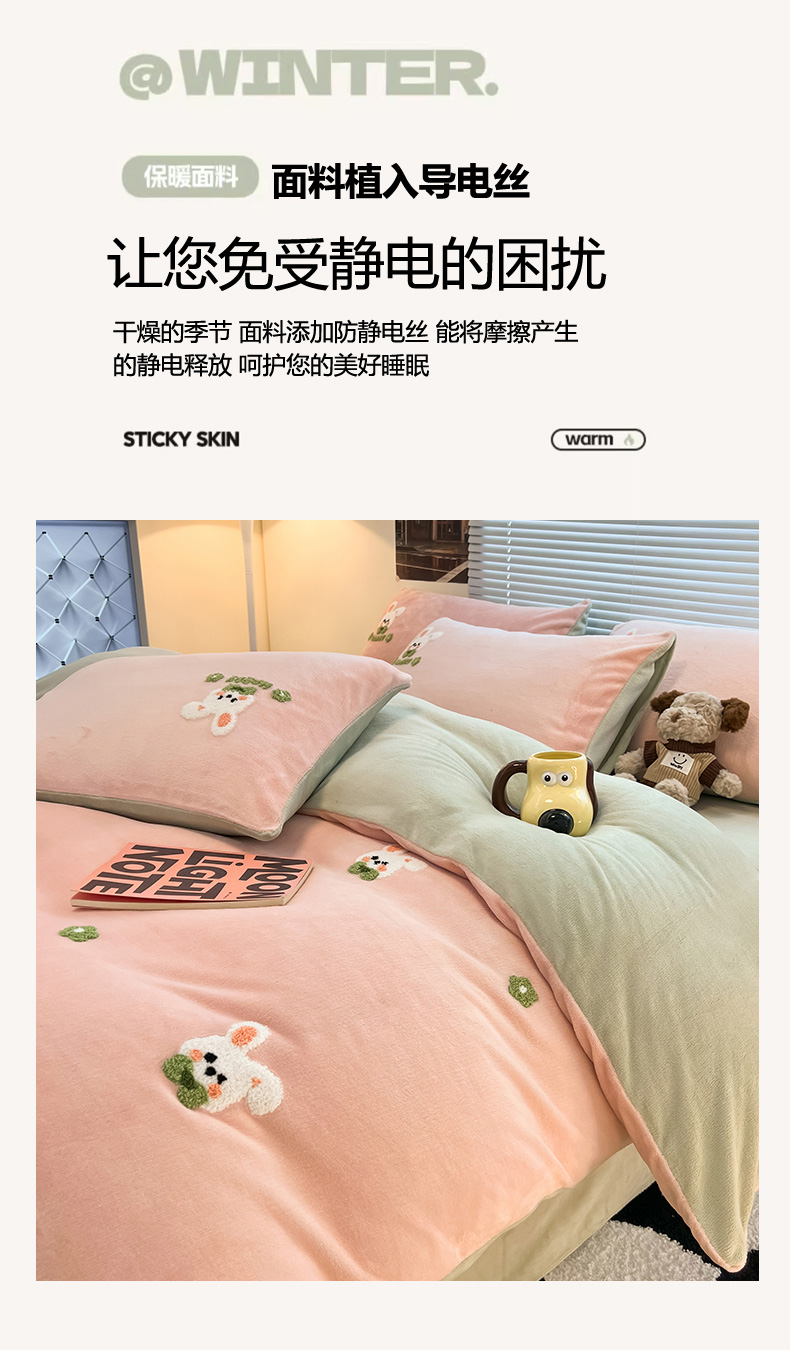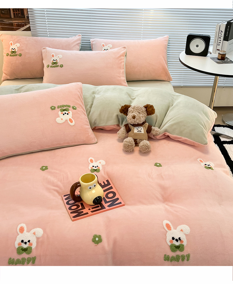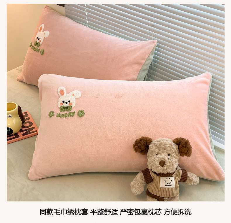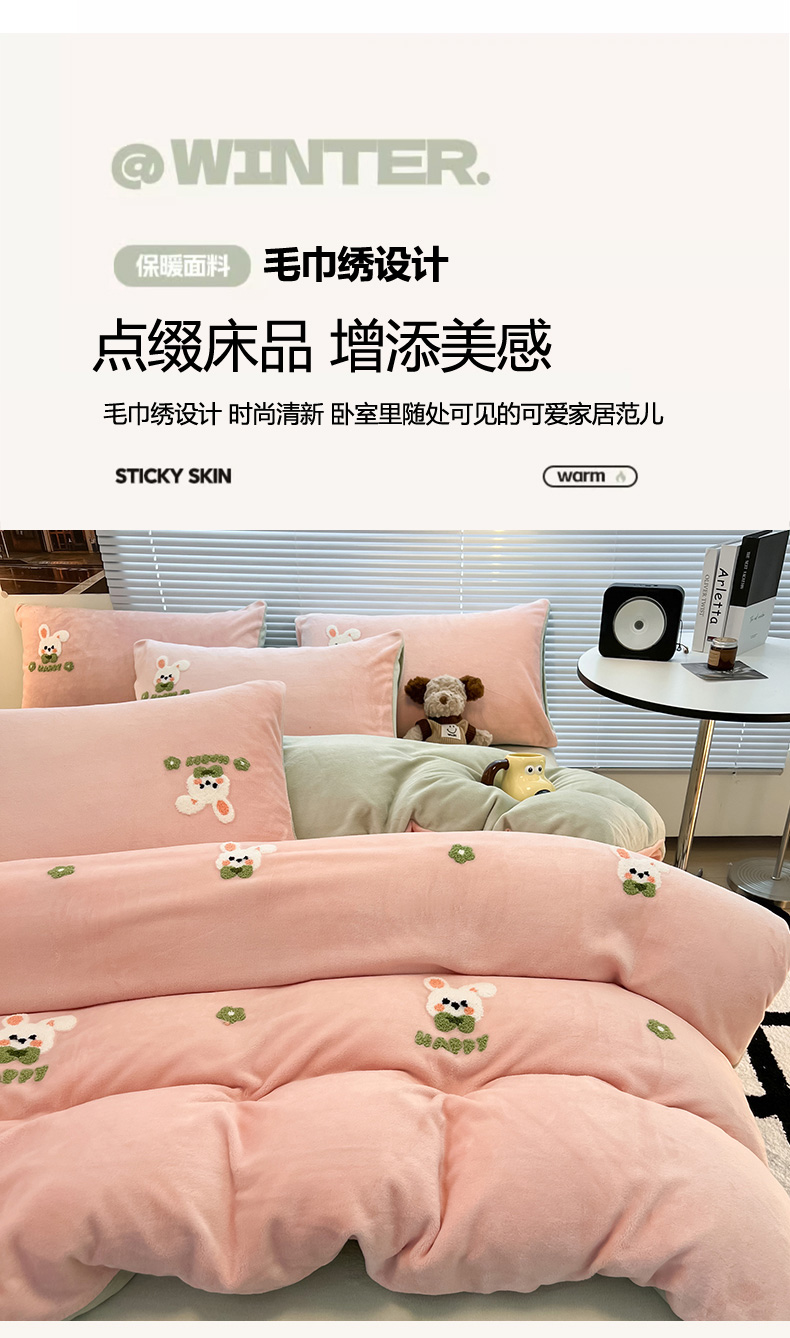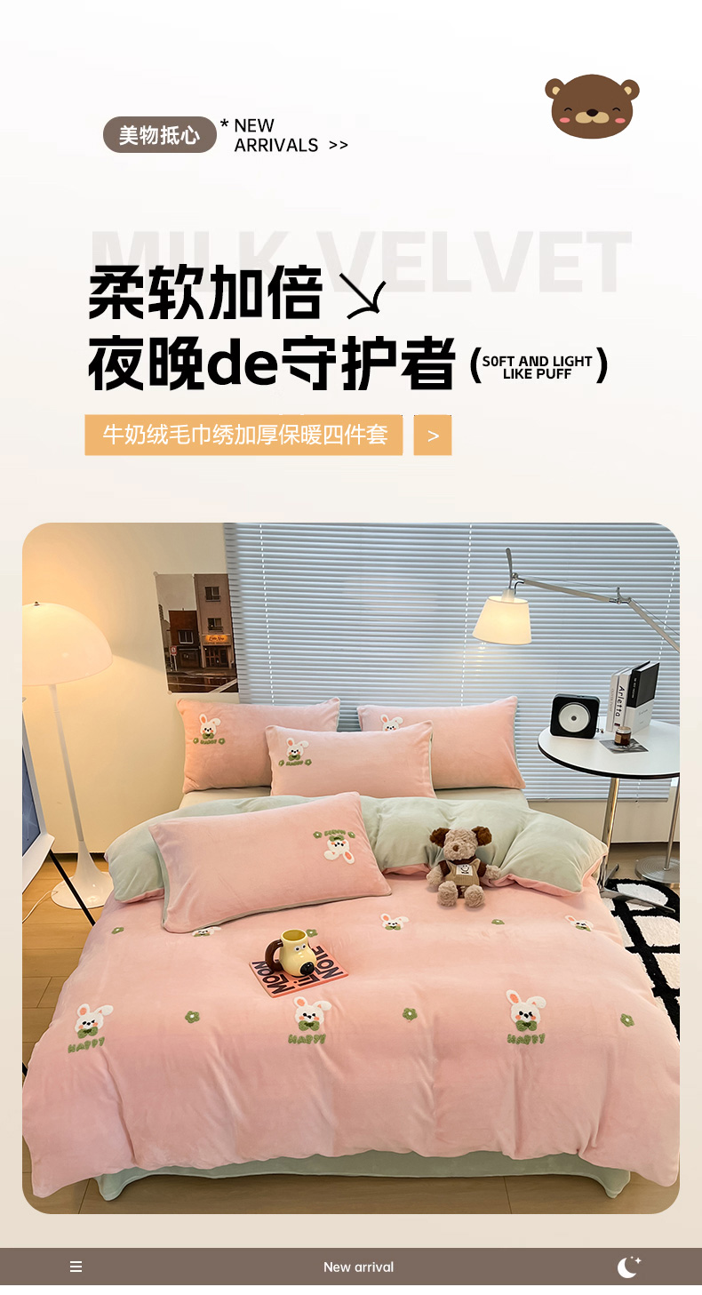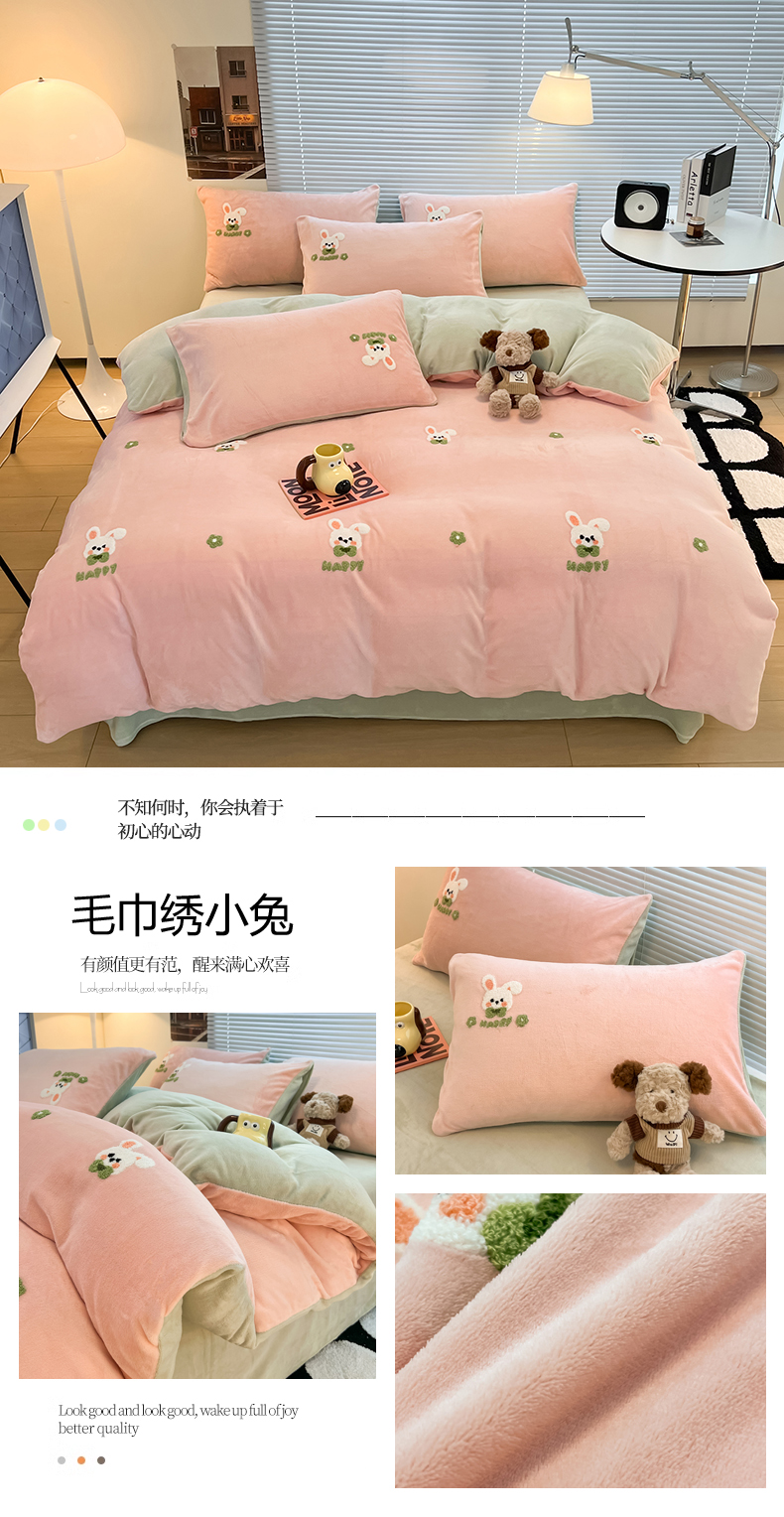 当前位置: 91家纺网 > 商品网购 > 床品套件 > 四件套 > 牛奶绒四件套 > 2024新款A类高克重牛奶绒毛巾绣加厚保暖系列四件套 毛巾绣小兔