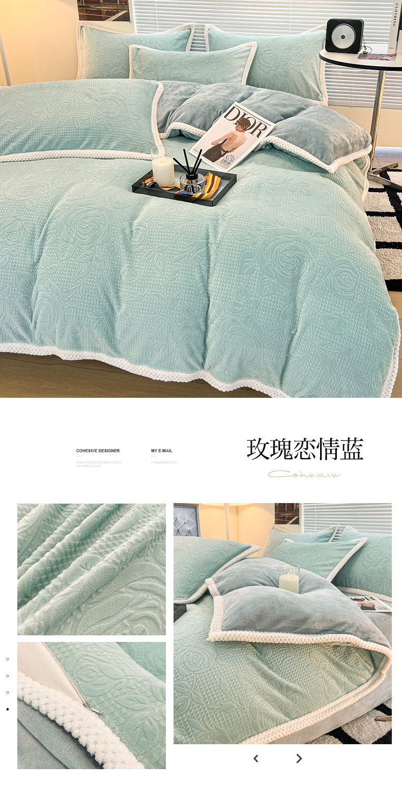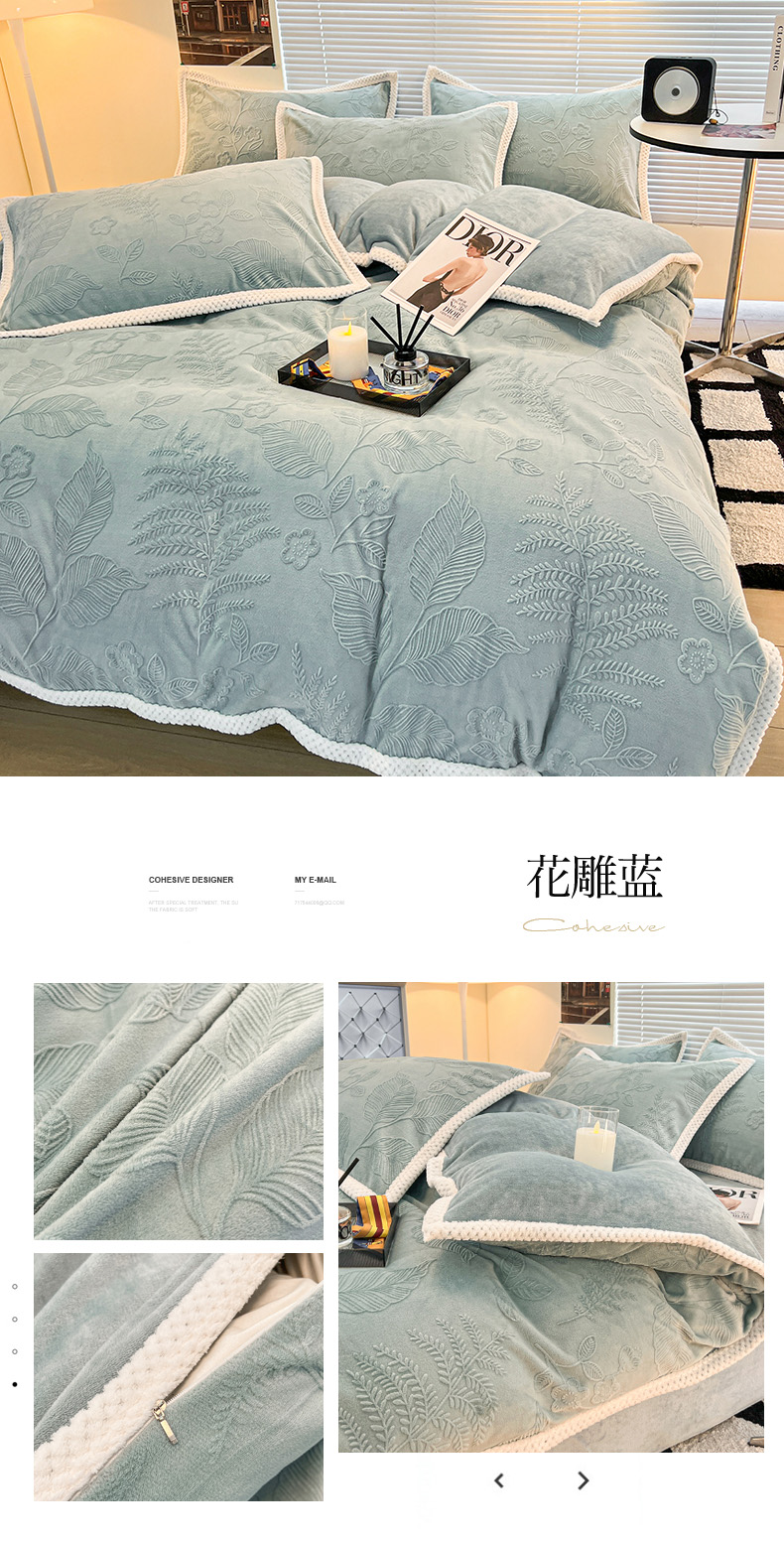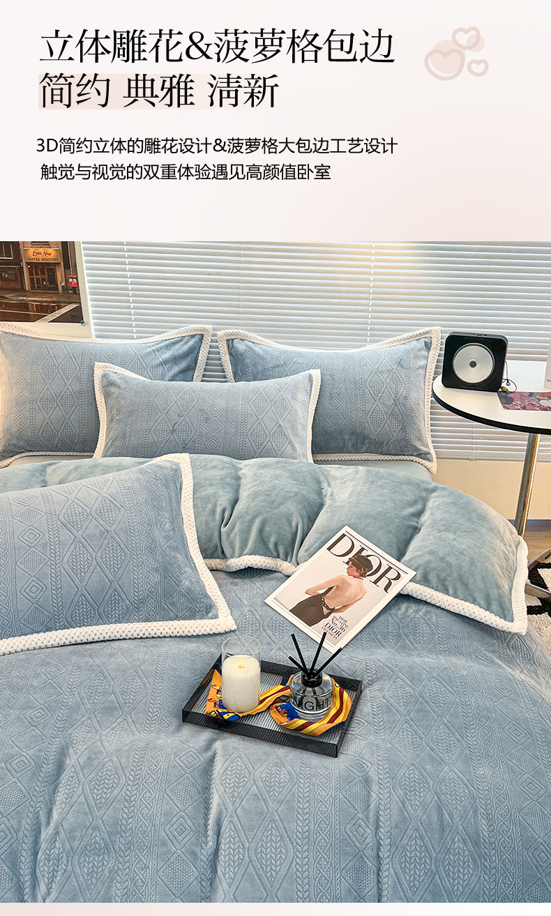 (总)倾慕 2025新款兔绒立体雕花加厚保暖系列四件套,爱娜玉,春絮蓝,春絮绿,伊宁玉,伊宁紫,优朵粉,珍妮粉,珍妮湖蓝