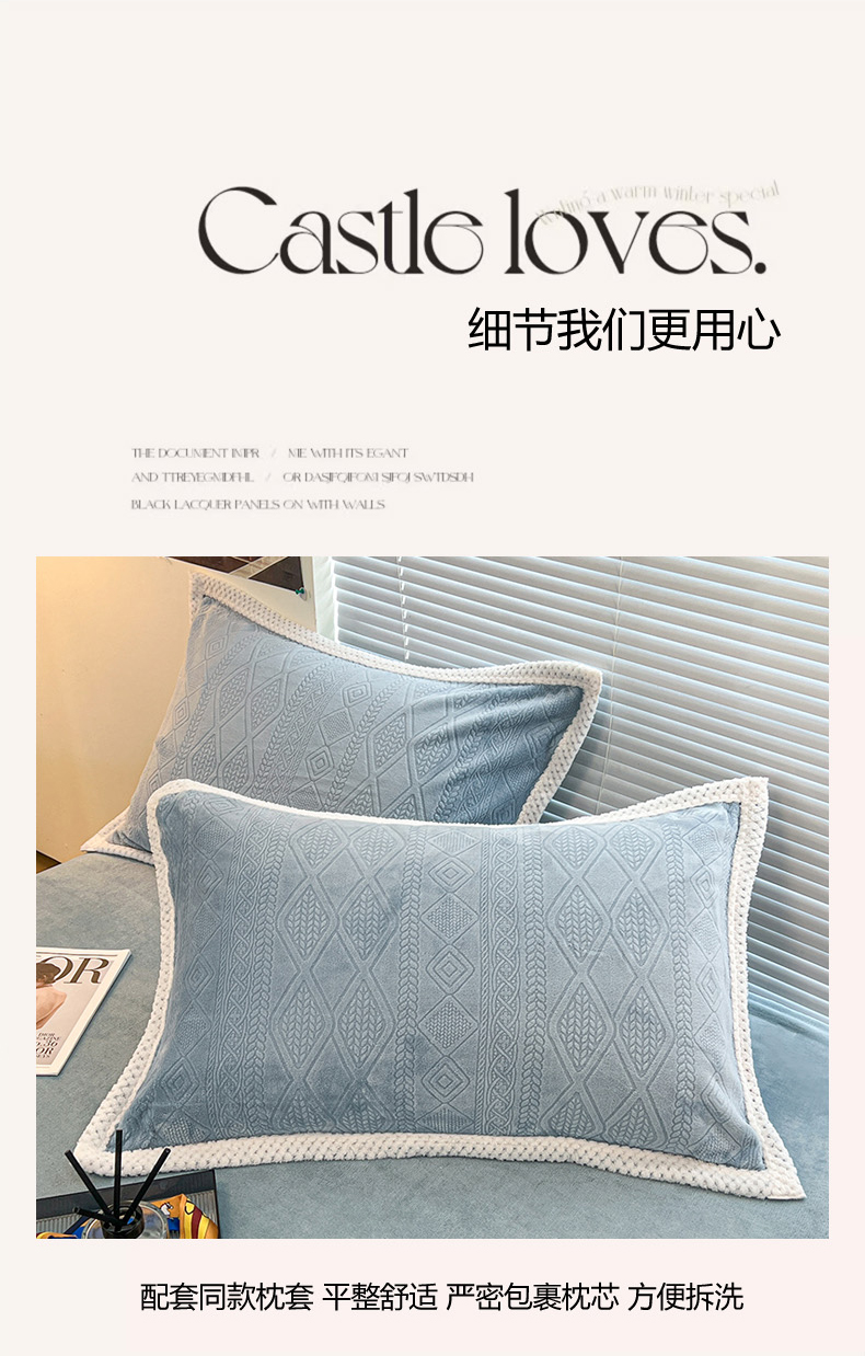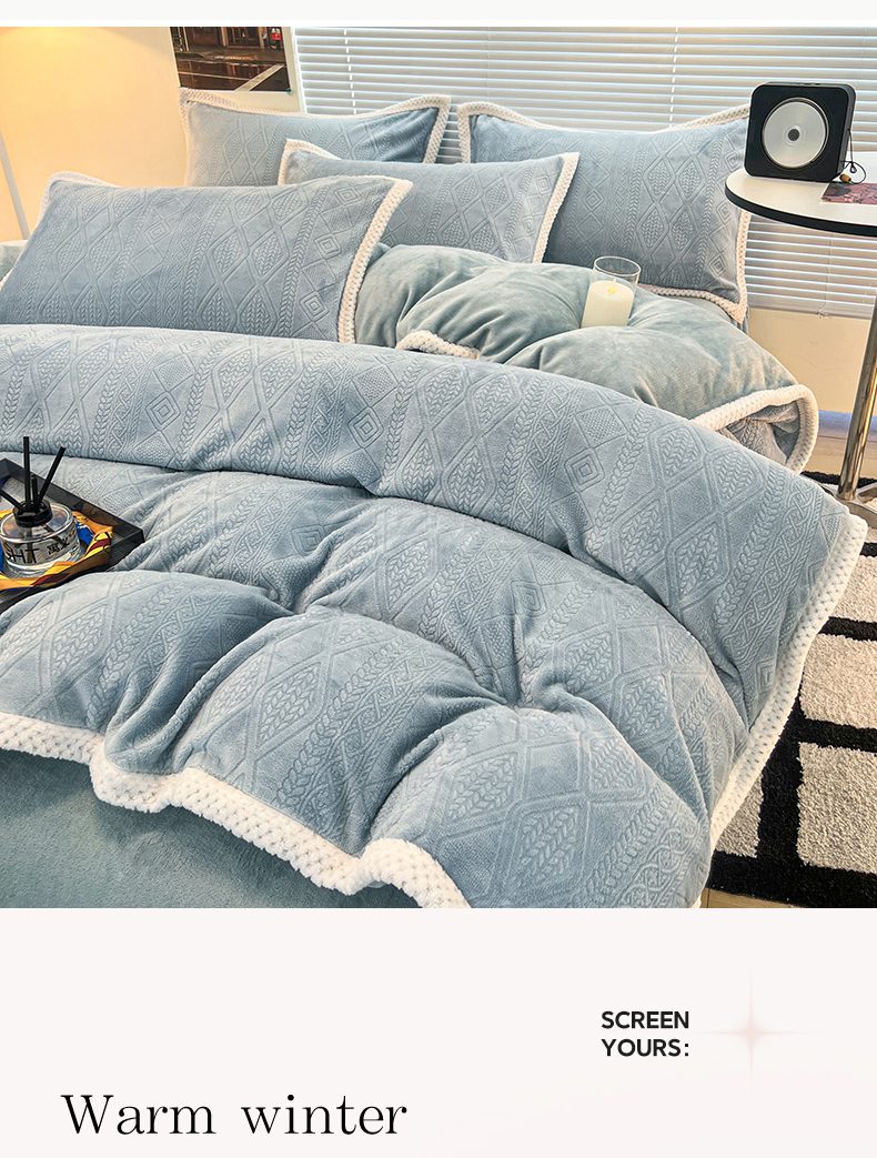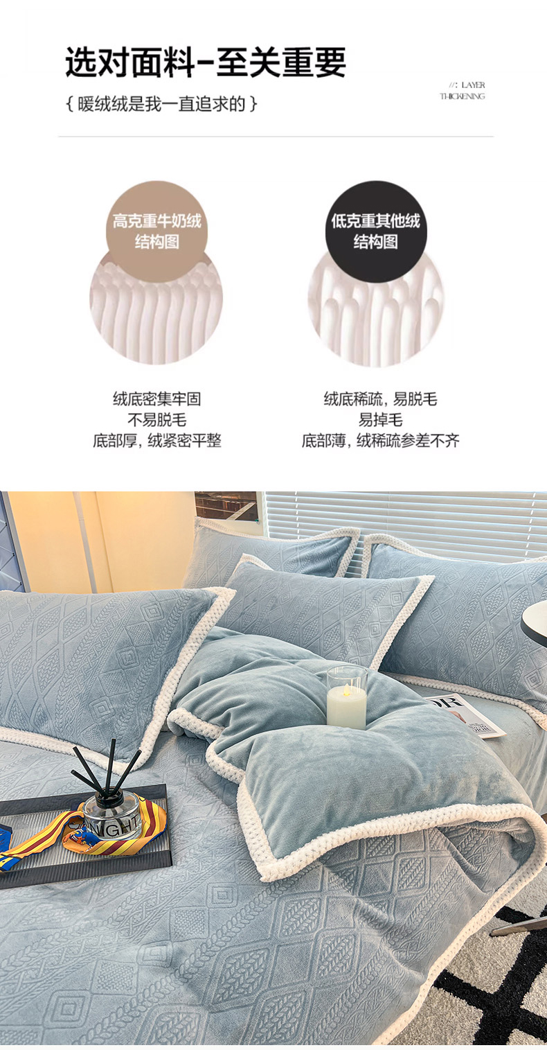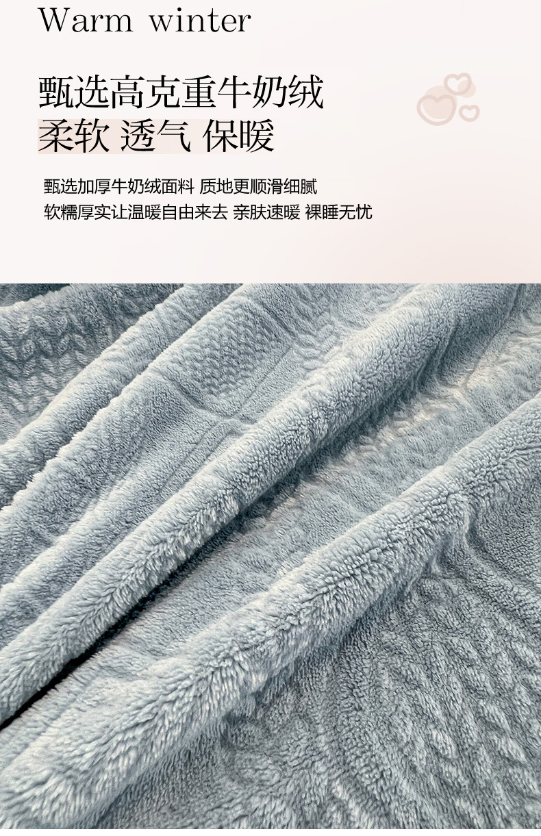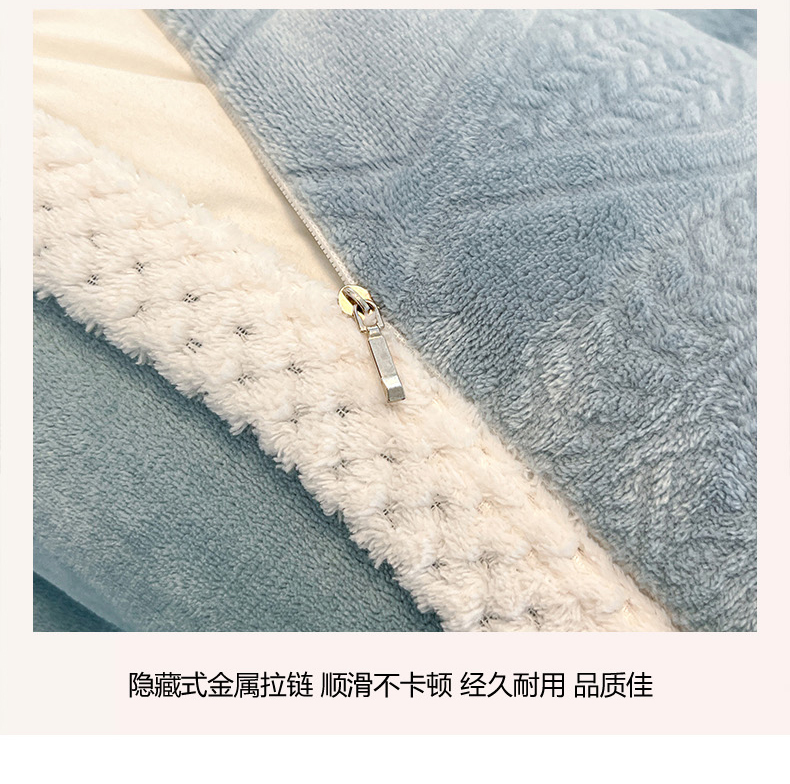 商品名称:2024新款A类高克重3D立体雕花牛奶绒保暖系列套件单品-被套 新暖意冰雪蓝