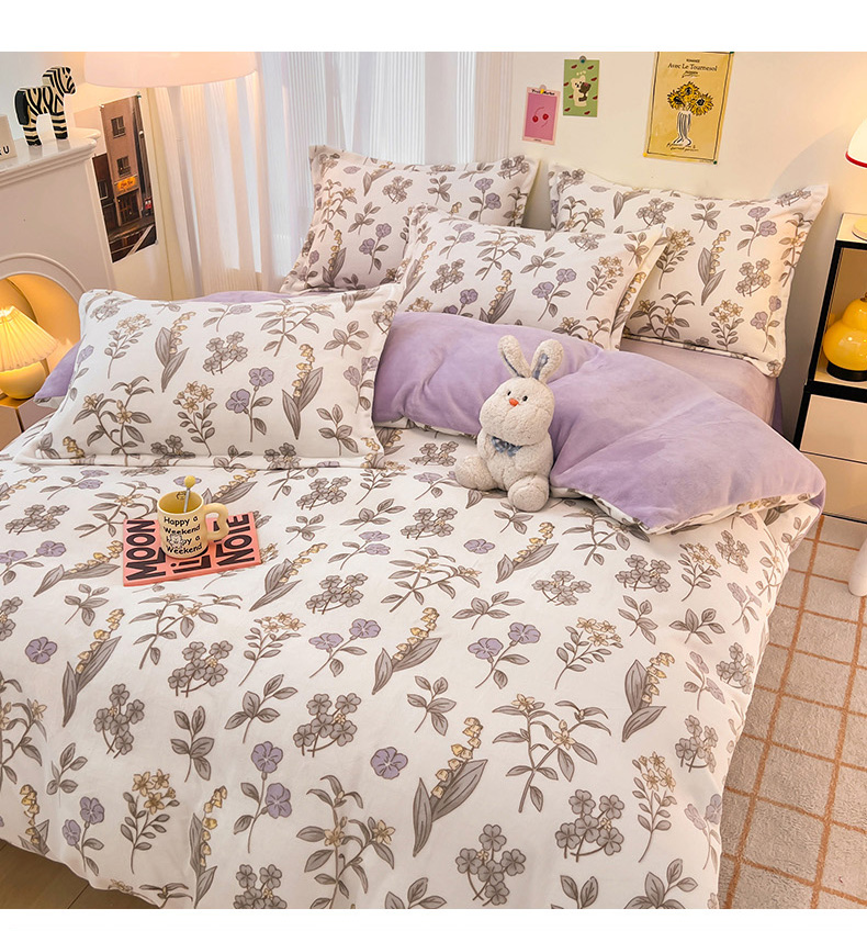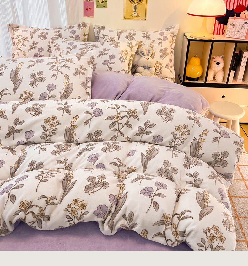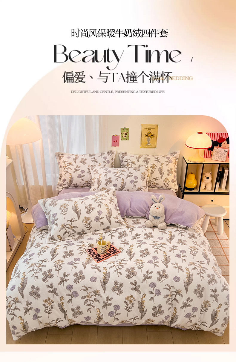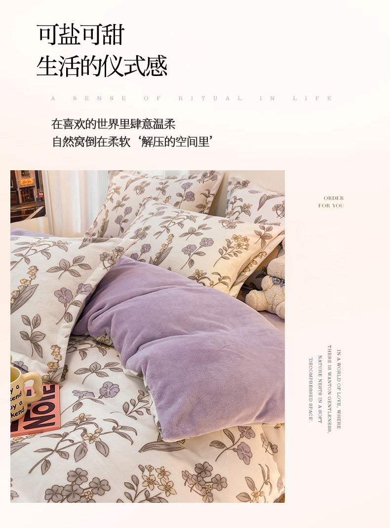 当前位置: 91家纺网 > 商品网购 > 床品套件 > 四件套 > 牛奶绒四件套 > 2024新款A类高克重时尚风牛奶绒加厚保暖系列套件单品-四件套 小紫花