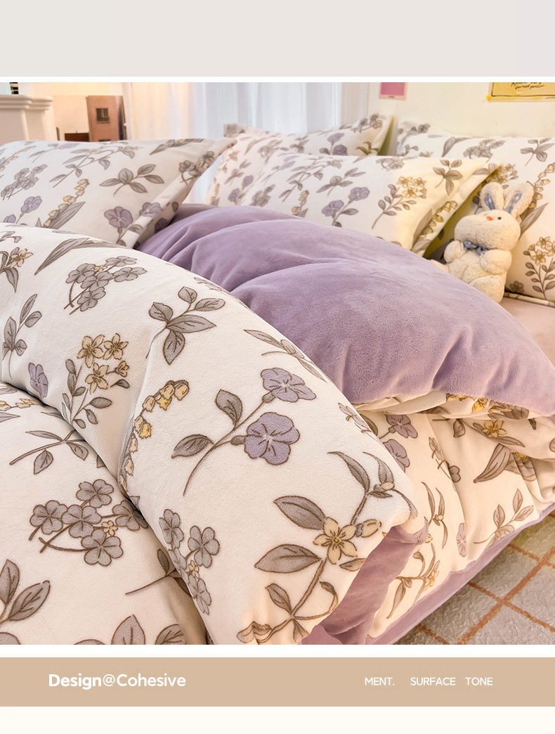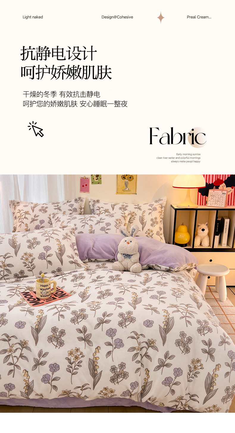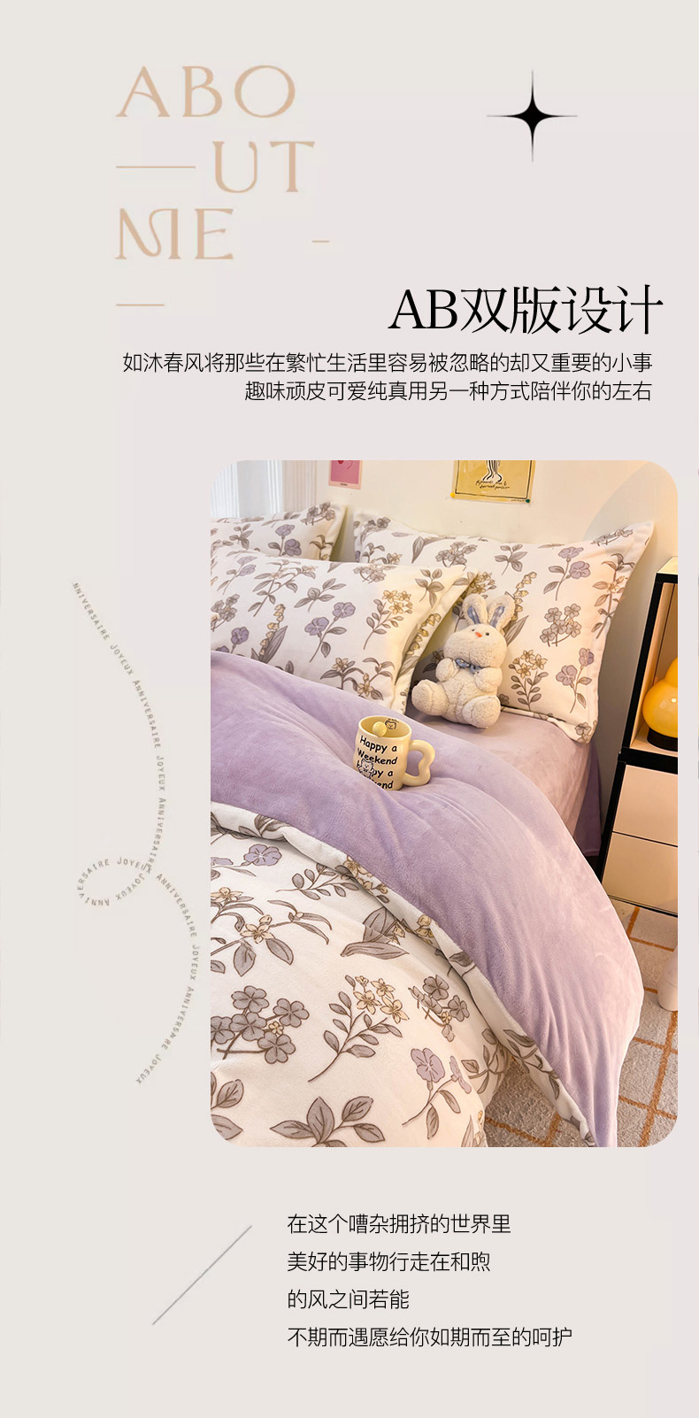当前位置: 91家纺网 > 商品网购 > 床品套件 > 四件套 > 牛奶绒四件套 > 2024新款A类高克重时尚风牛奶绒加厚保暖系列套件单品-四件套 小紫花