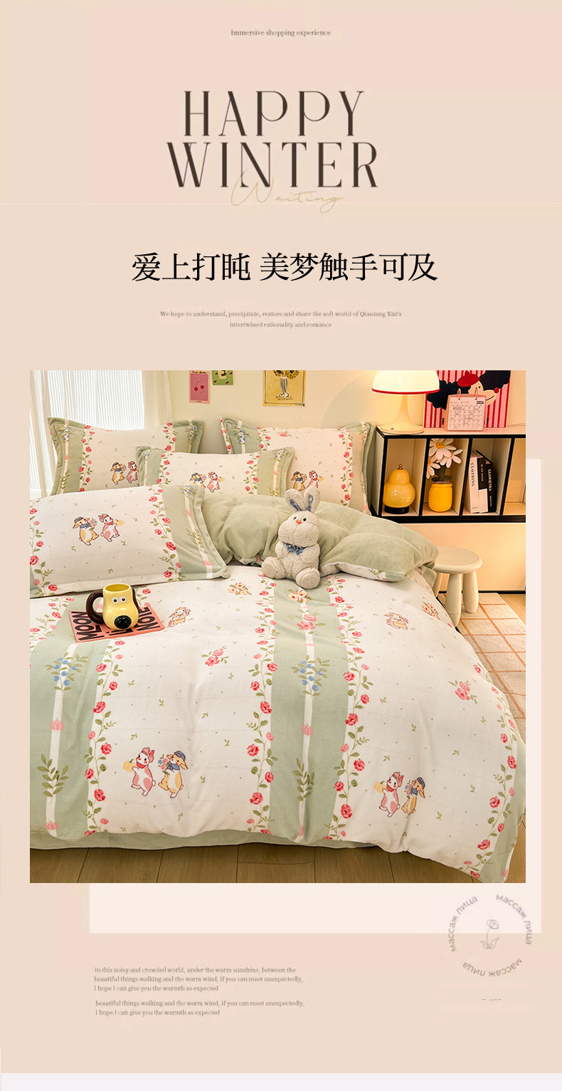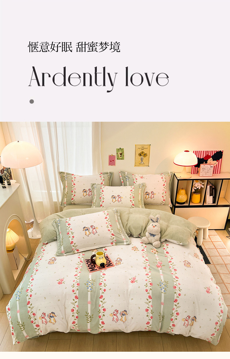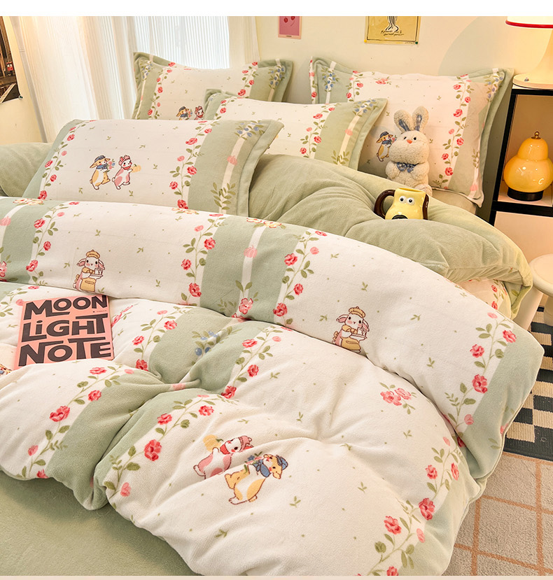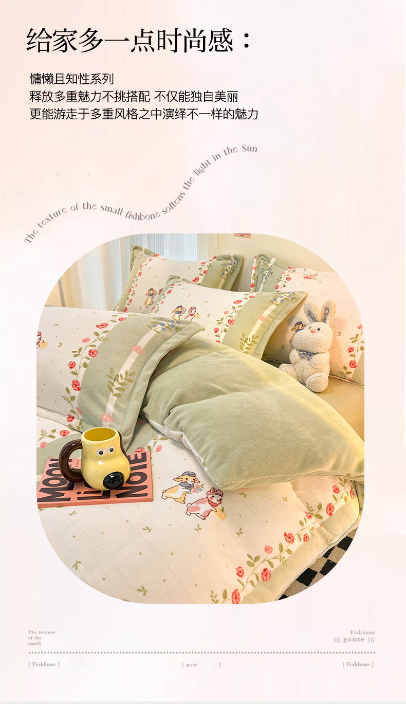 (总)倾慕家纺 2025新款卡通毛巾绣加厚保暖牛奶绒四件套,爱心女孩,咖啡小狗,猫咪熊兔,迷你小车,圣诞树熊,音乐企鹅