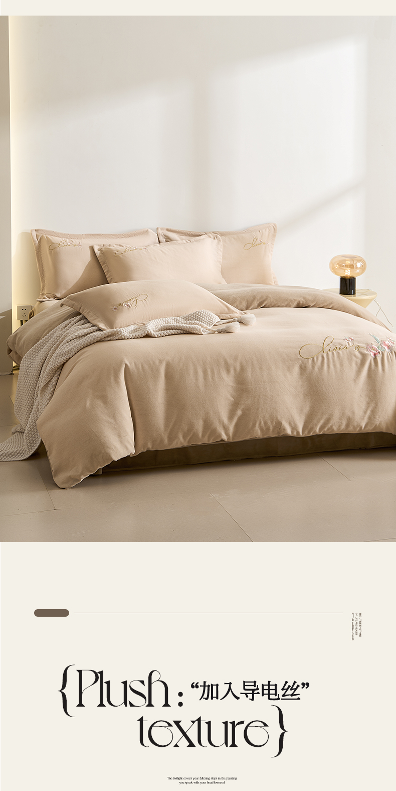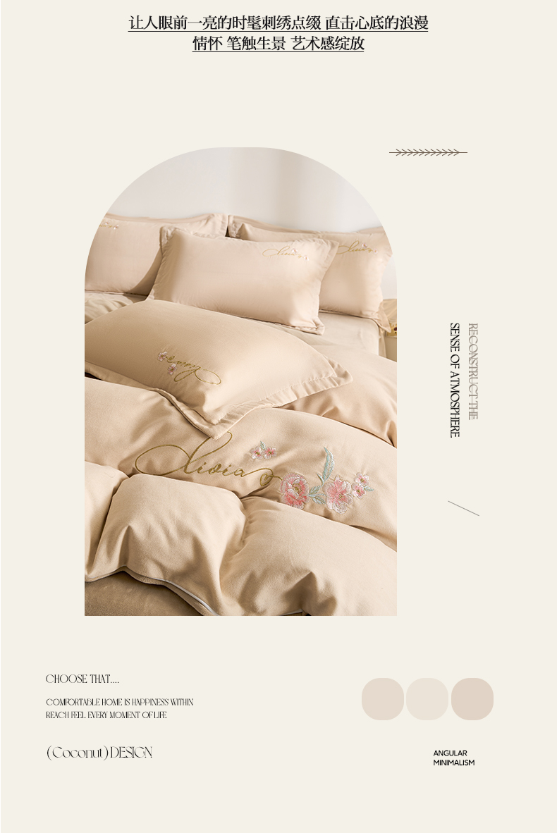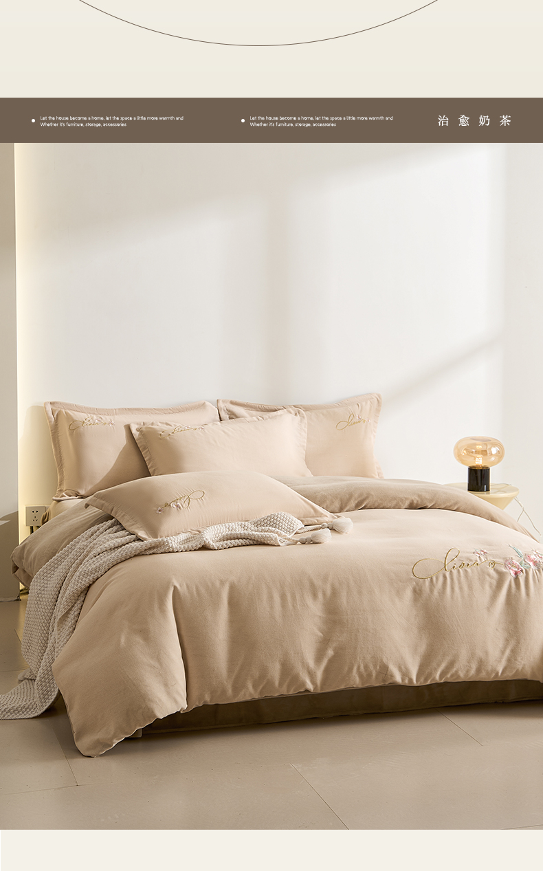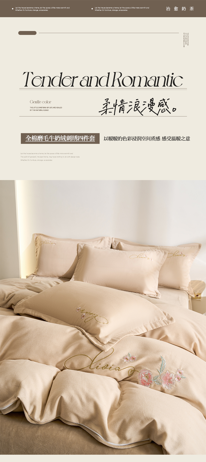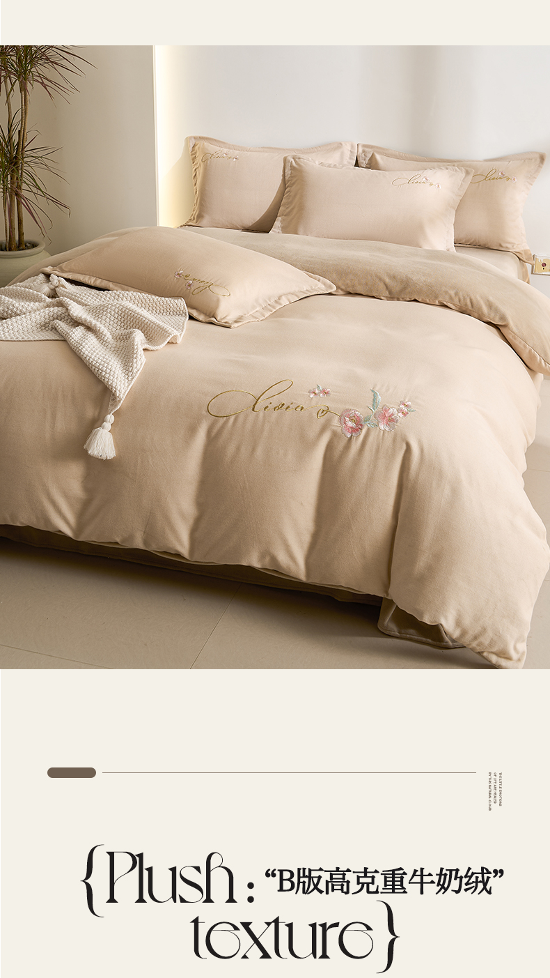 慕希家纺 2024新款全棉磨毛牛奶绒刺绣四件套-春暖花开 春暖花开-奶杏