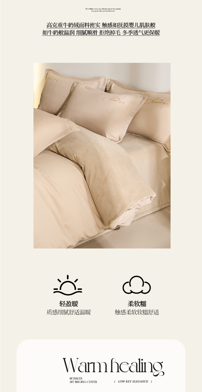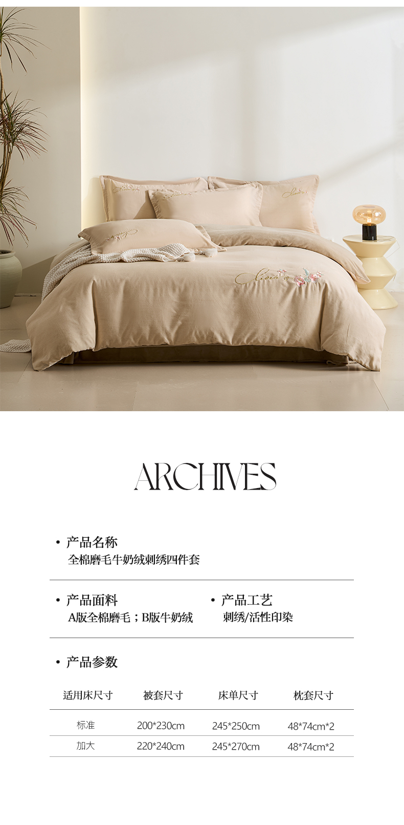 商品名称:慕希家纺 2024新款全棉磨毛牛奶绒刺绣四件套-春暖花开 春暖花开-奶杏