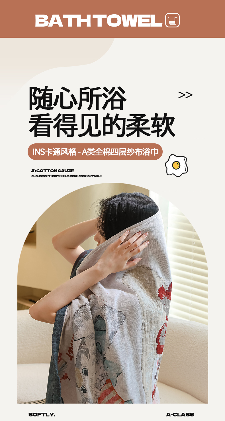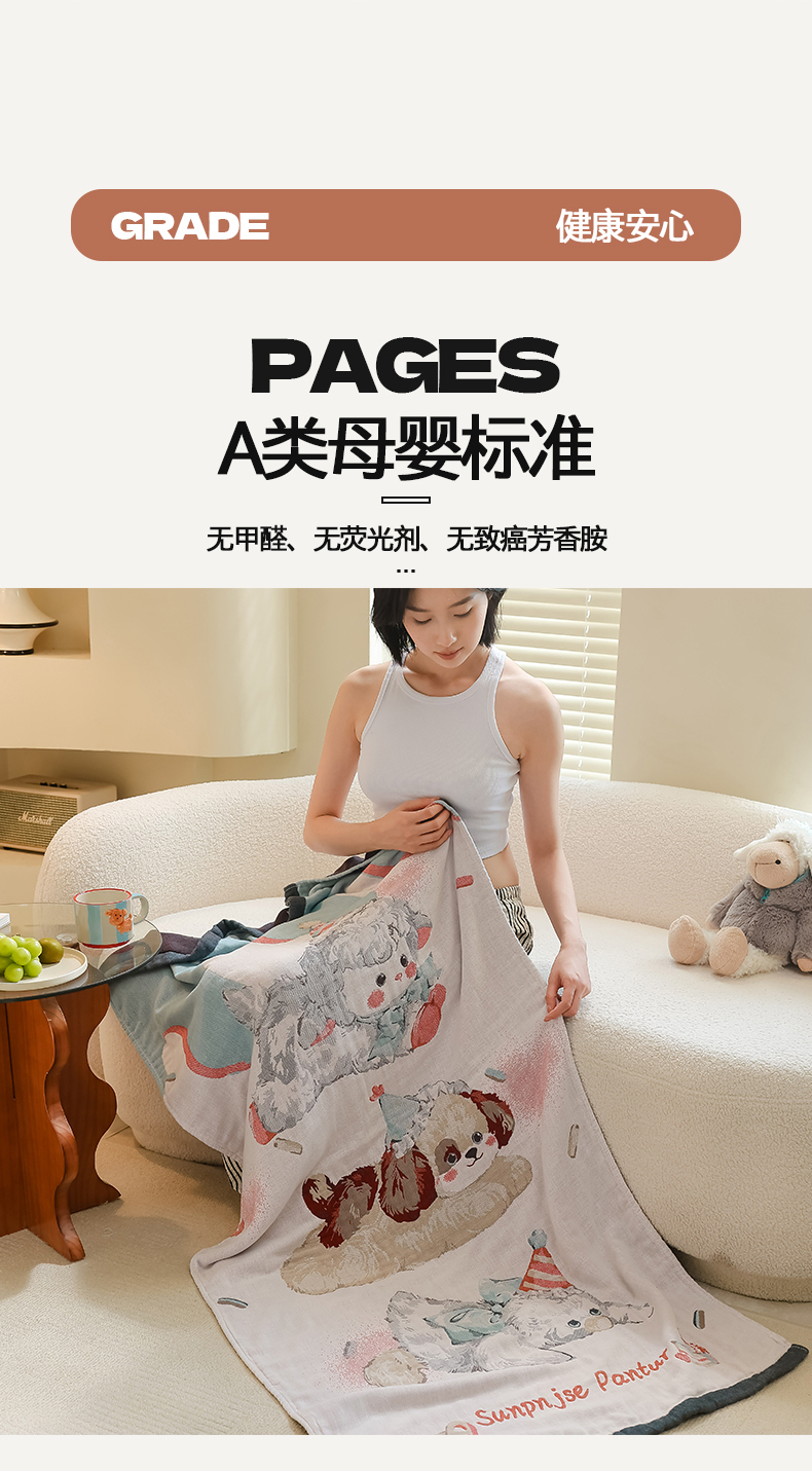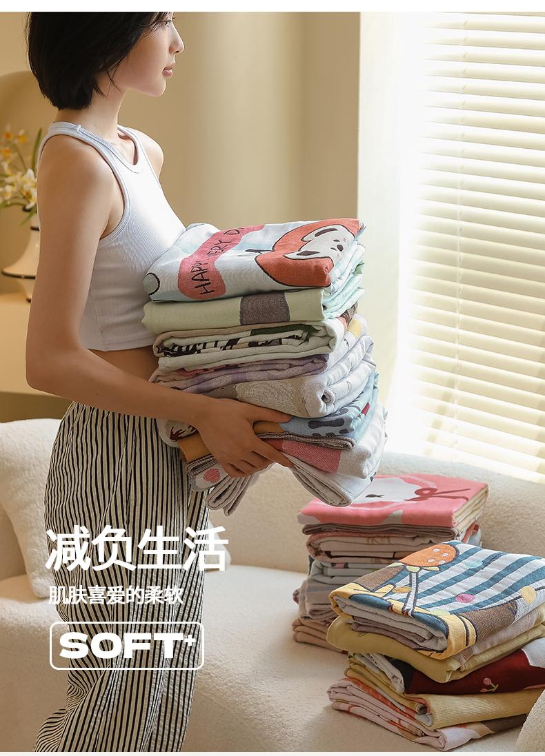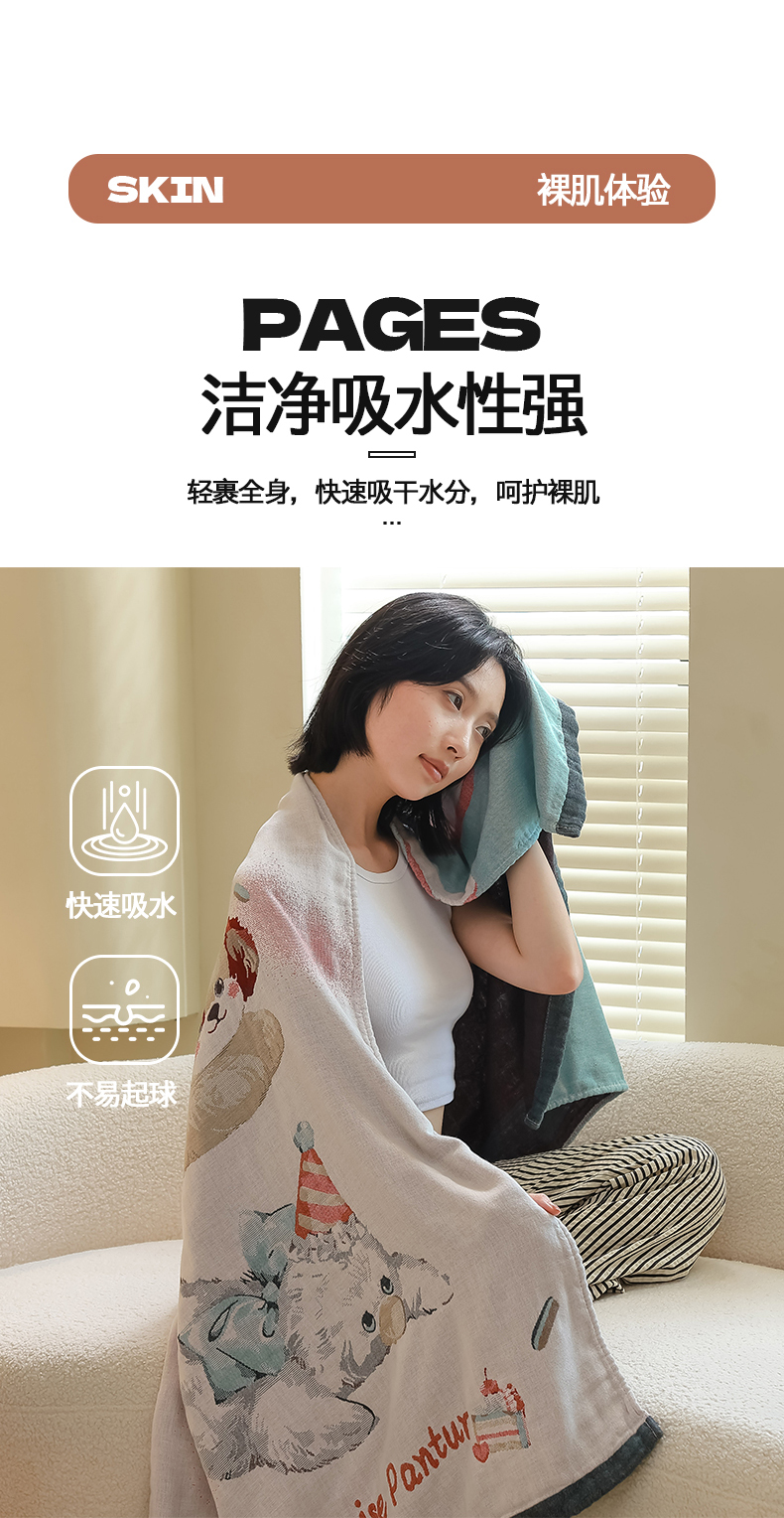 当前位置: 91家纺网 > 商品网购 > 居家日用 > 毛巾/浴巾/浴袍 > 浴巾 > 雯雨家纺 2024新款四层全棉纱布浴巾加大毛巾80*160cm 妙可蓝多
